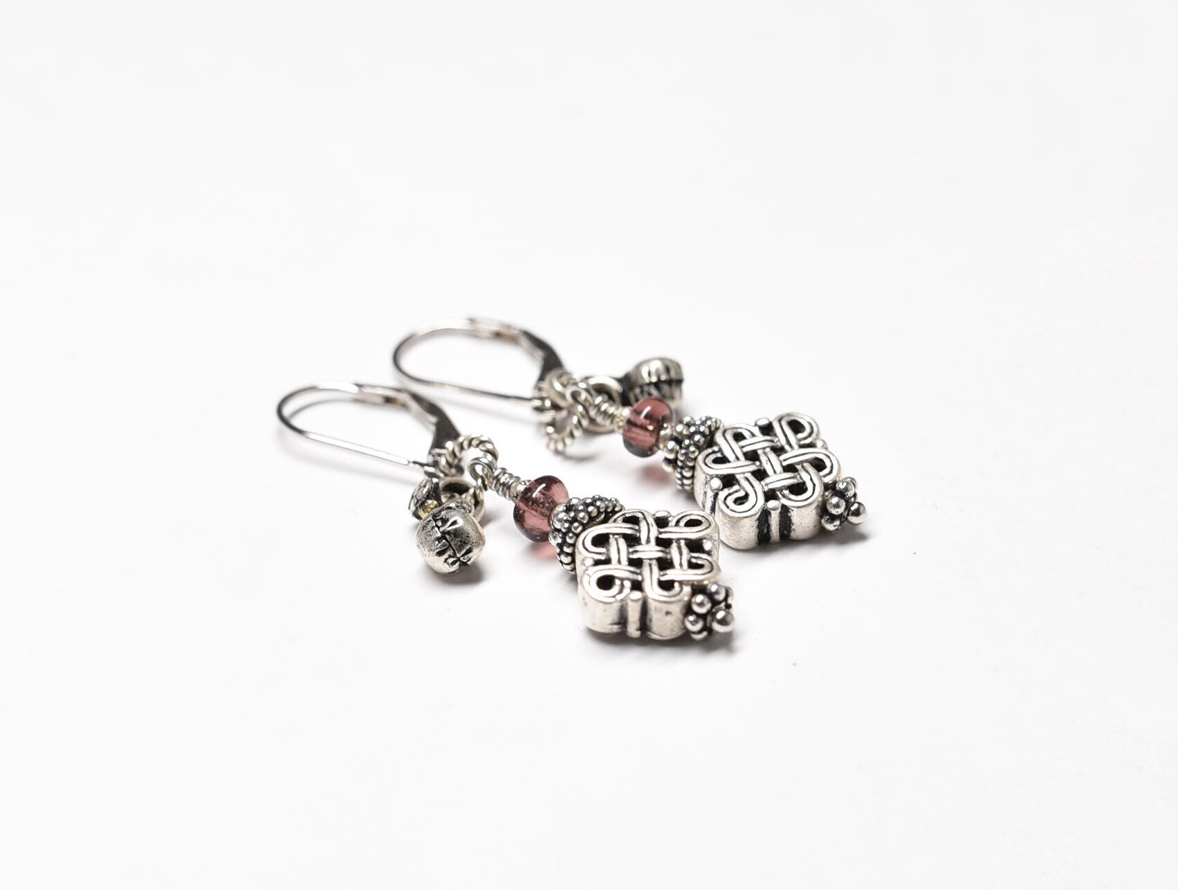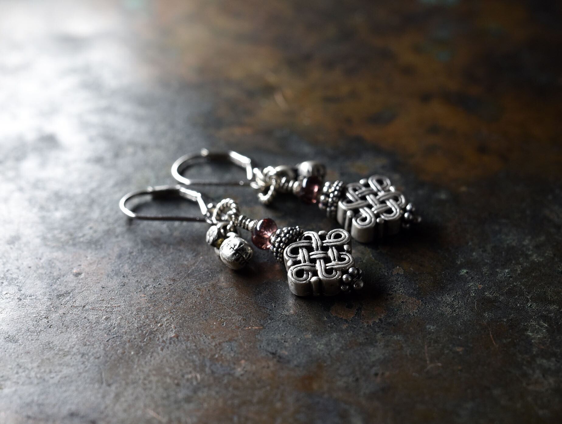 エンドレスノットとパープルアンティークビーズ、インドシルバーの小さな鈴のピアスのピアス