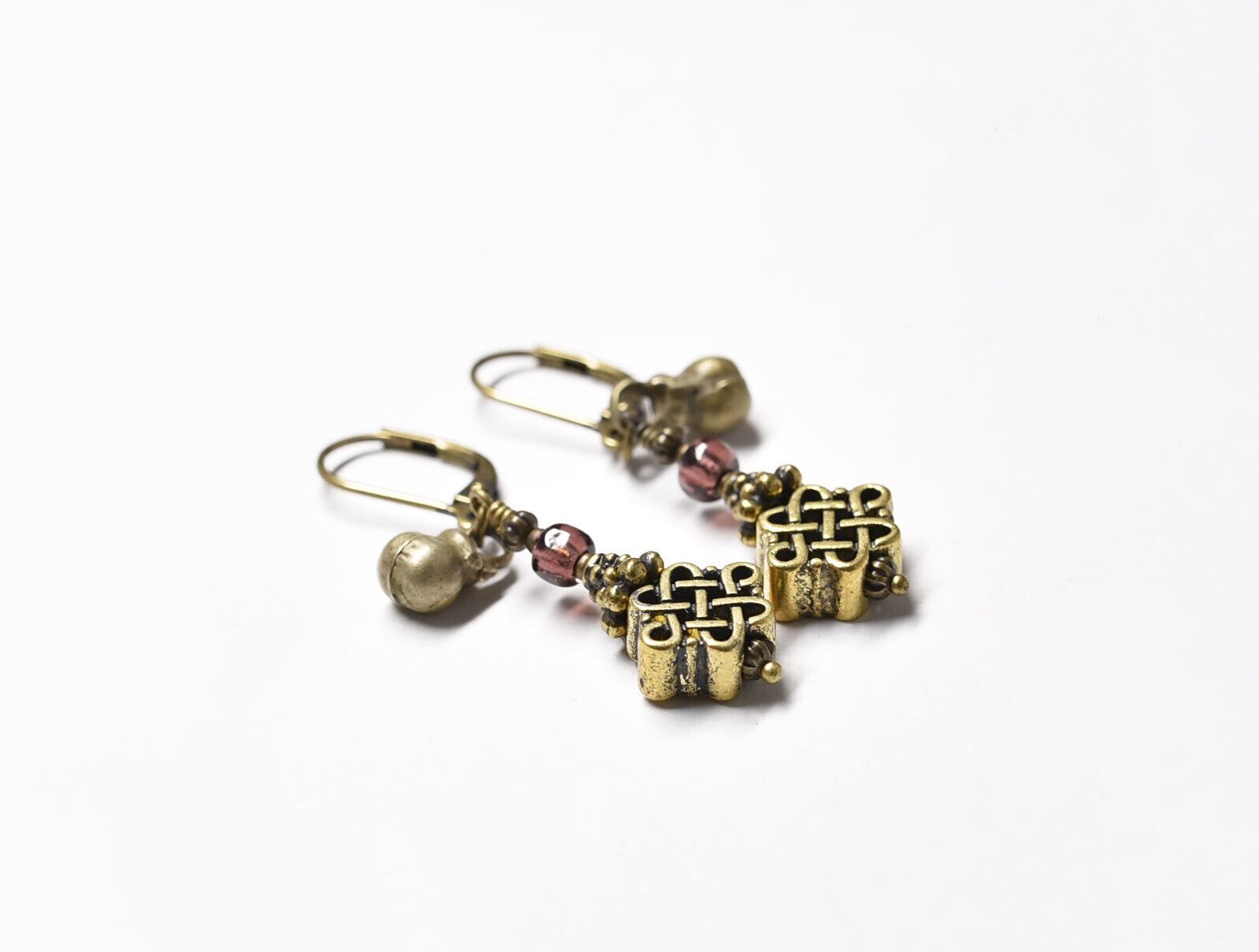 真鍮のエンドレスノットとパープルアンティークビーズ、民族鈴を繋いだピアスです。