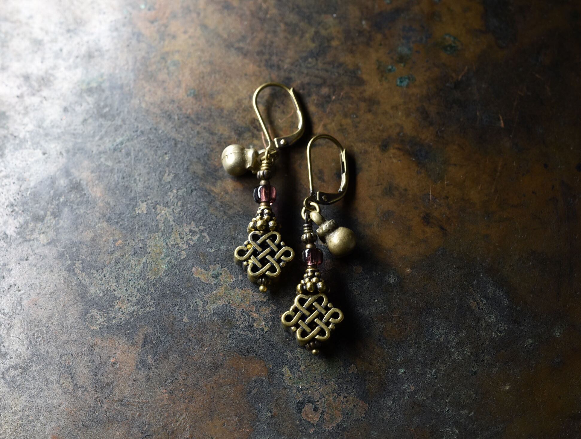 エンドレスノットとパープルアンティークビーズ、民族鈴のピアス