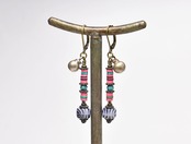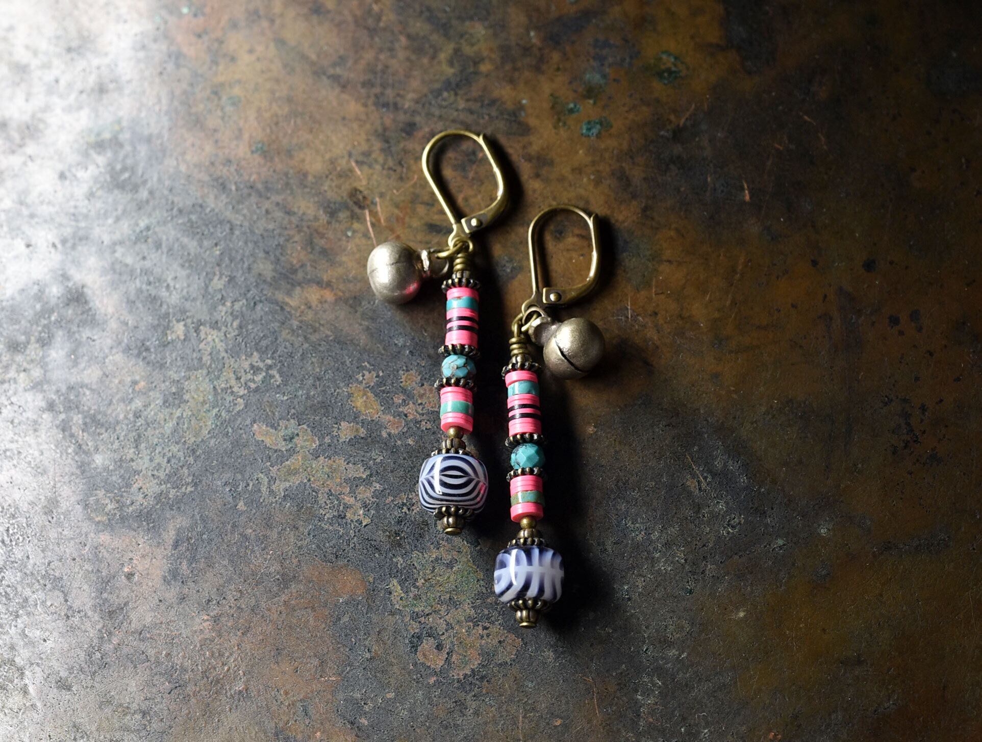 レコード盤とゼブラ柄ヴィンテージビーズ、ターコイズ、民族鈴を繋いだピアスです。