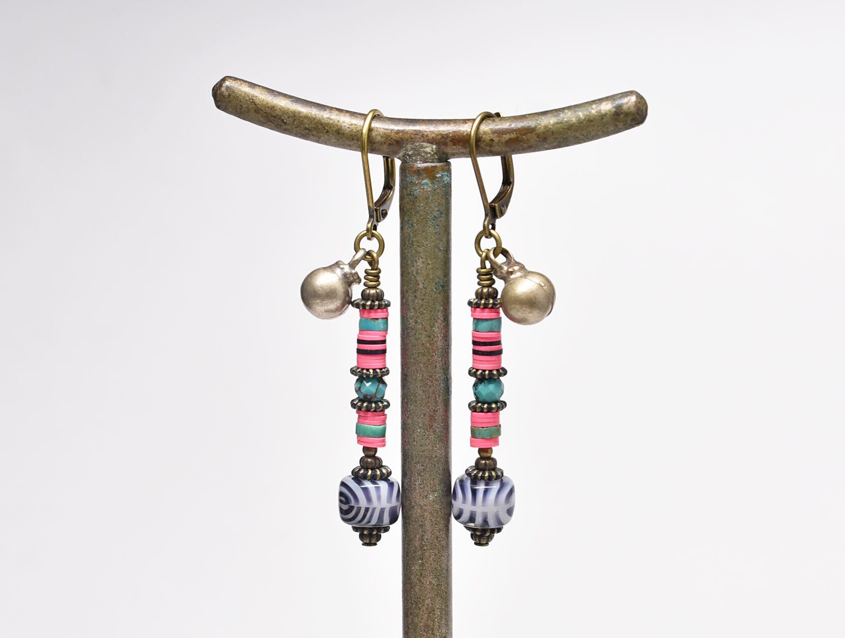 ショッキングピンクレコード盤とゼブラ柄ヴィンテージビーズ、ターコイズ、民族鈴のピアス