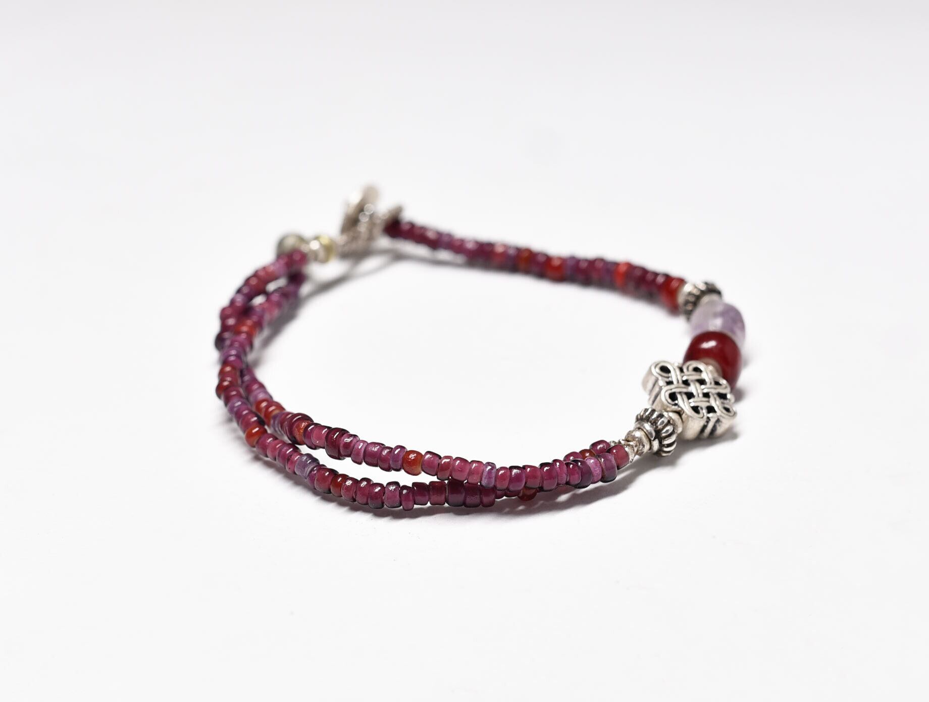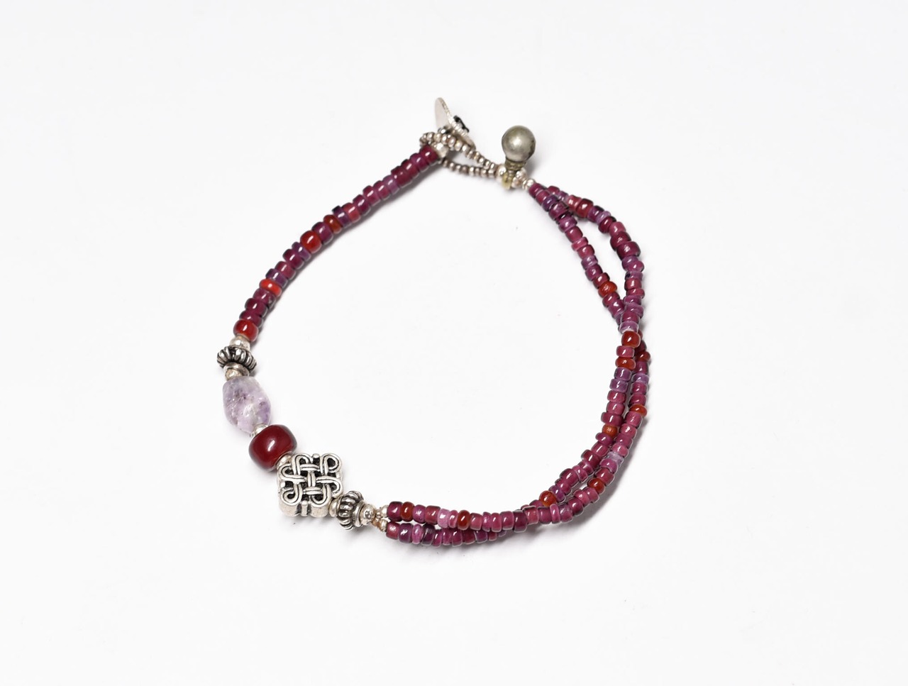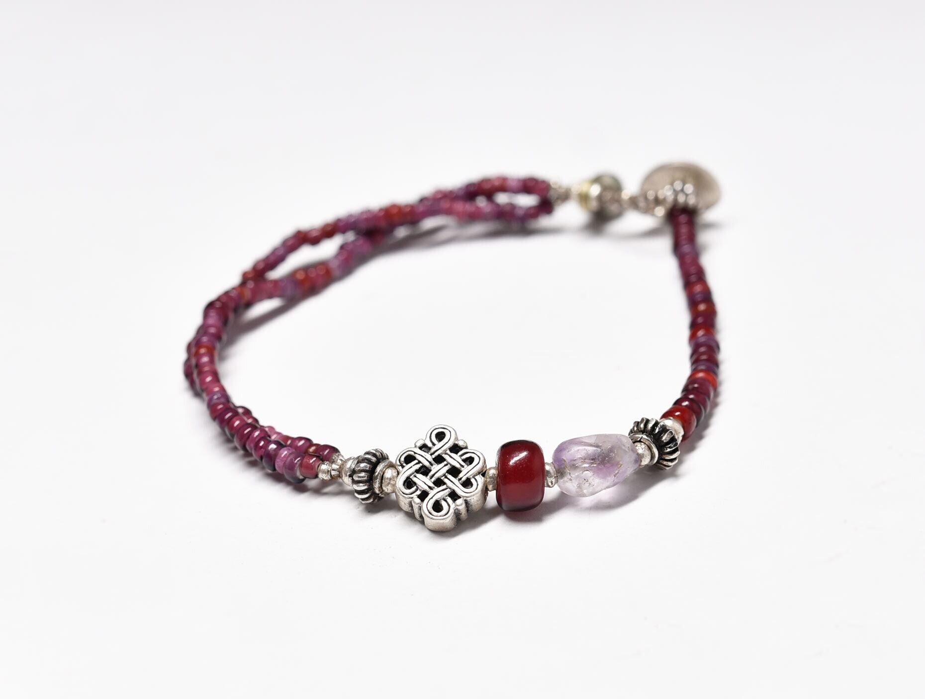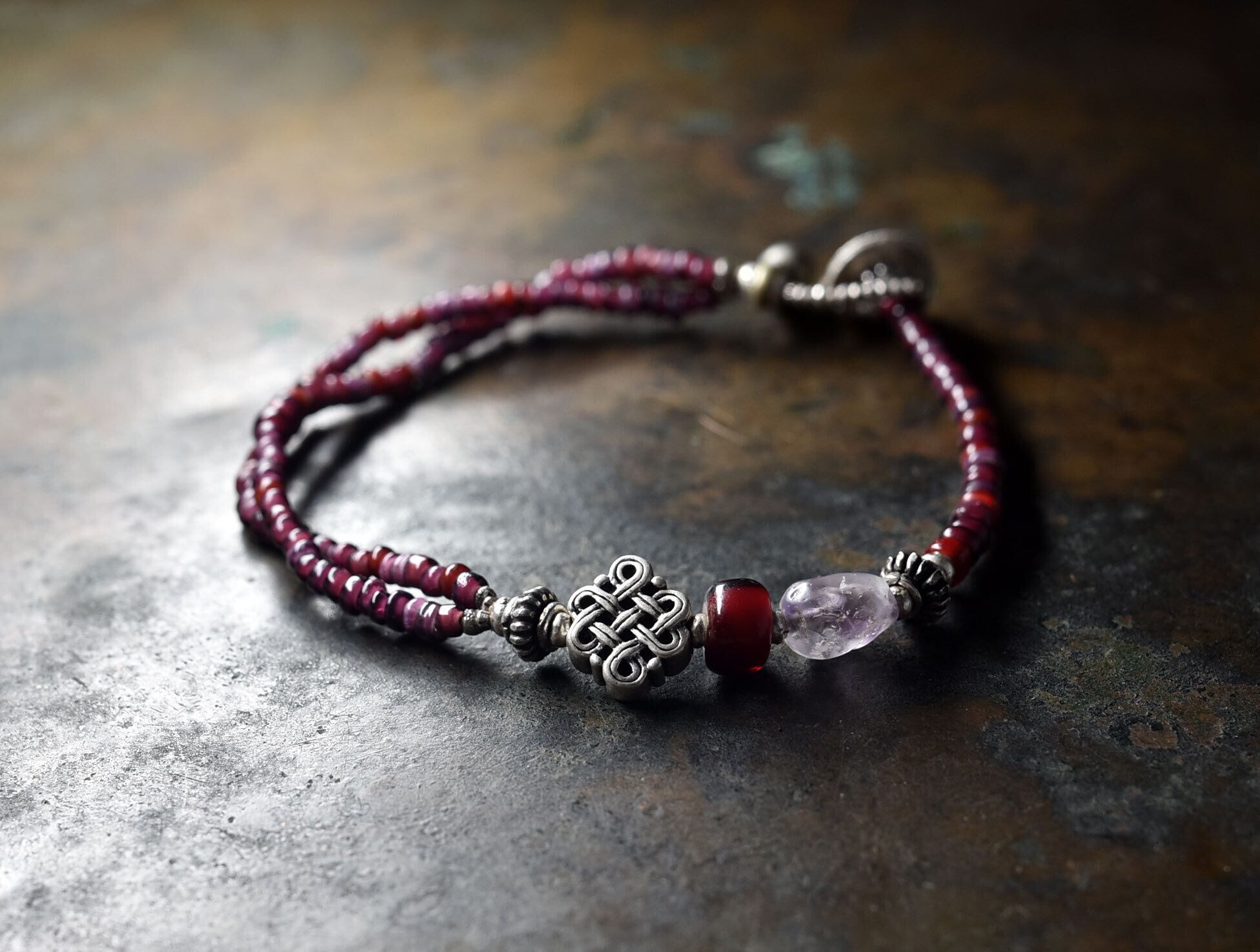 エンドレスノットと古代アメジスト、血赤色と葡萄色ホワイトハーツなどを繋いだブレスです。