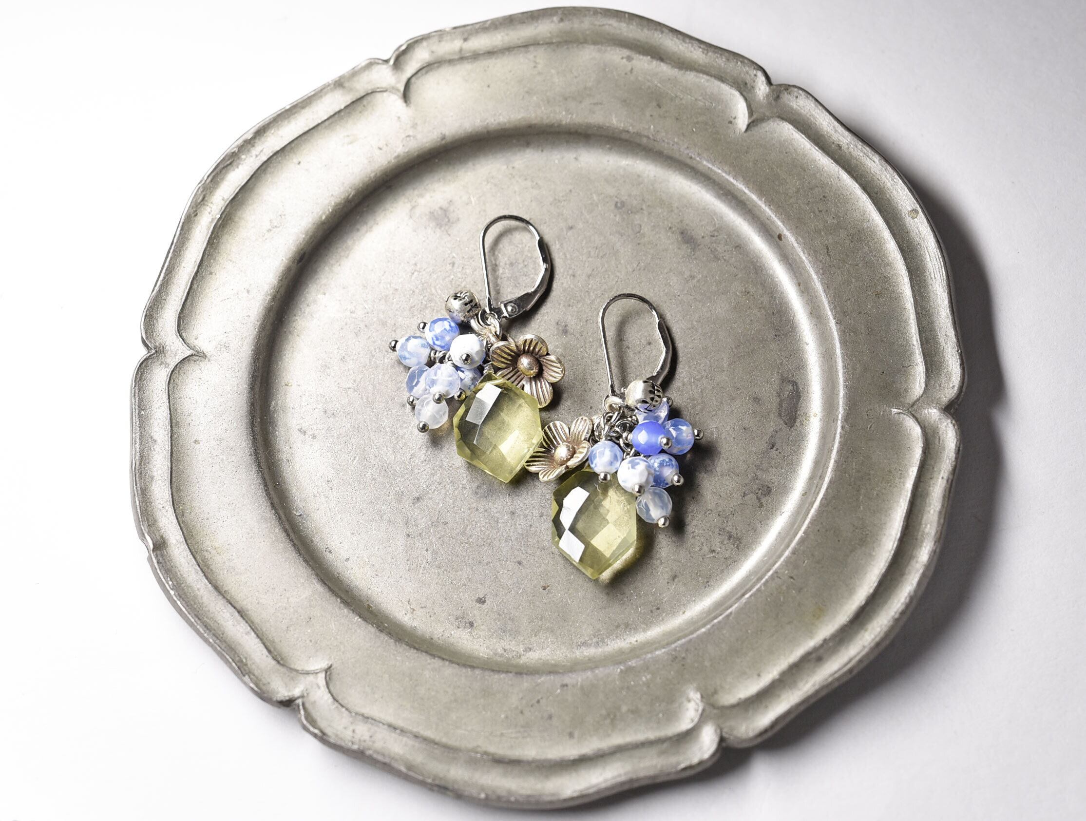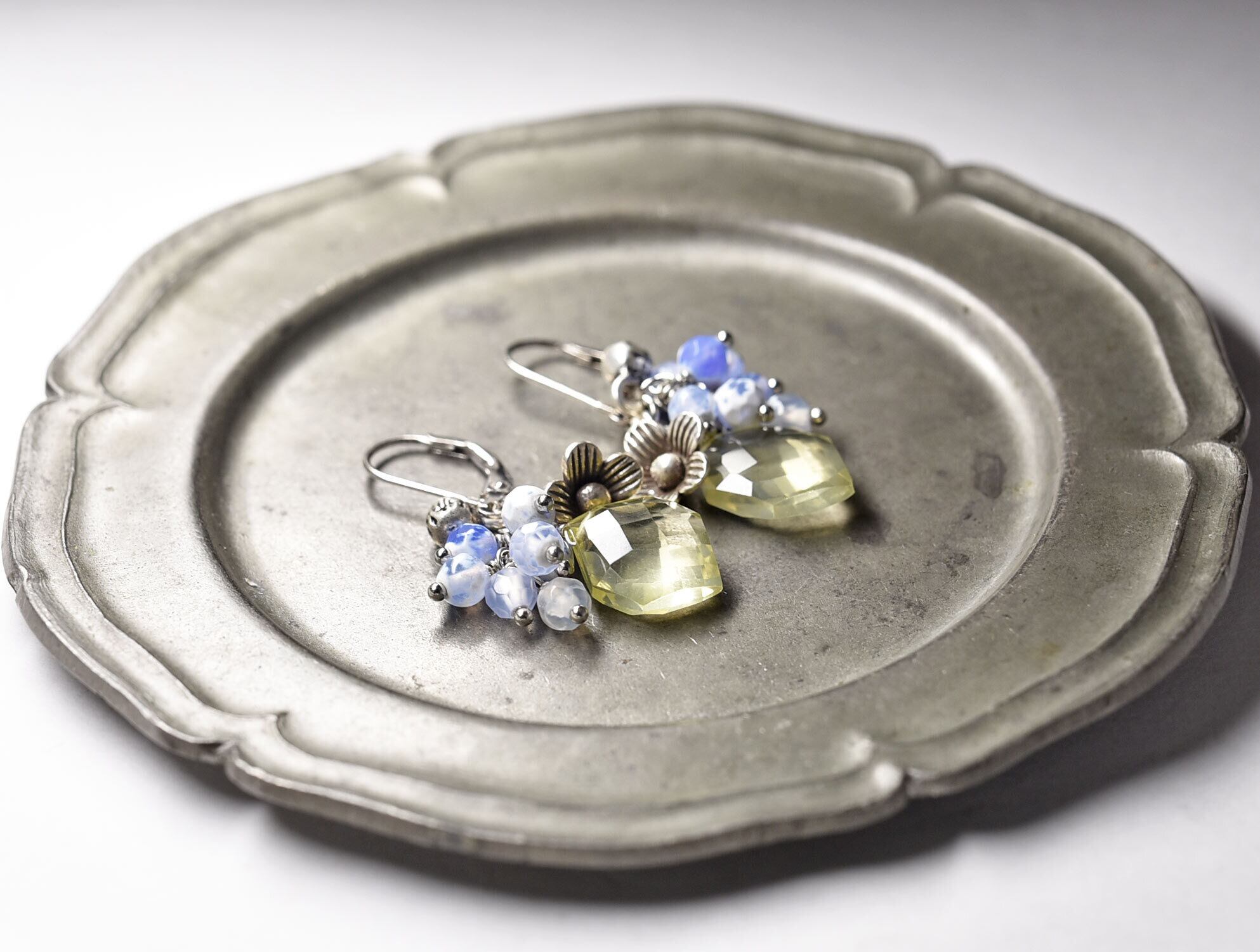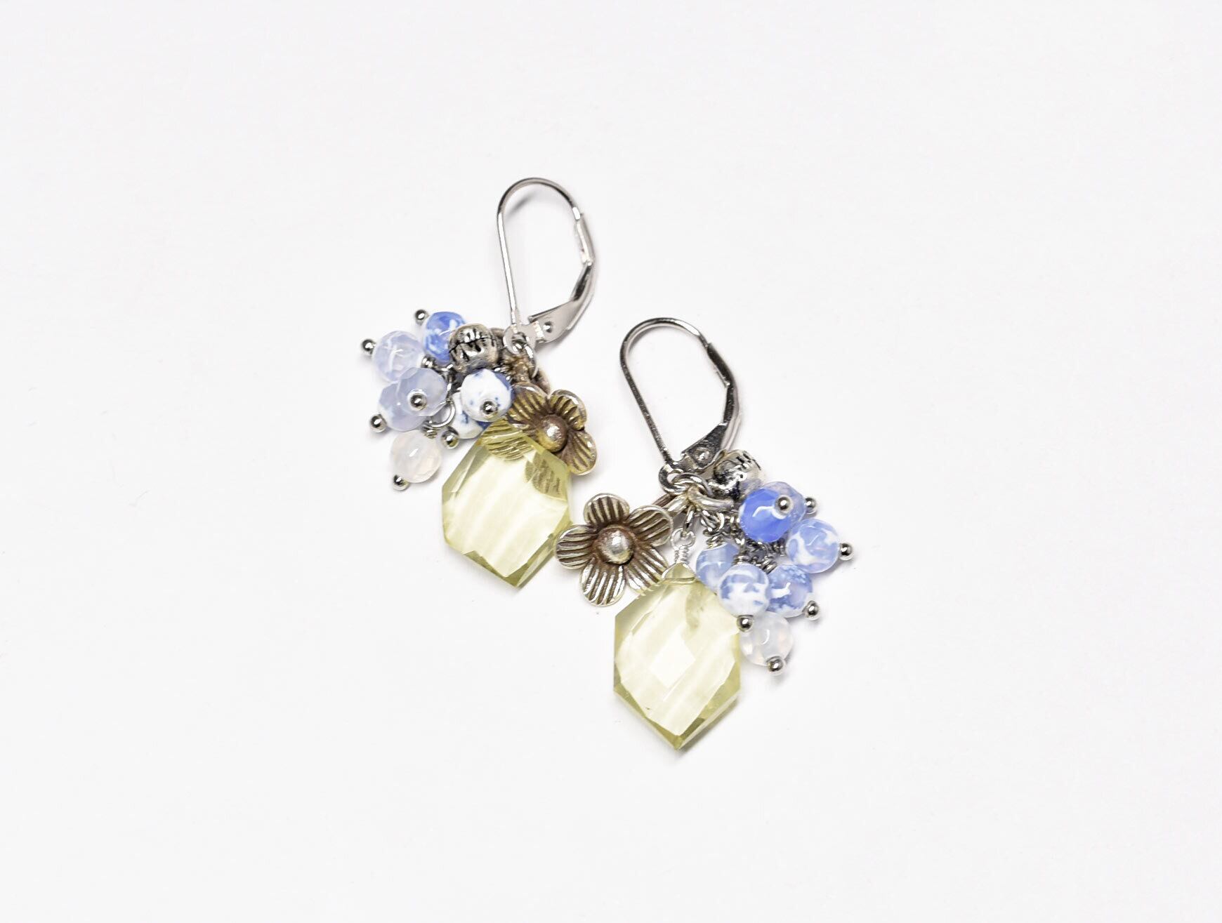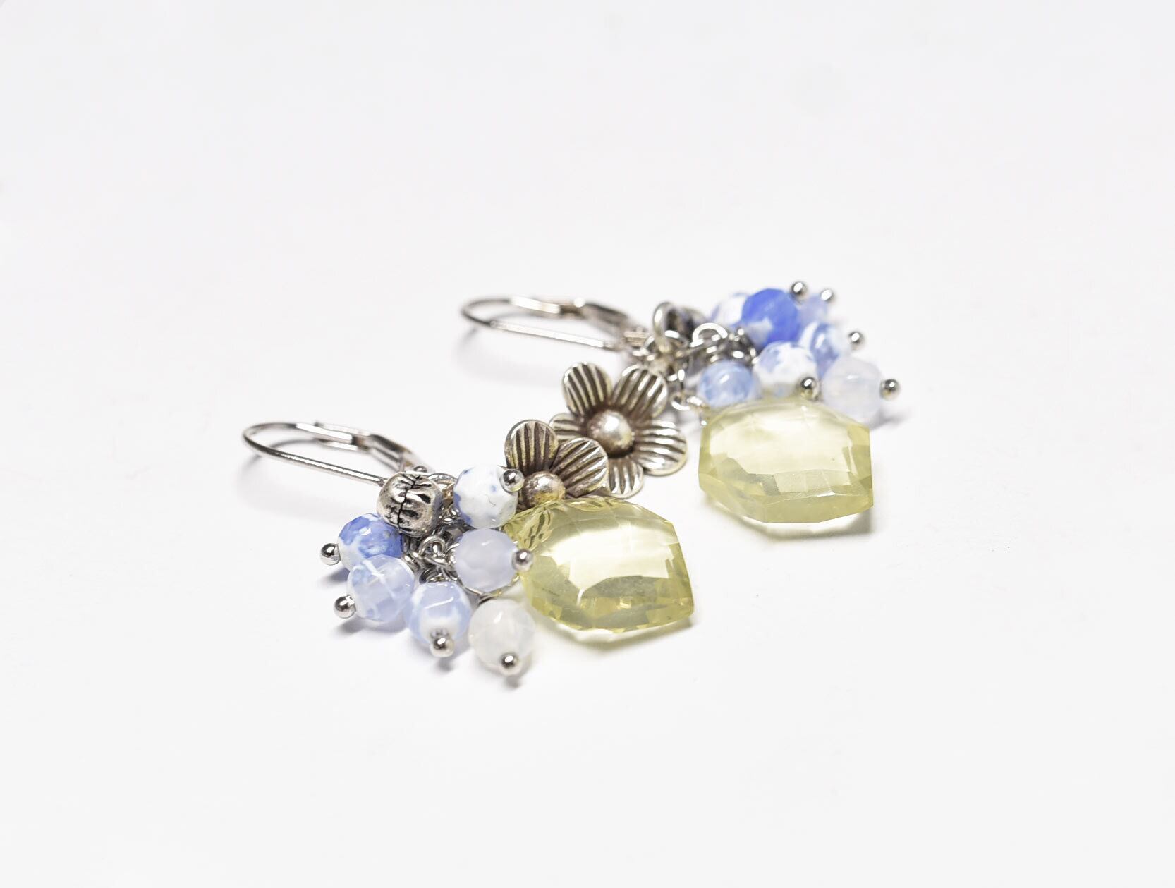 レモンクォーツとたわわなブルー瑪瑙、カレンシルバーのお花と小さな鈴のピアス