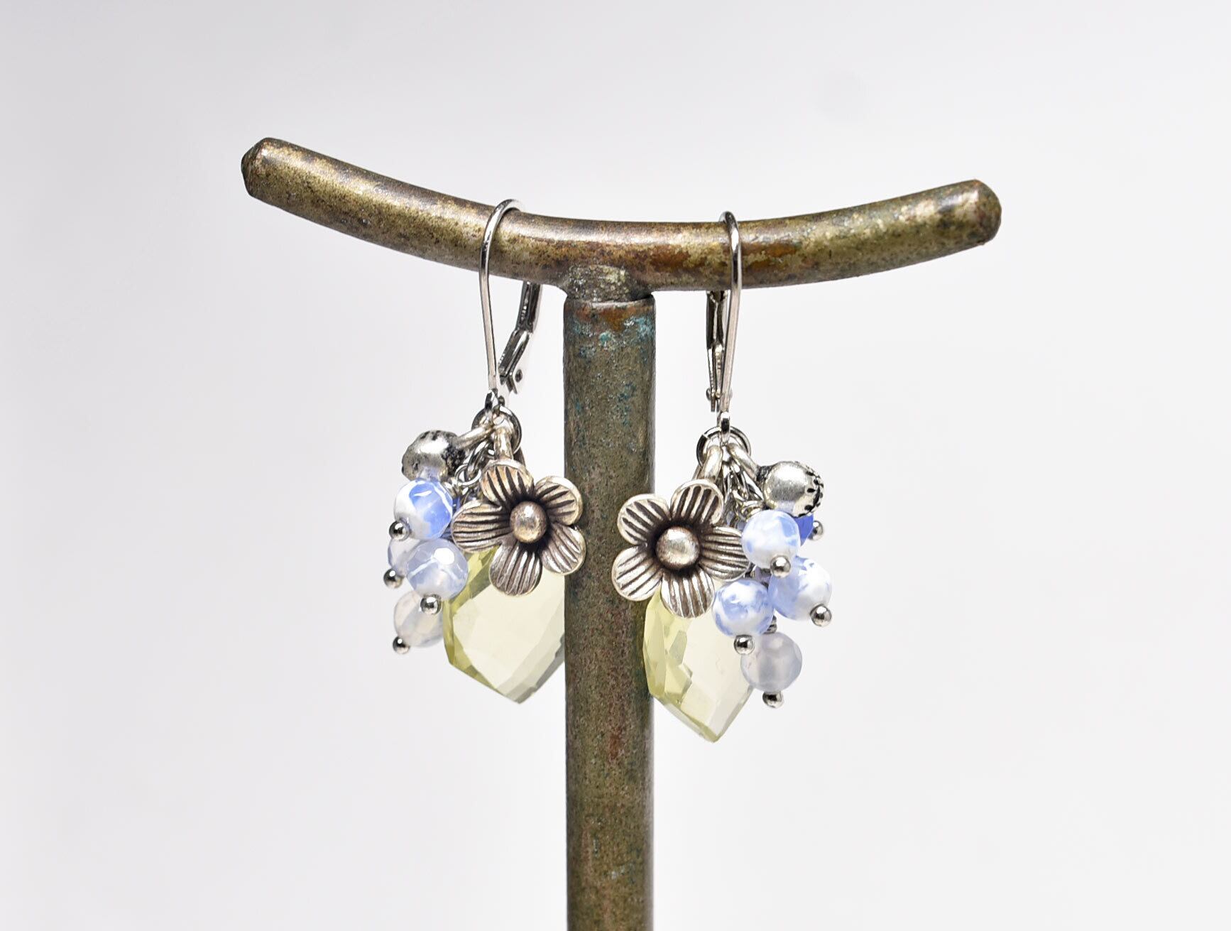 レモンクォーツとたわわなブルー瑪瑙、カレンシルバーのお花と小さな鈴を繋いだピアです。