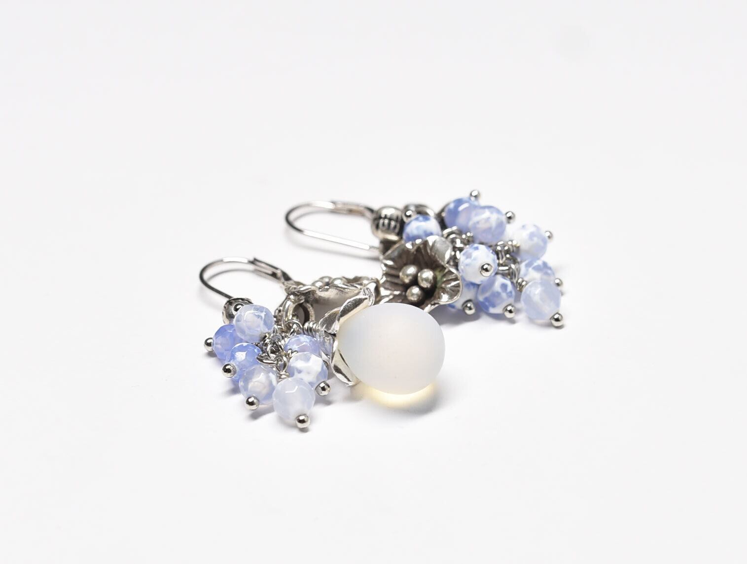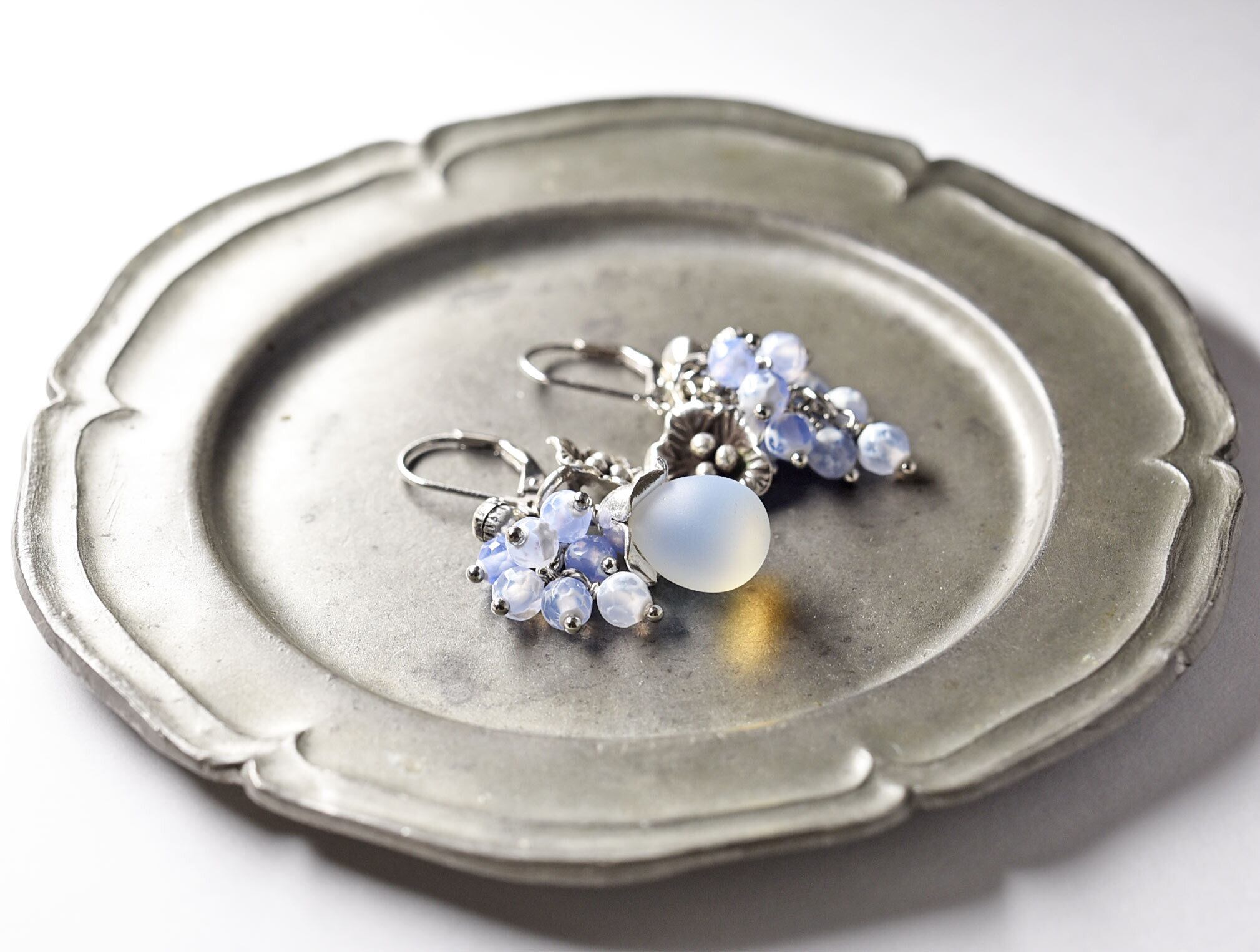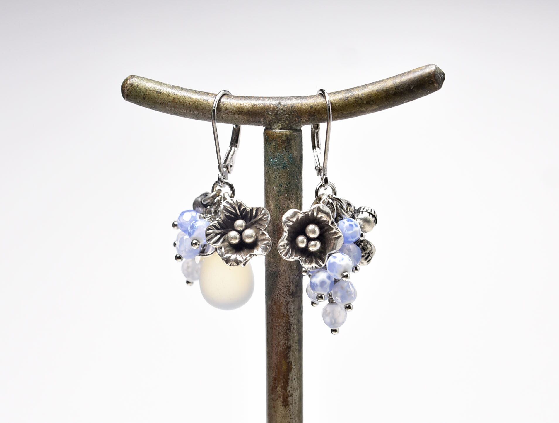 ウエディングビーズとたわわなブルー瑪瑙、お花のカレンシルバー小さな鈴を繋いだピアスです。