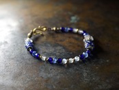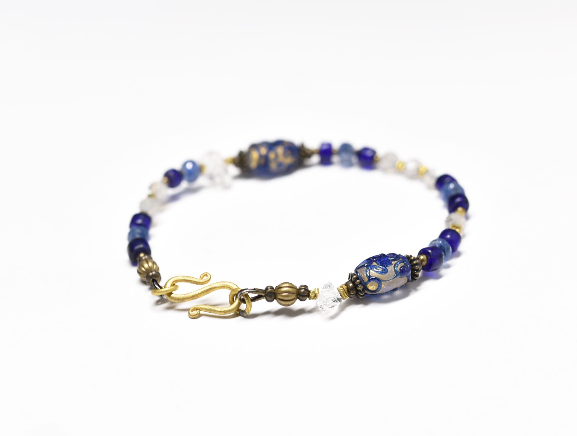 アンティーク瑠璃色トレイルデコレーションの金箔装飾ビーズと瑠璃色ビーズ、ラブラドライト、カイヤナイトのブレス