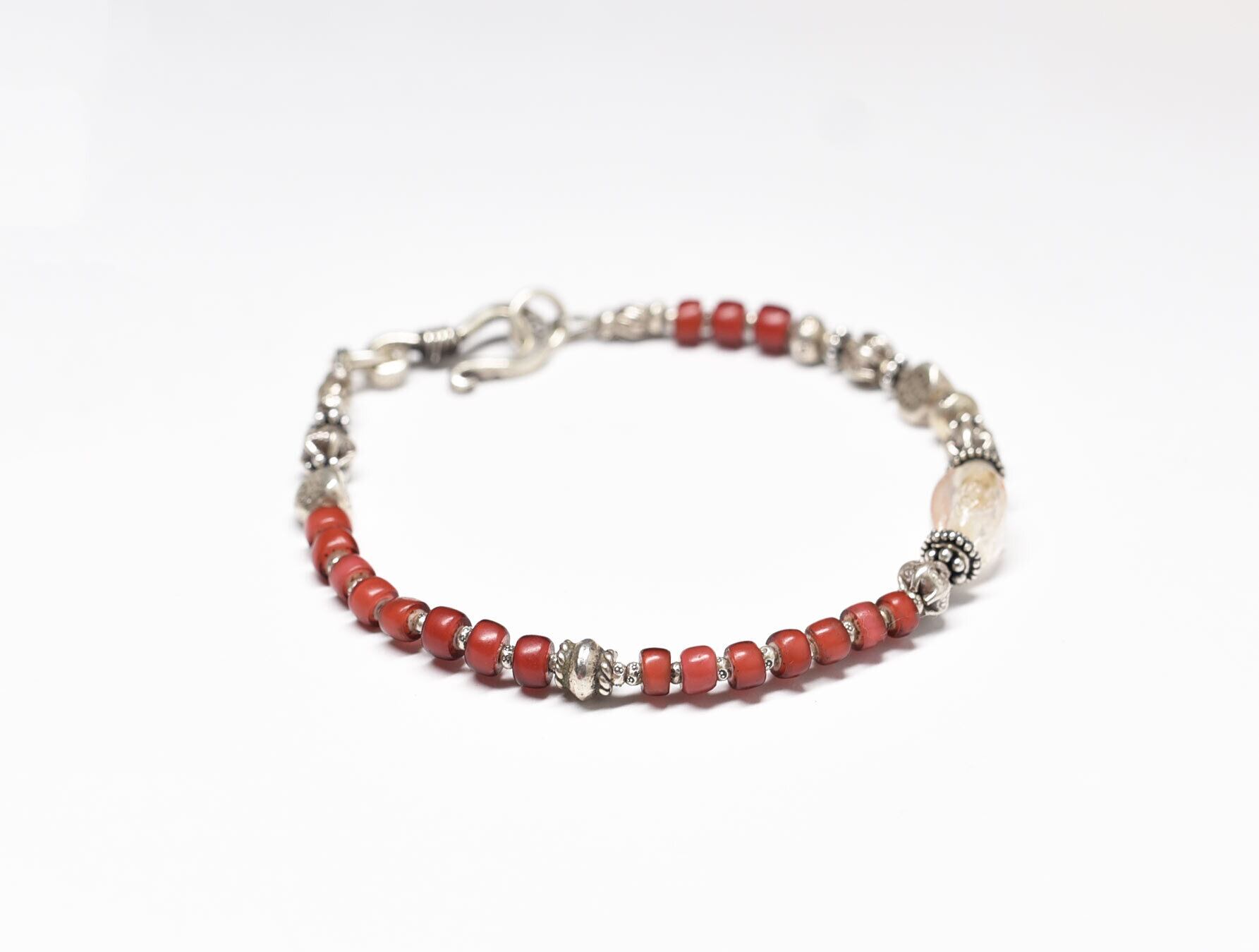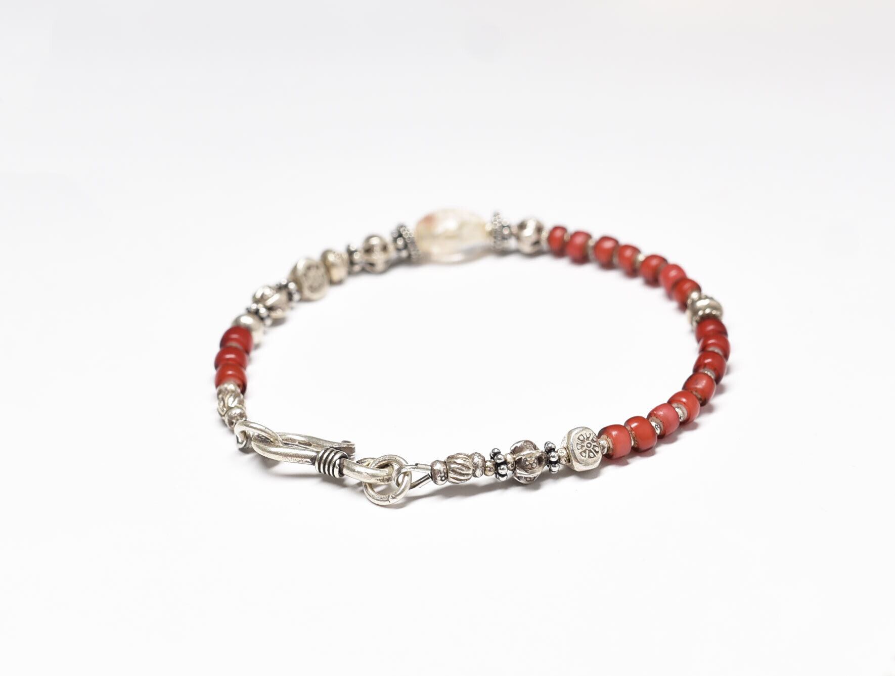 oldチベタンターコイズと金赤ホワイトハーツ、様々なカレンシルバーを繋いだブレスです。