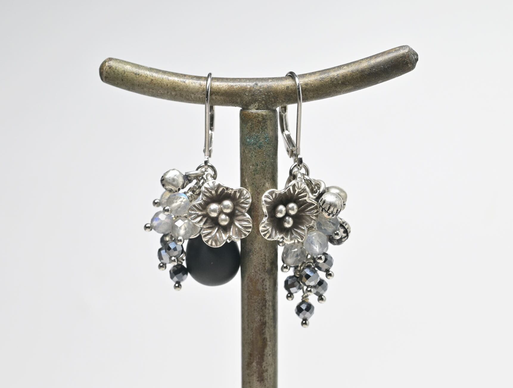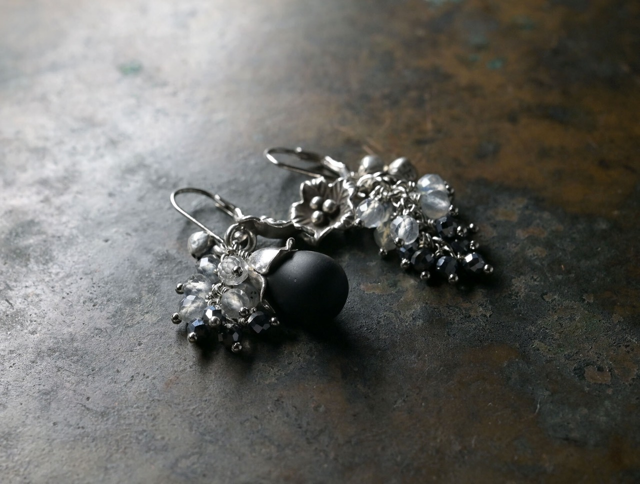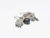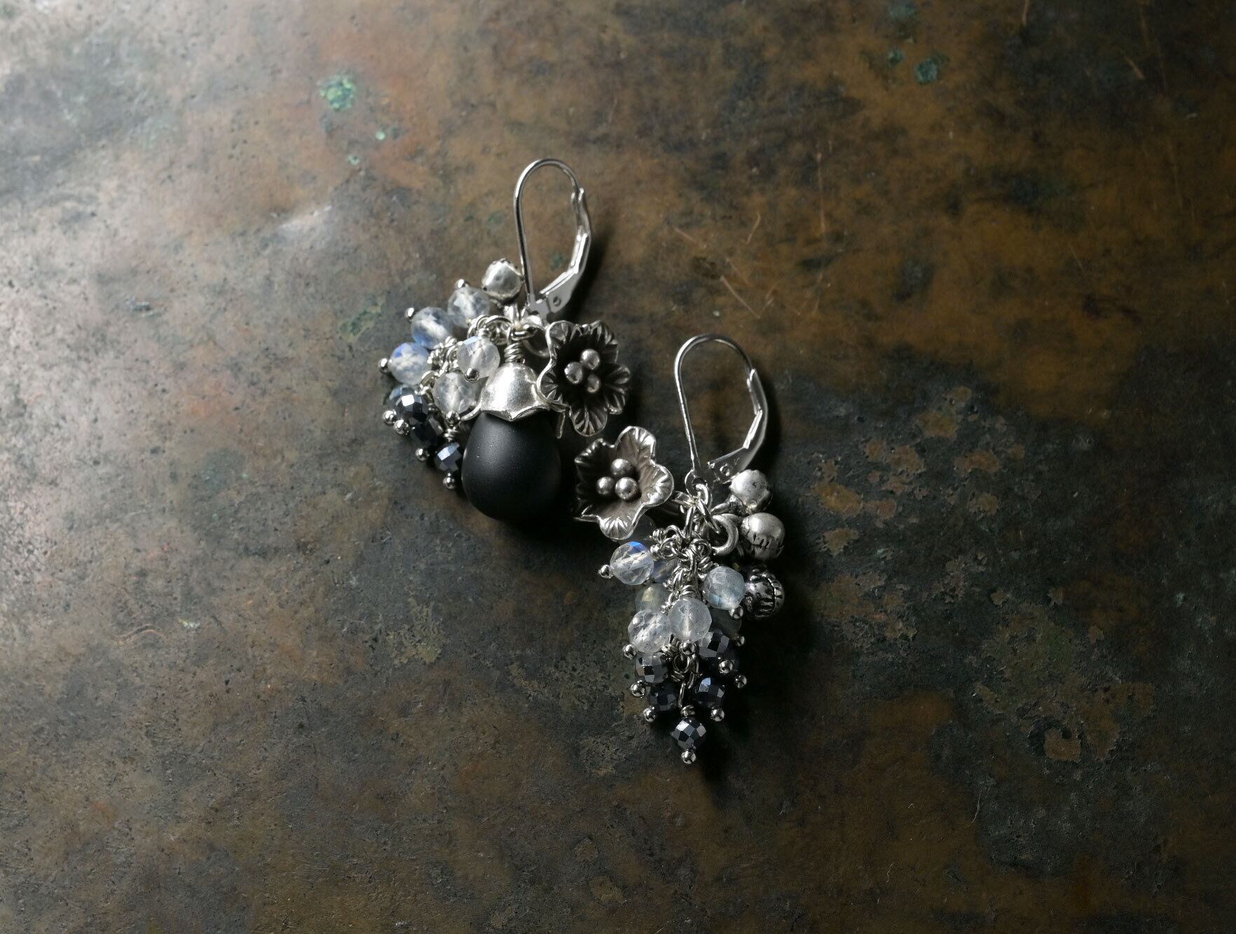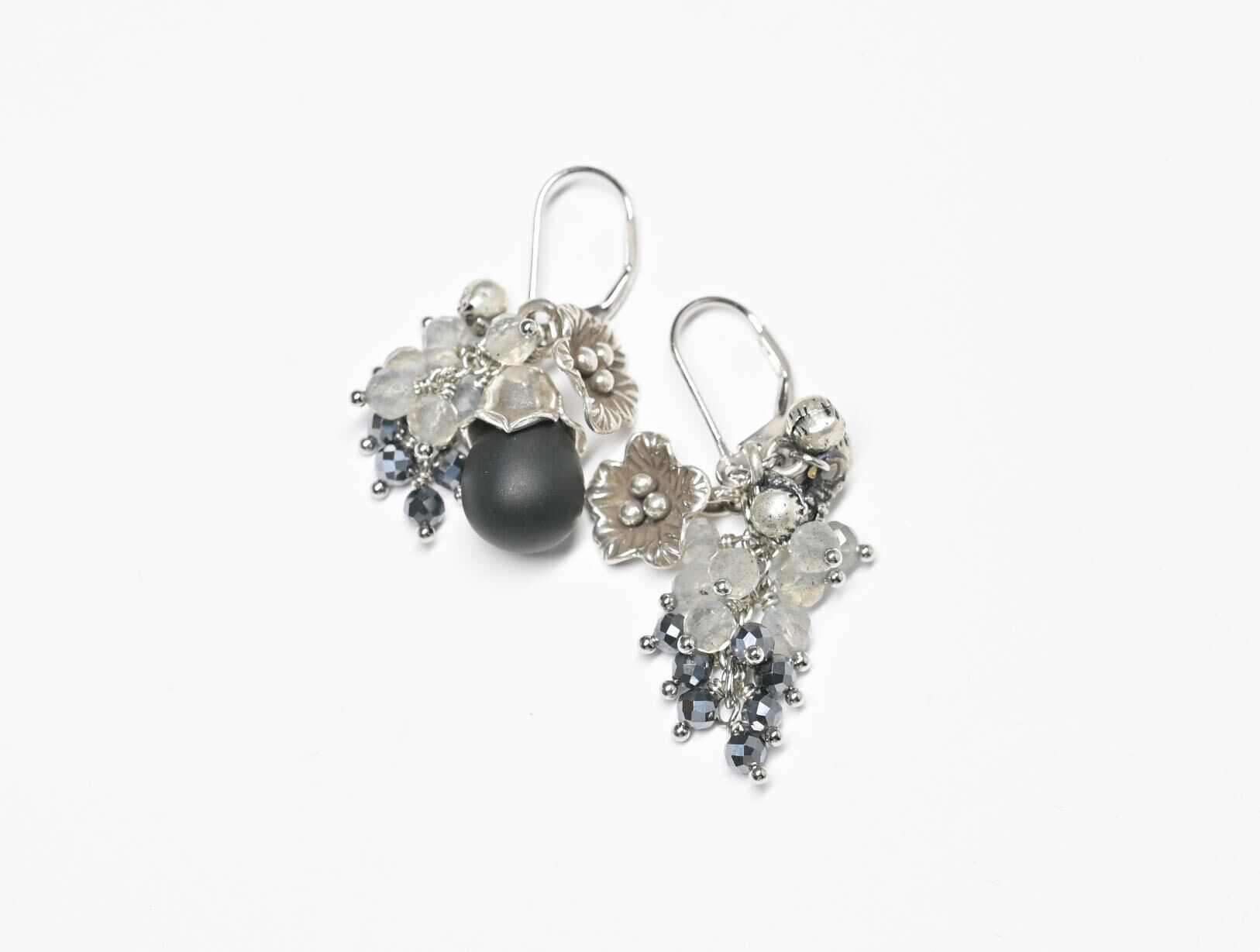 漆黒ウエディングビーズとたわわなラブラドライトとテラヘルツ、お花カレンシルバーと小さな鈴のアンシメトリーピアス