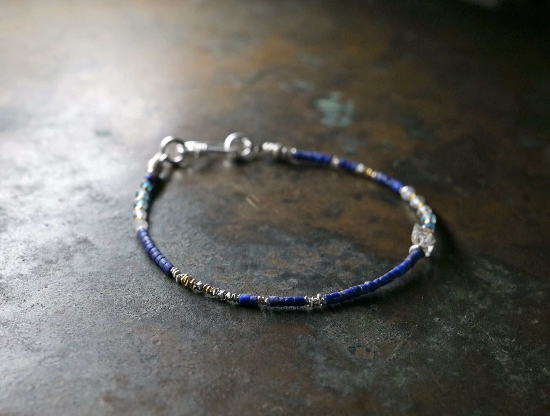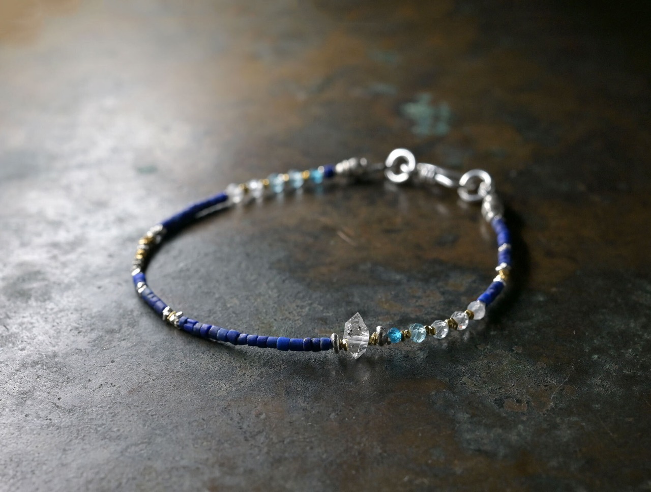 ラピスと、アパタイトなどの小さな天然石、ハーキマーダイヤモンド、カレンシルバーを繋いだ華奢なブレスです。