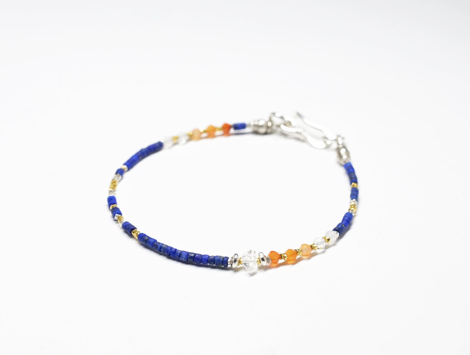 ラピスと、カーネリアンなどの小さな天然石、ハーキマーダイヤモンド、カレンシルバーを繋いだ華奢なブレスです。