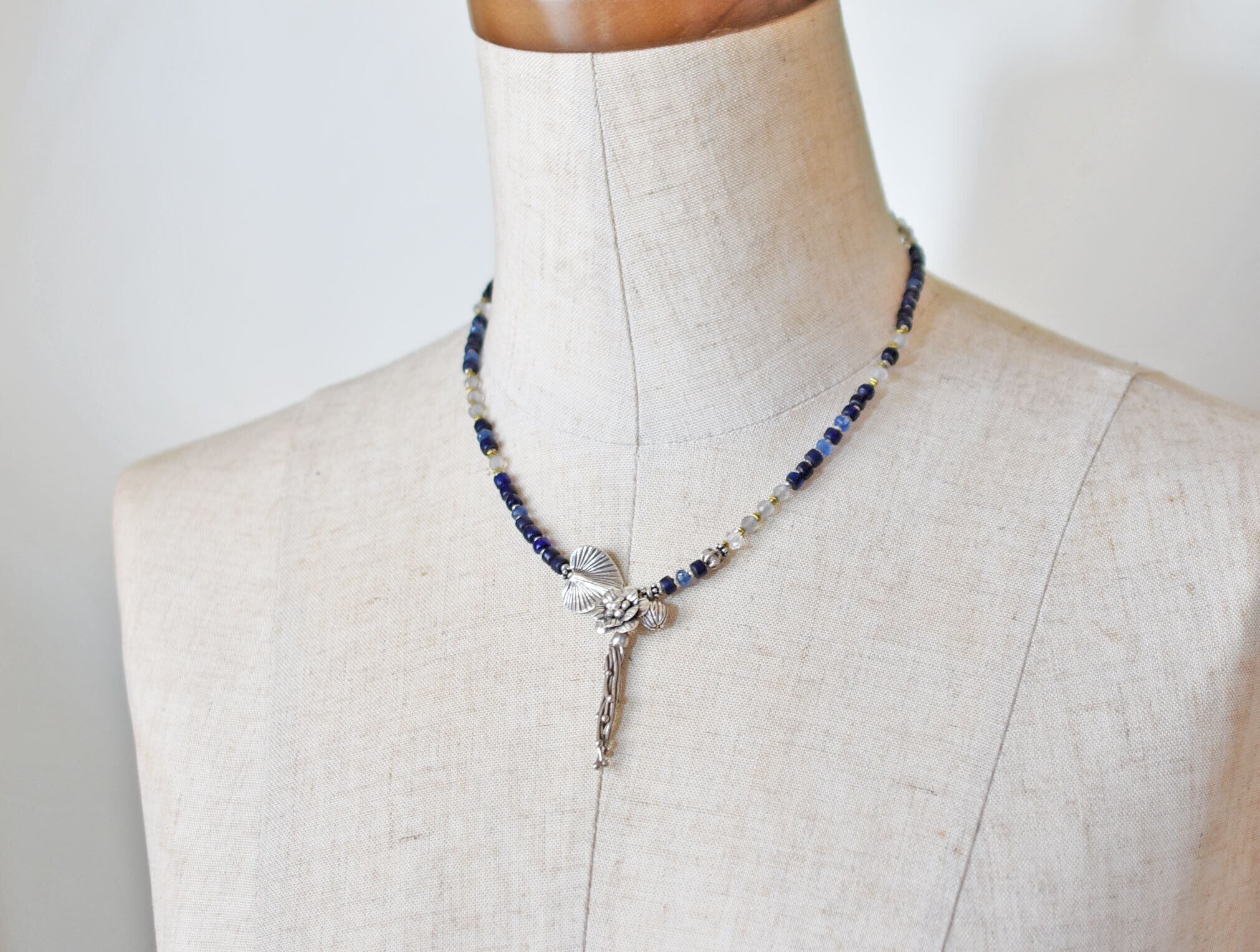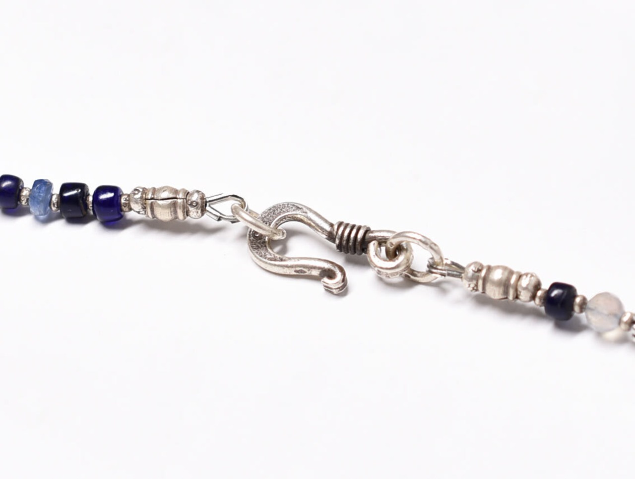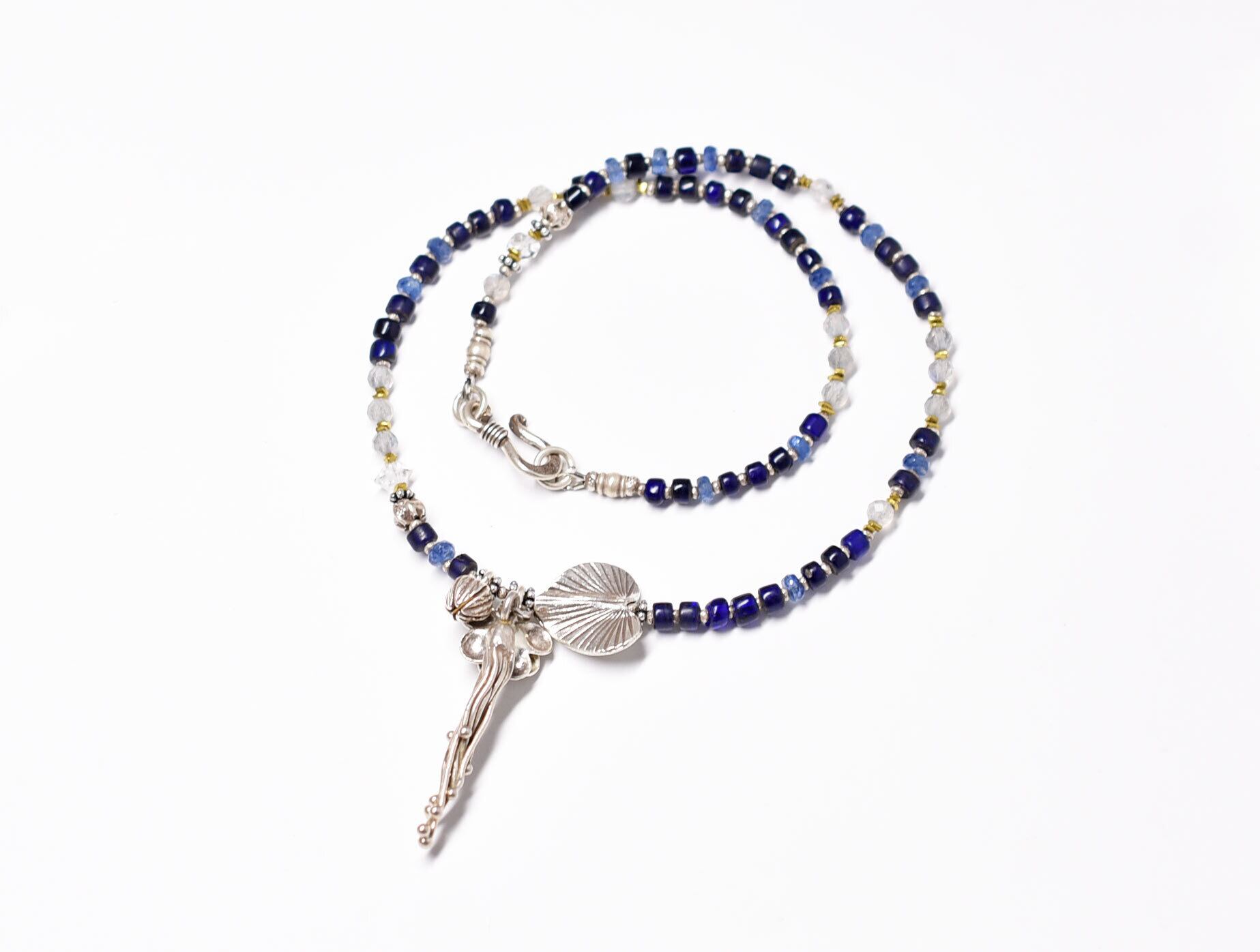 ボタニカルなカレンシルバーと瑠璃色アンティークビーズ、ラブラドライトとカイヤナイト、ハーキマーダイヤモンドなどを繋いだネックレスです。