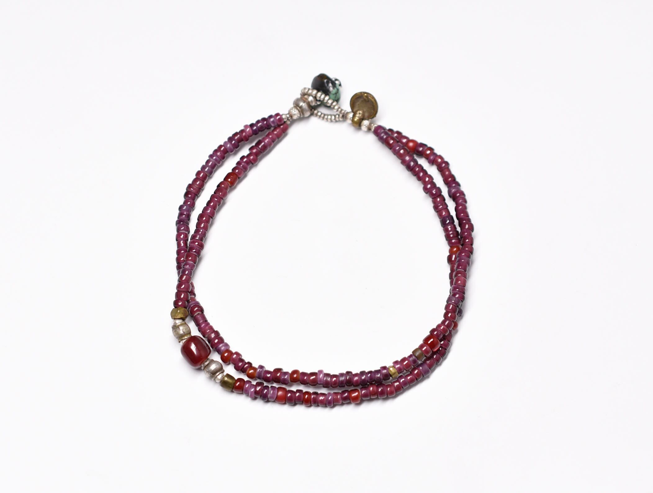 濃淡のある紫色や赤色のビーズはホワイトハーツと呼ばれるアンティークビーズです。