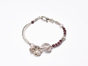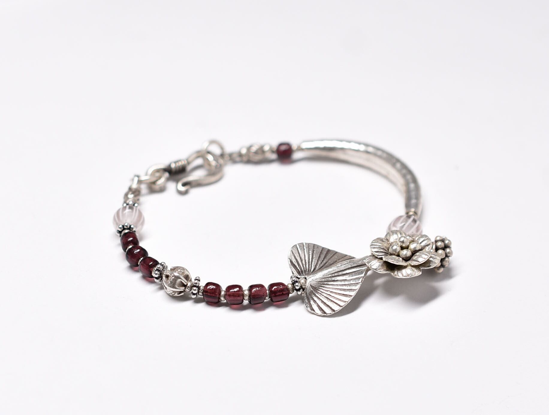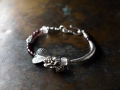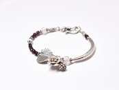 お花と蕾、ハート型の葉っぱ、湾曲カレンシルバーとグーズベリー、パープルアンティークビーズを繋いだブレスです。