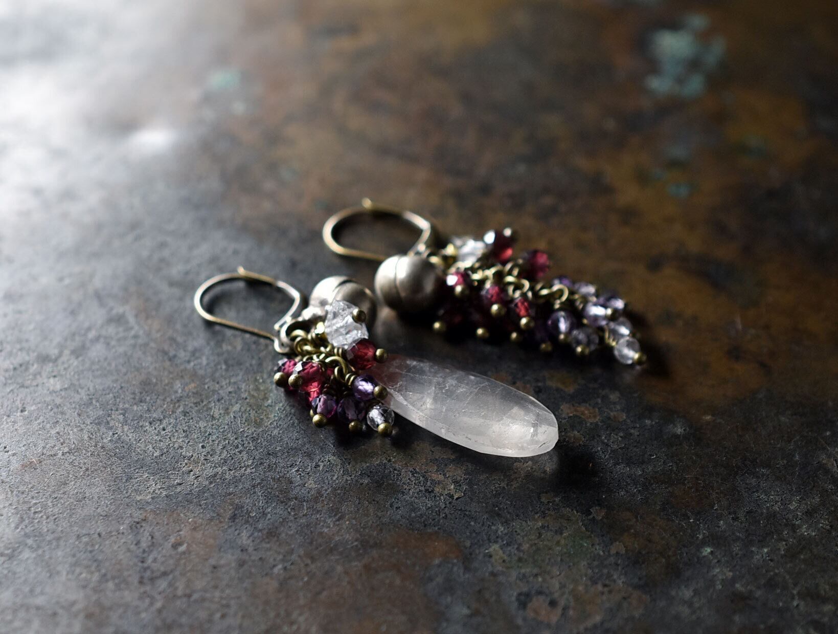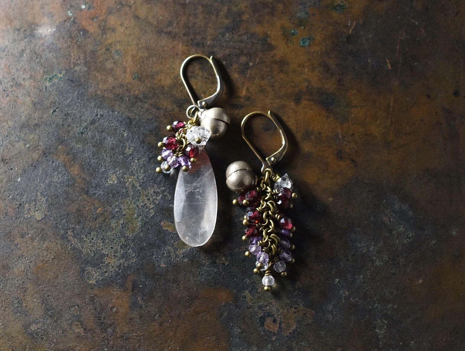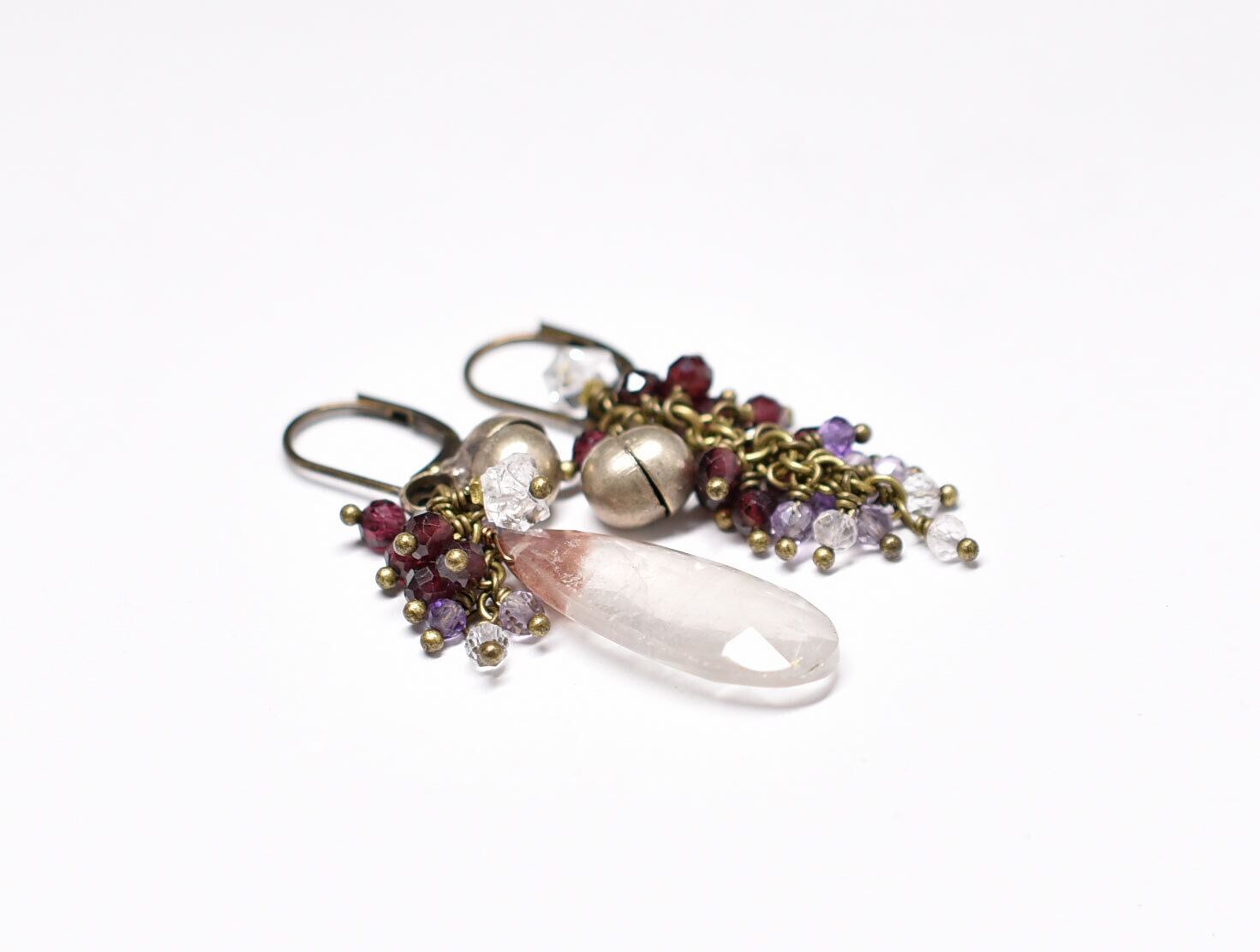 アゲートインクォーツとたわわなガーネット、アメジスト、クォーツ、ハーキマーダイヤモンドと民族鈴のアンシメトリーピアス
