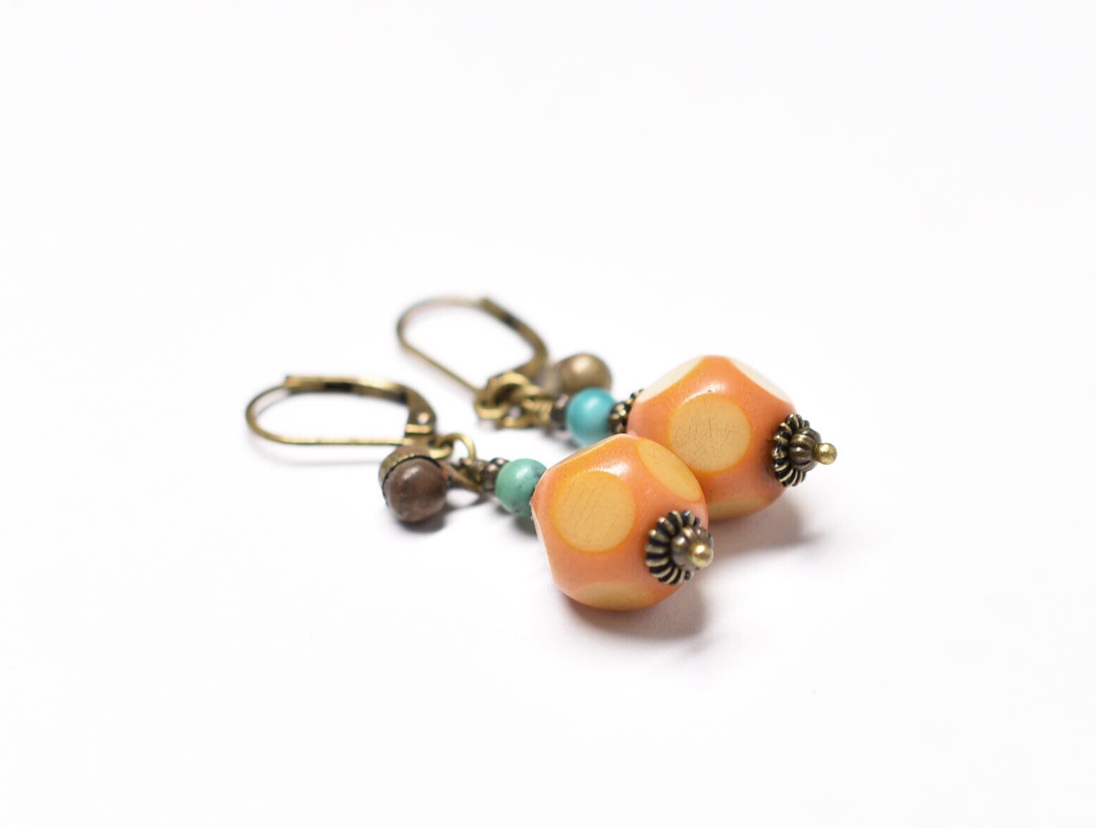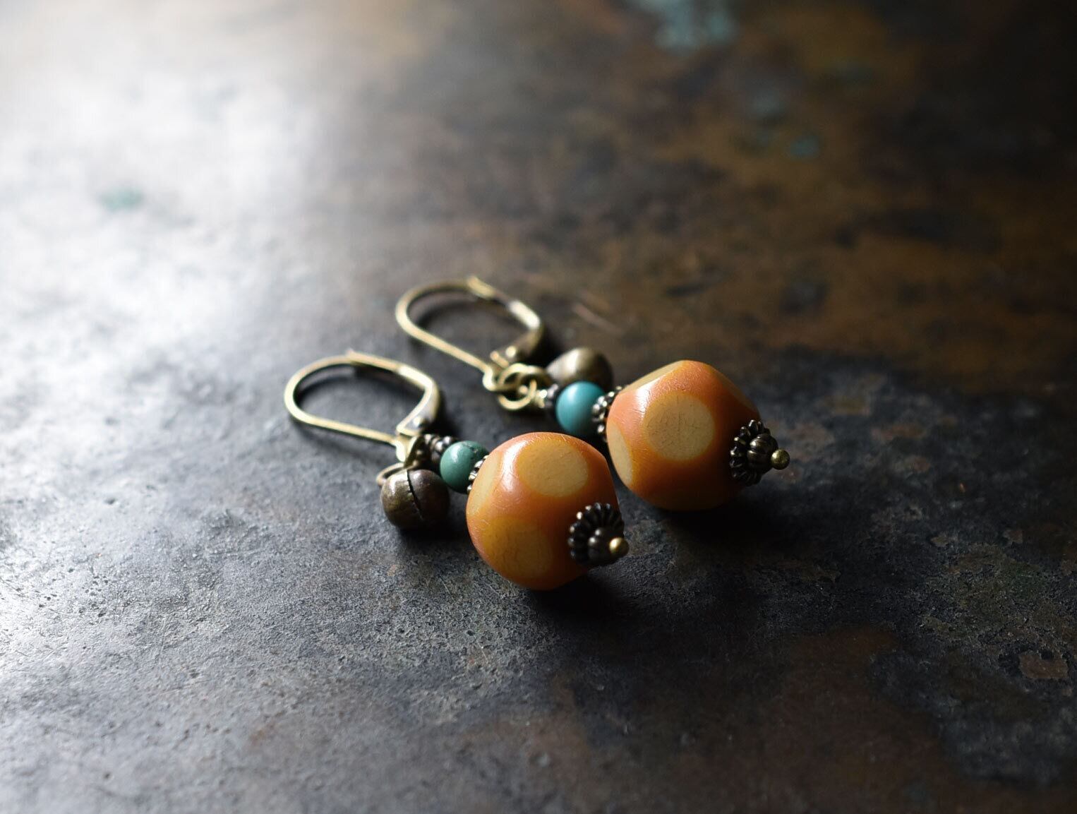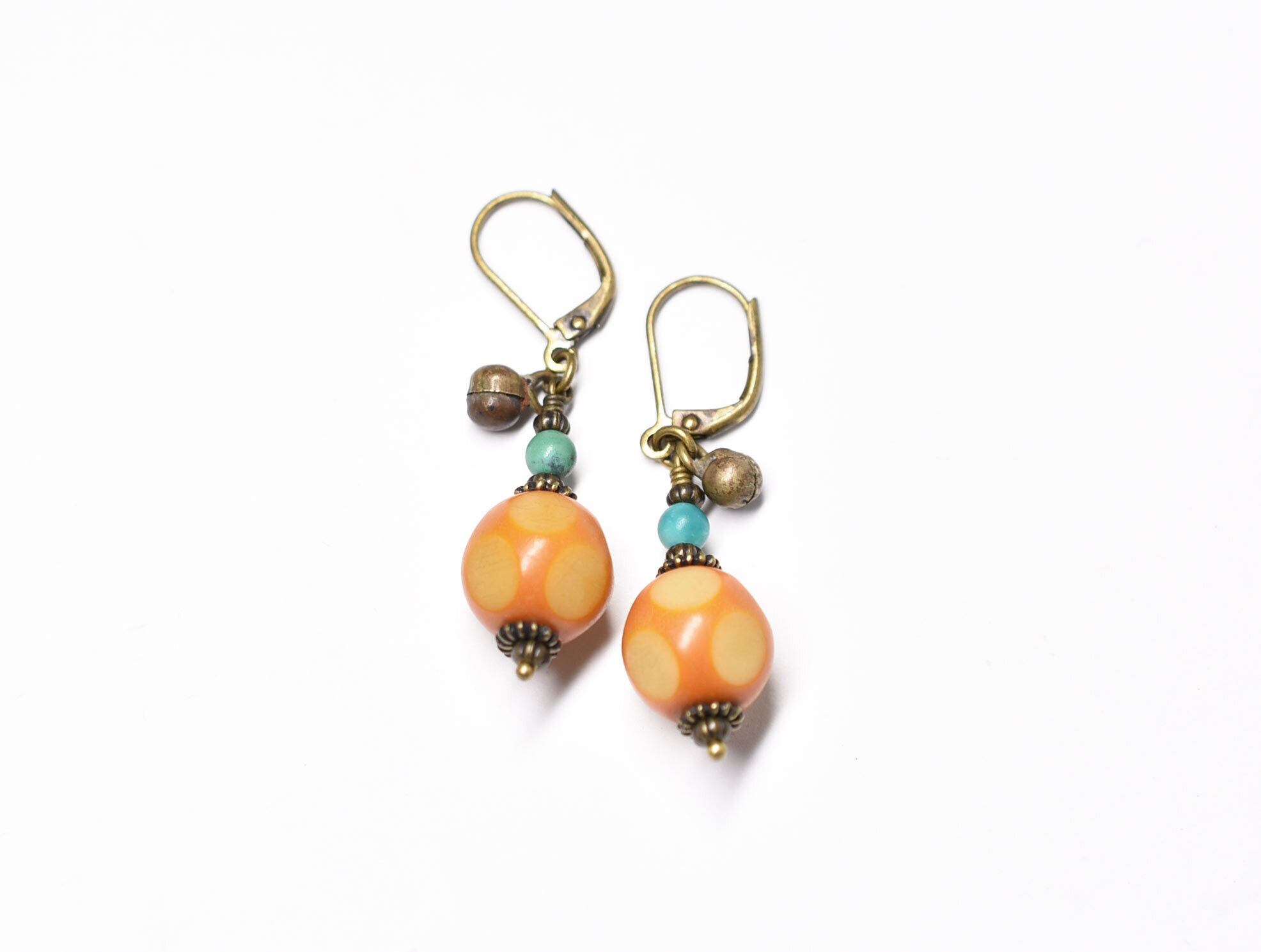 水玉模様アフリカンアンバーとターコイズ、小さな民族鈴のピアス