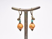 水玉模様アフリカンアンバーとターコイズ、小さな民族鈴うを繋いだピアスです。