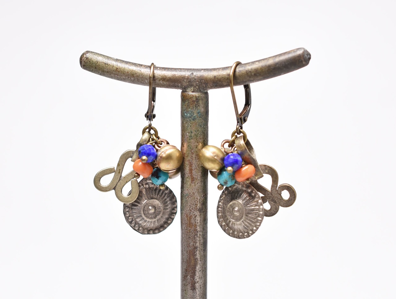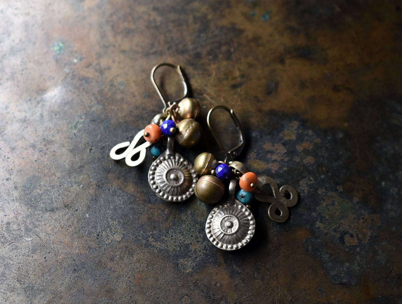 アフガンメタルと鈴、ターコイズ、oldネパールコーラル、ラピスを繋いだピアスです。