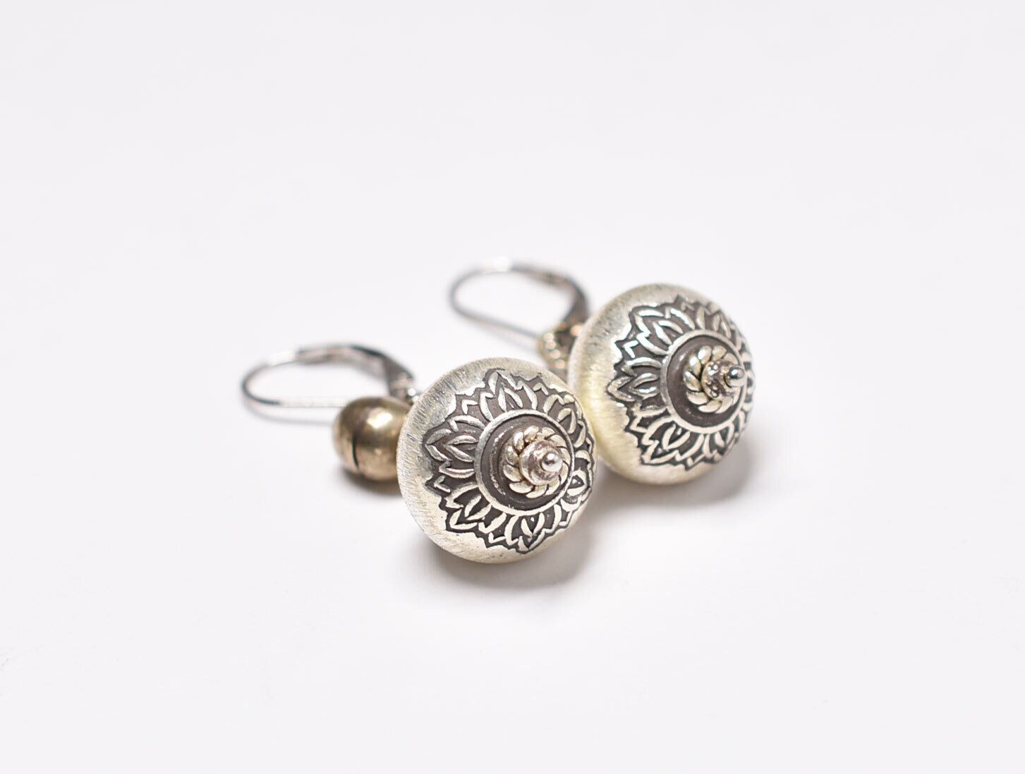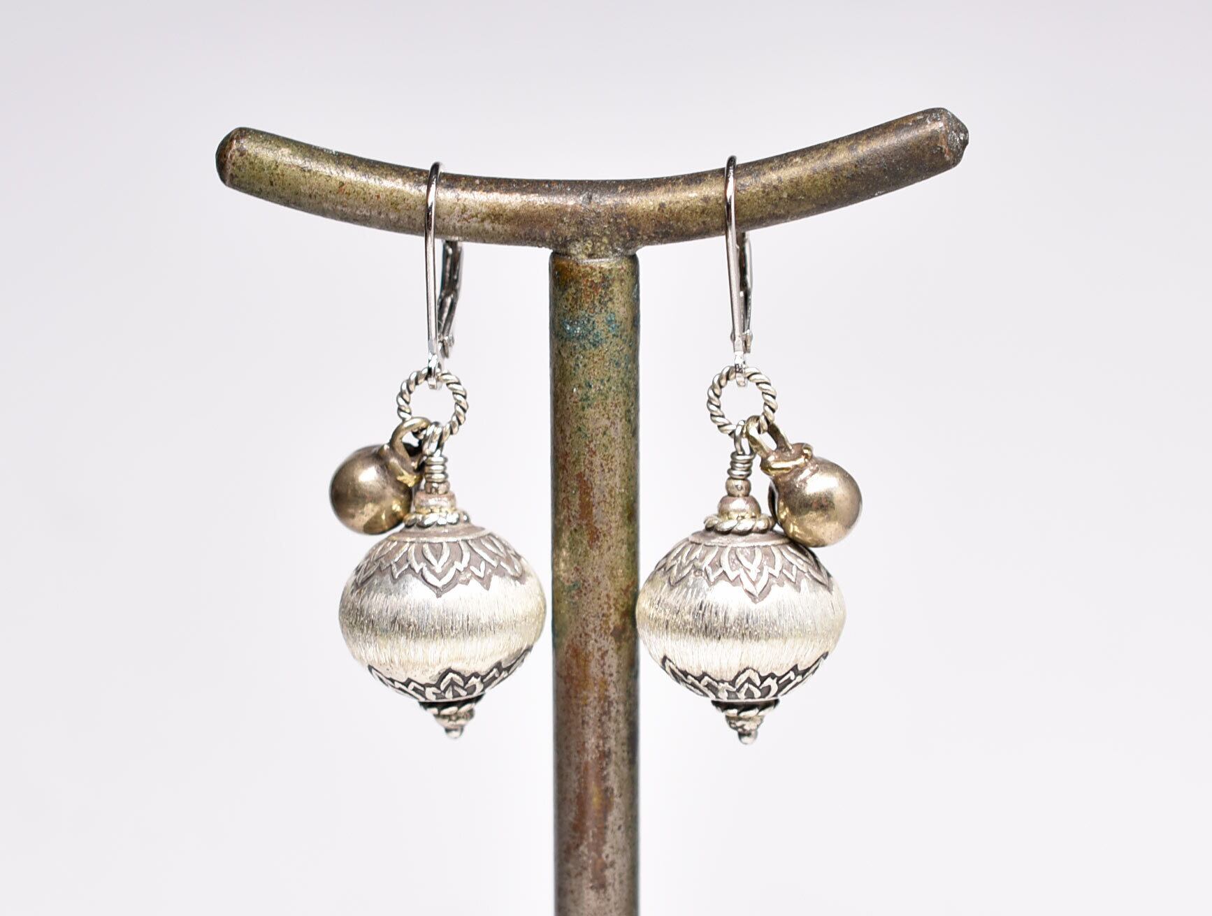 ボリュームのあるプックリ上下刻印カレンシルバーと民族鈴を繋いだピアスです。