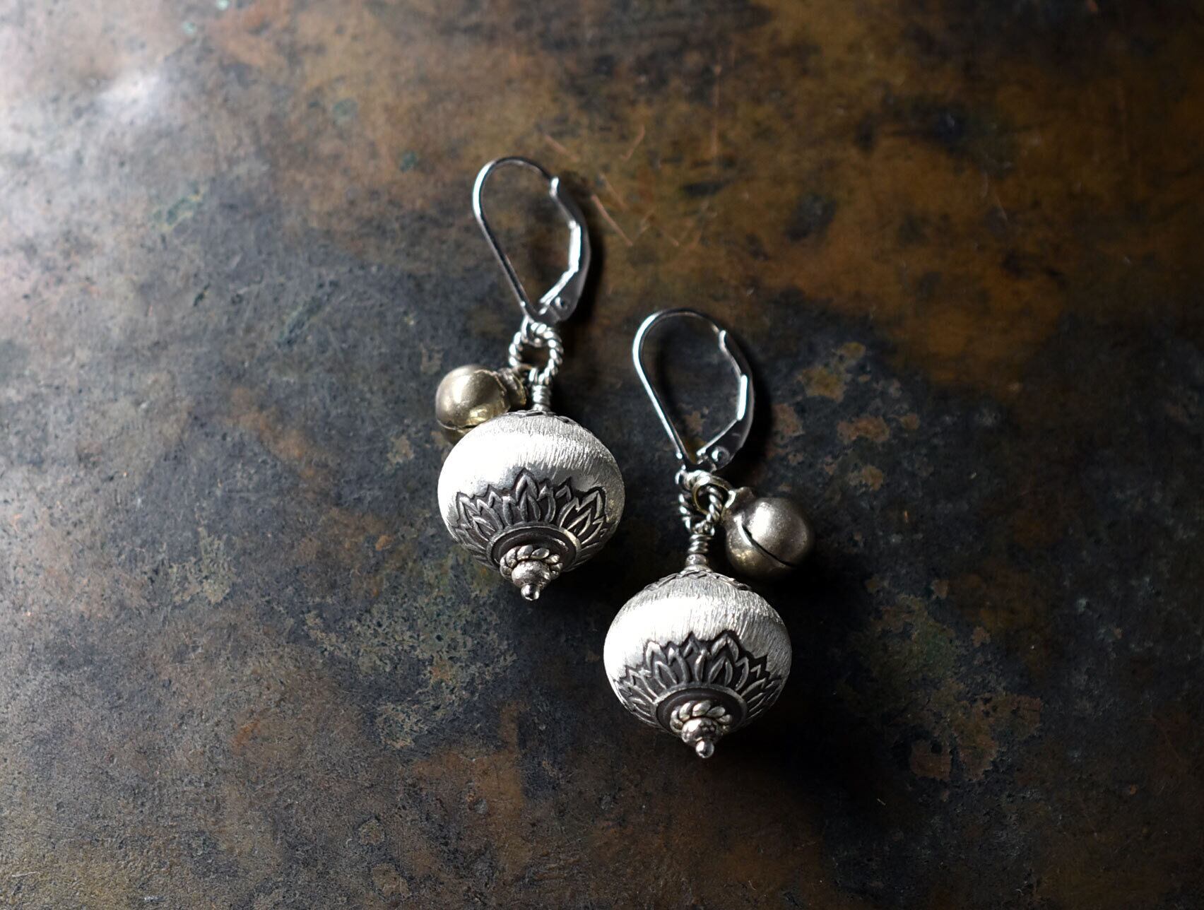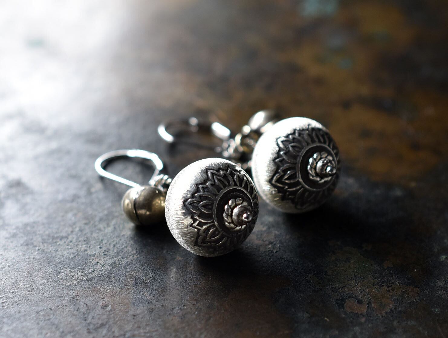 プックリ上下刻印カレンシルバーと民族鈴のピアス