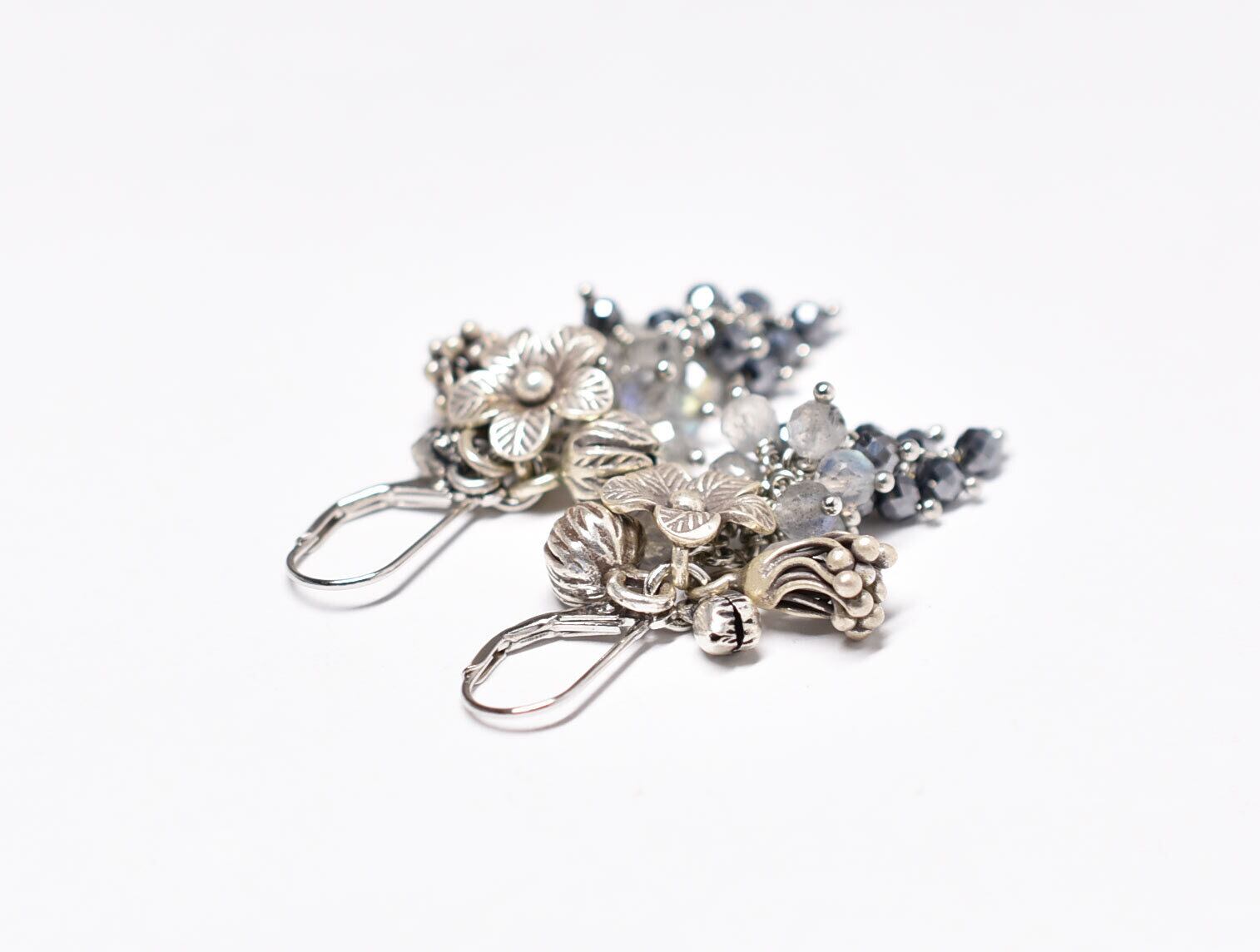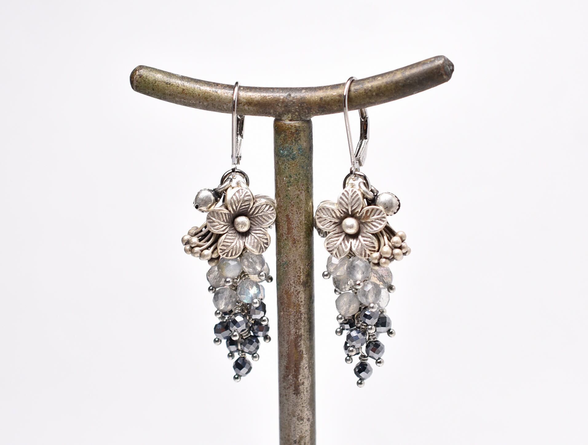 カレンシルバーのお花と蕾、たわわなラブラドライトとテラヘルツ、小さな鈴のピアス