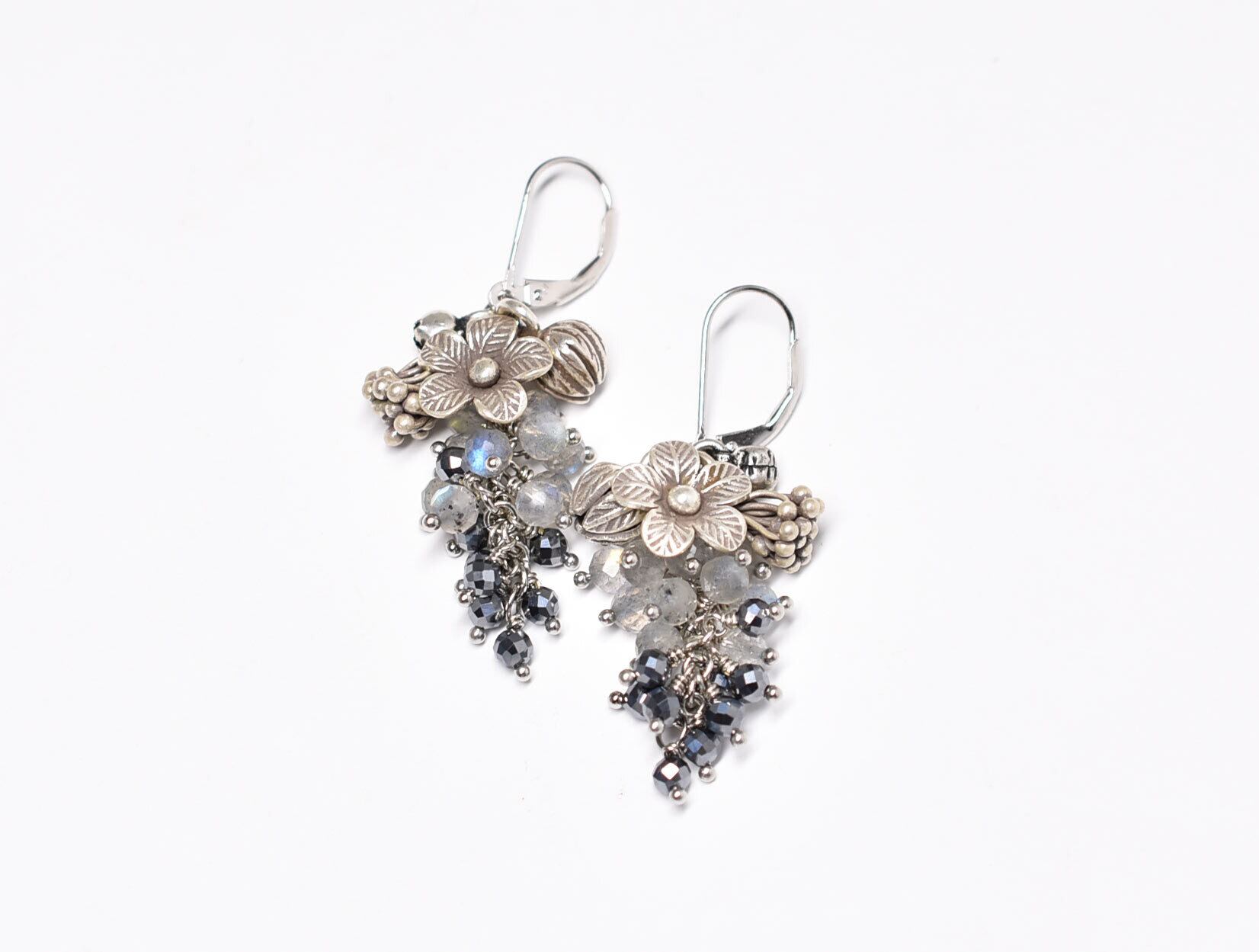 カレンシルバーのお花と蕾、たわわなラブラドライトとテラヘルツ、小さな鈴を繋いだピアスです。