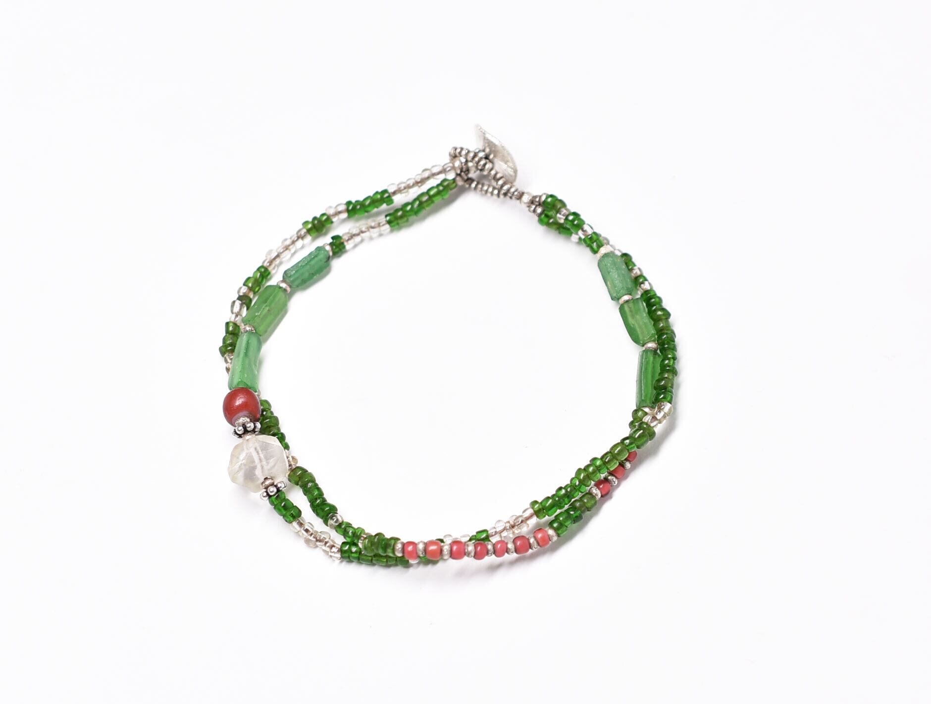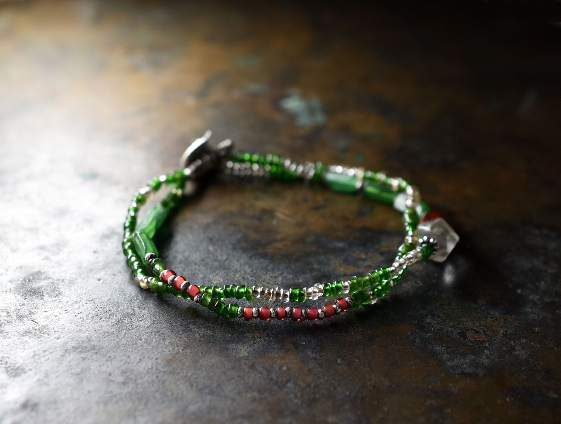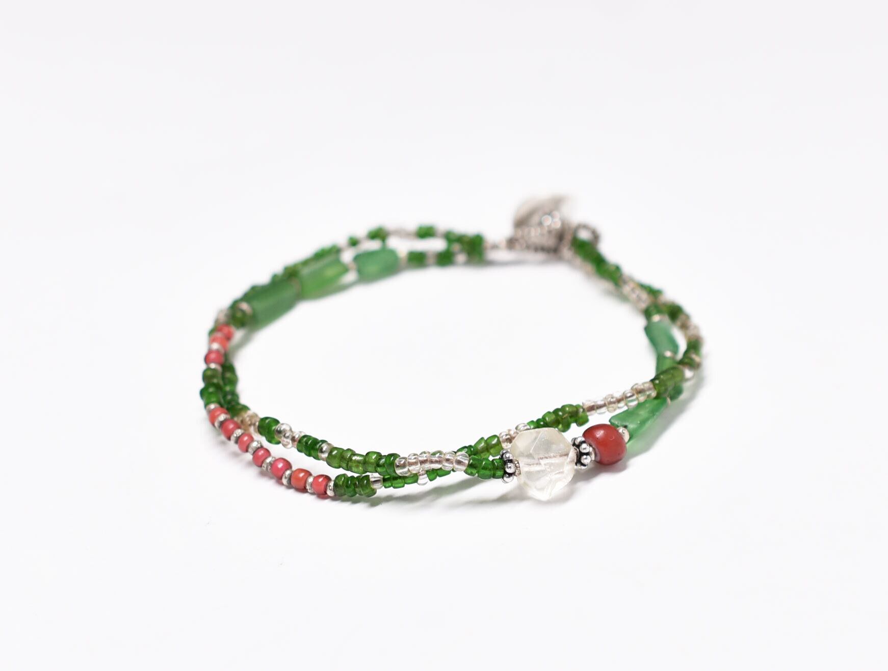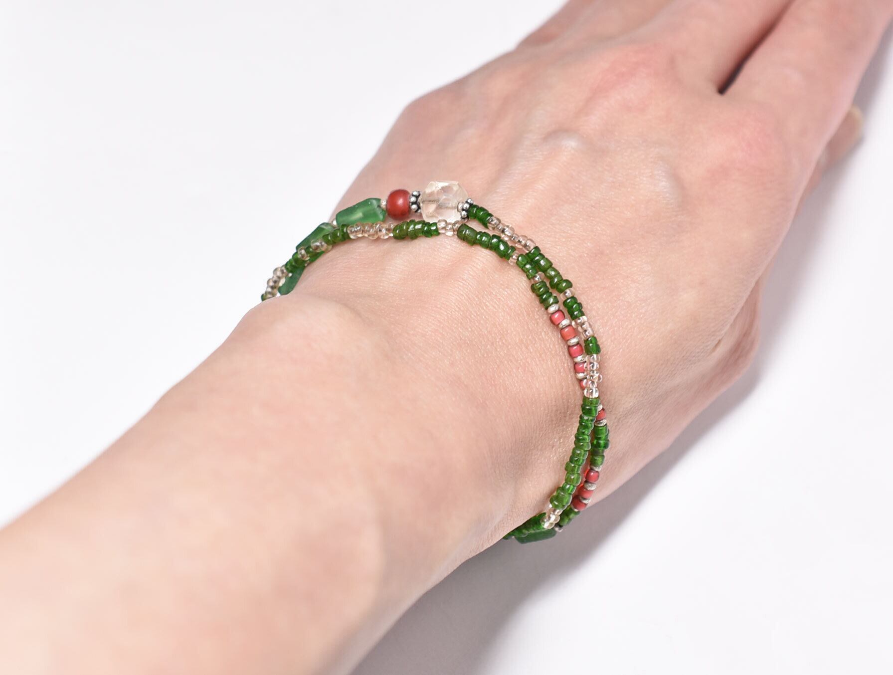 ボヘミアビーズと金赤ホワイトハーツ、ローマングラス、クリア&グリーンシードビーズの2連ブレス
