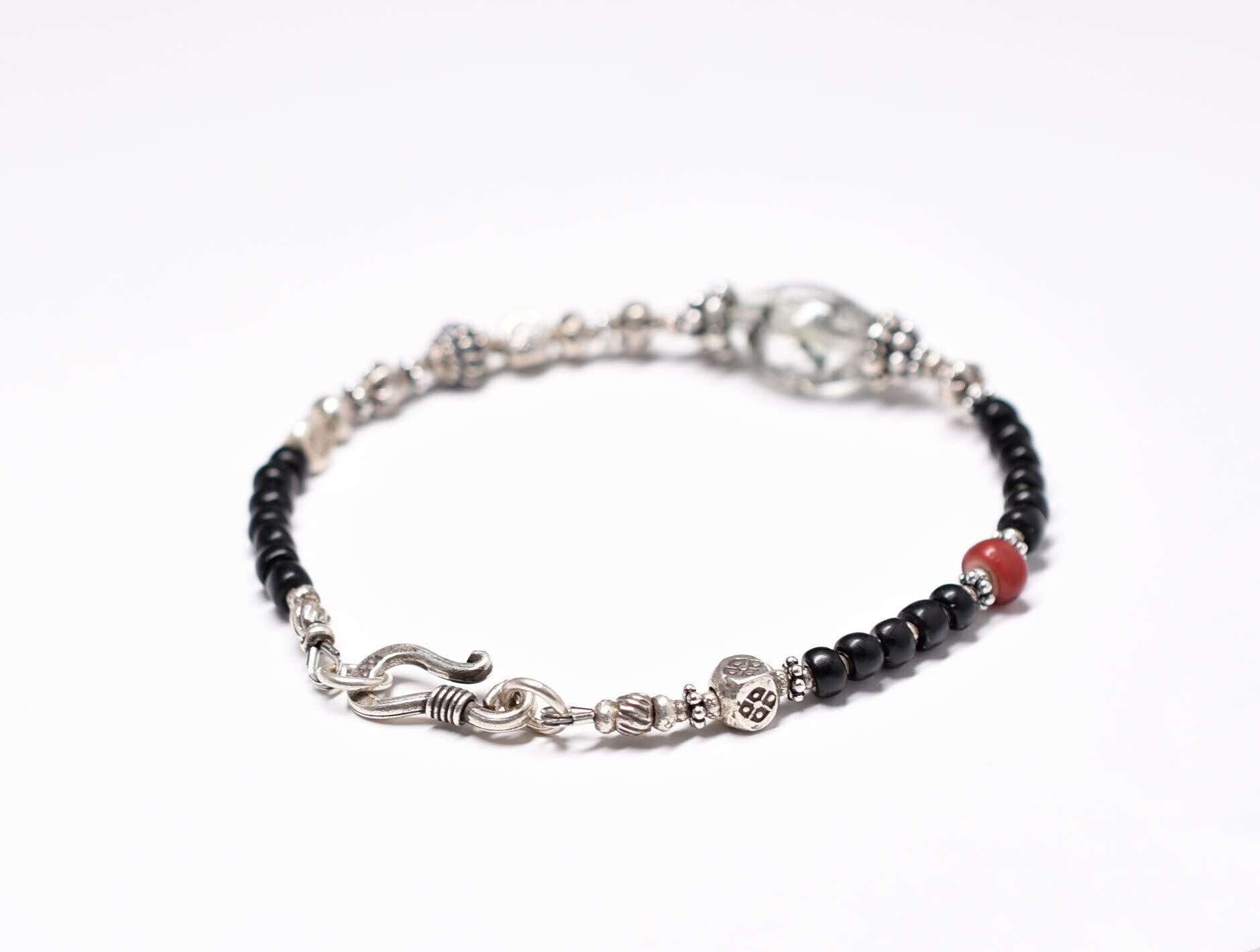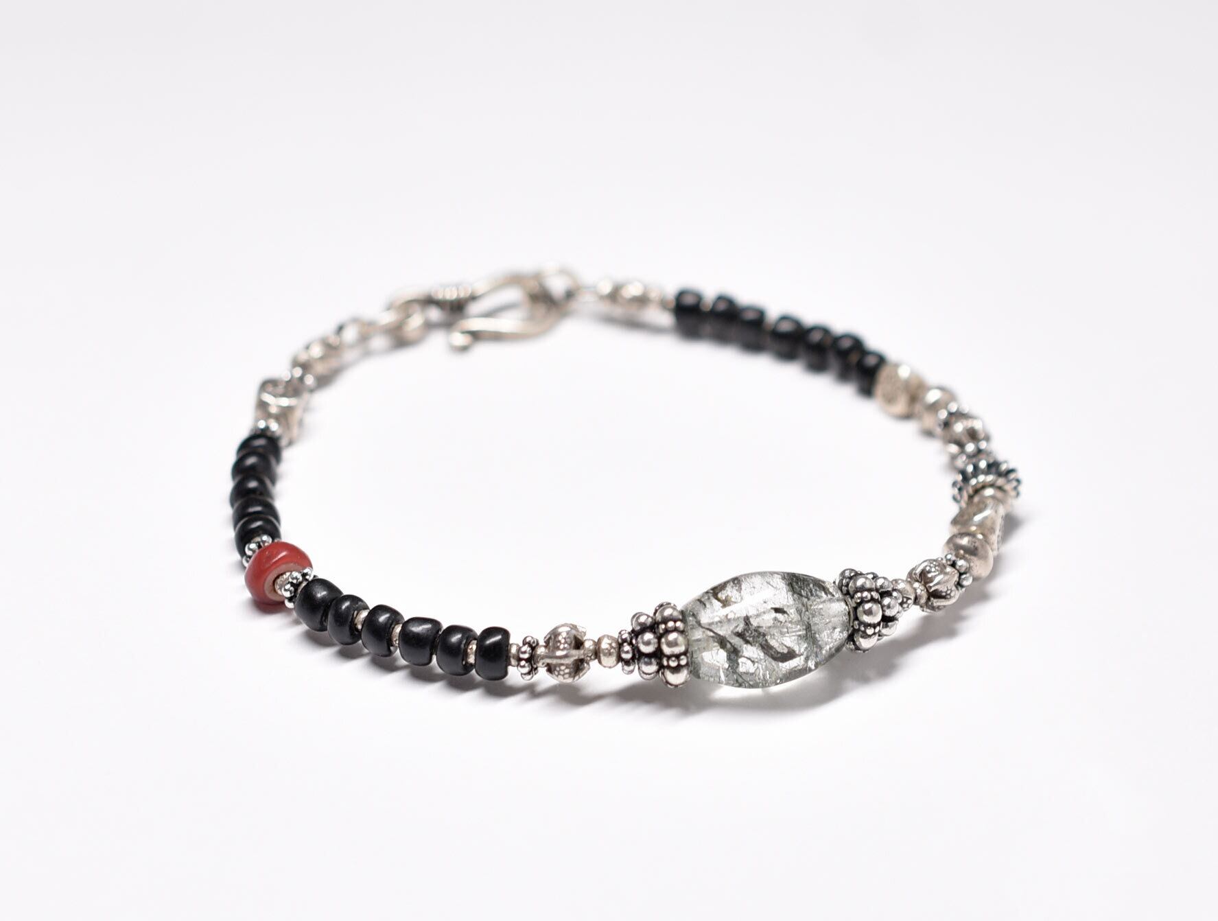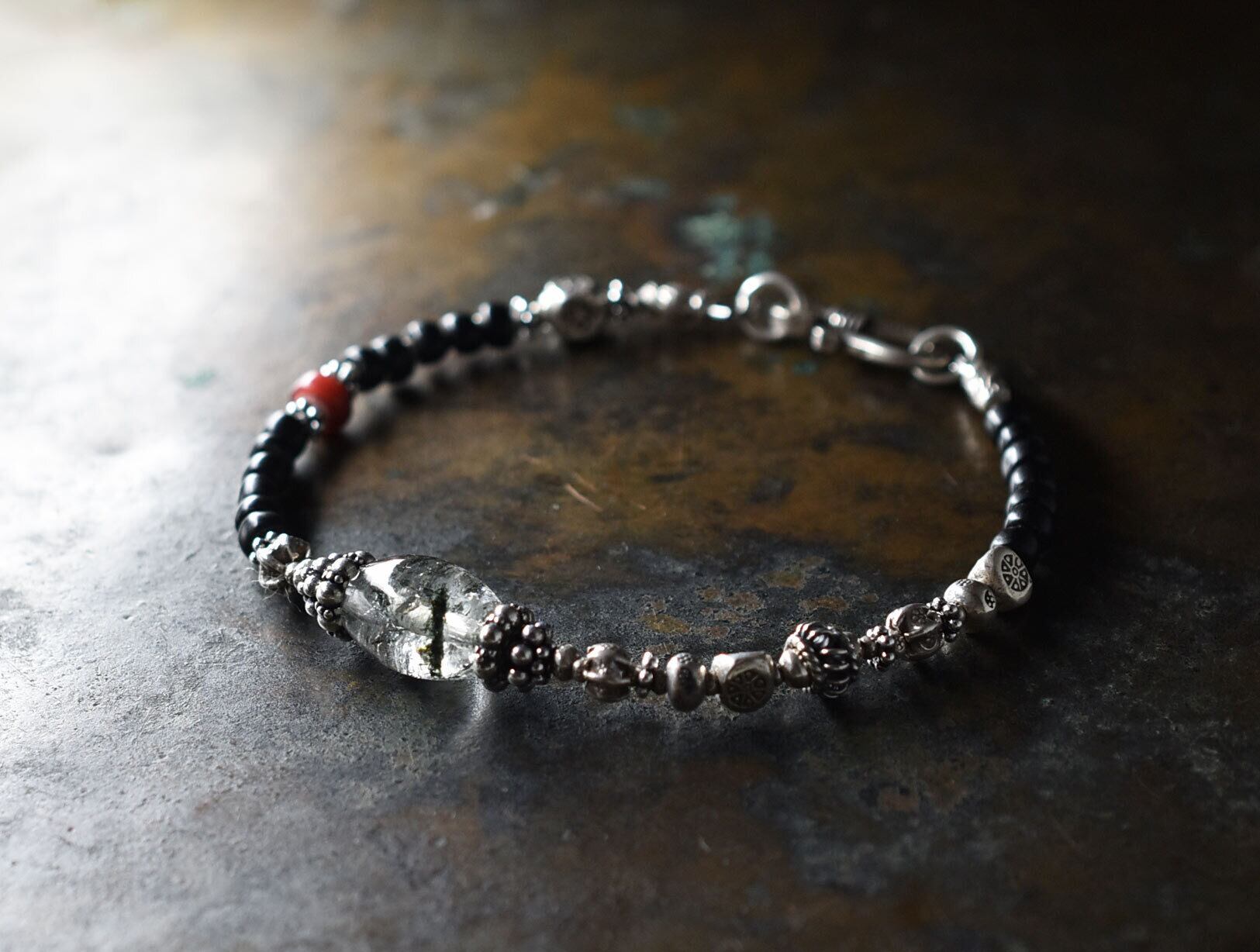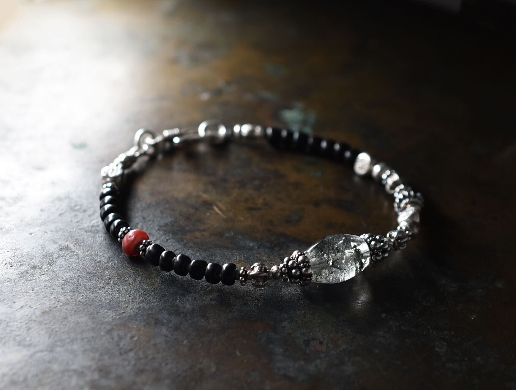 ヒマラヤ水晶と多彩カレンシルバー、漆黒ビーズ、金赤ホワイトハーツのブレス