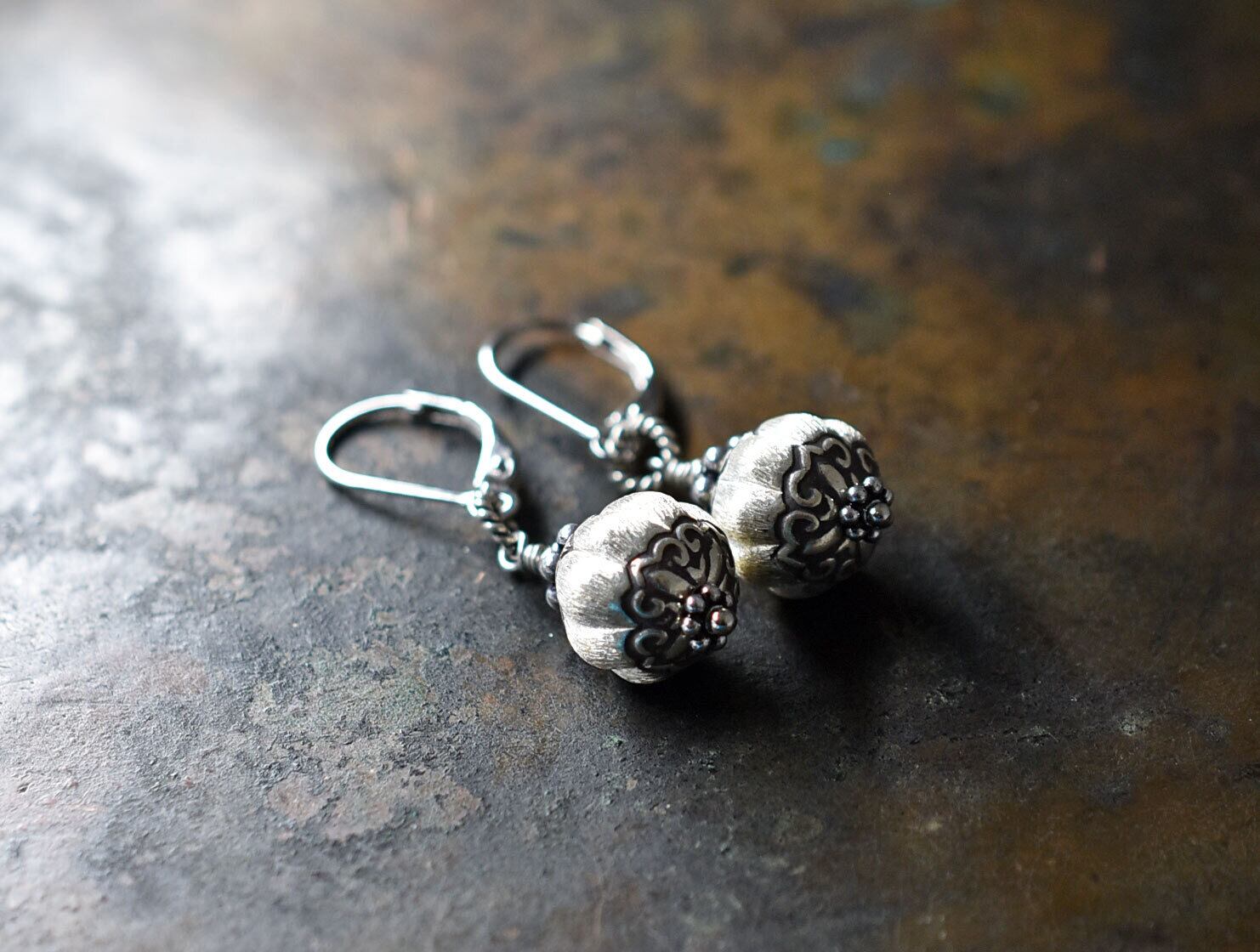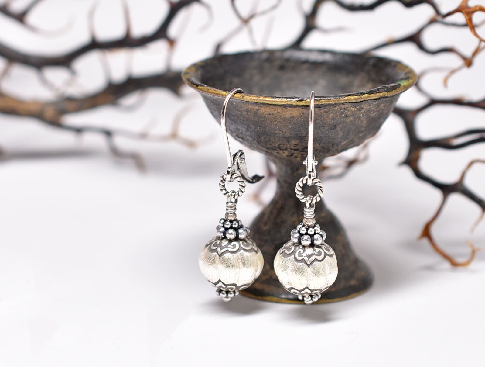 筋が施されたぷっくりとしたカレンシルバーの上下には花弁のような繊細な刻印が施されています。