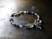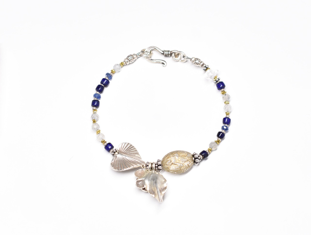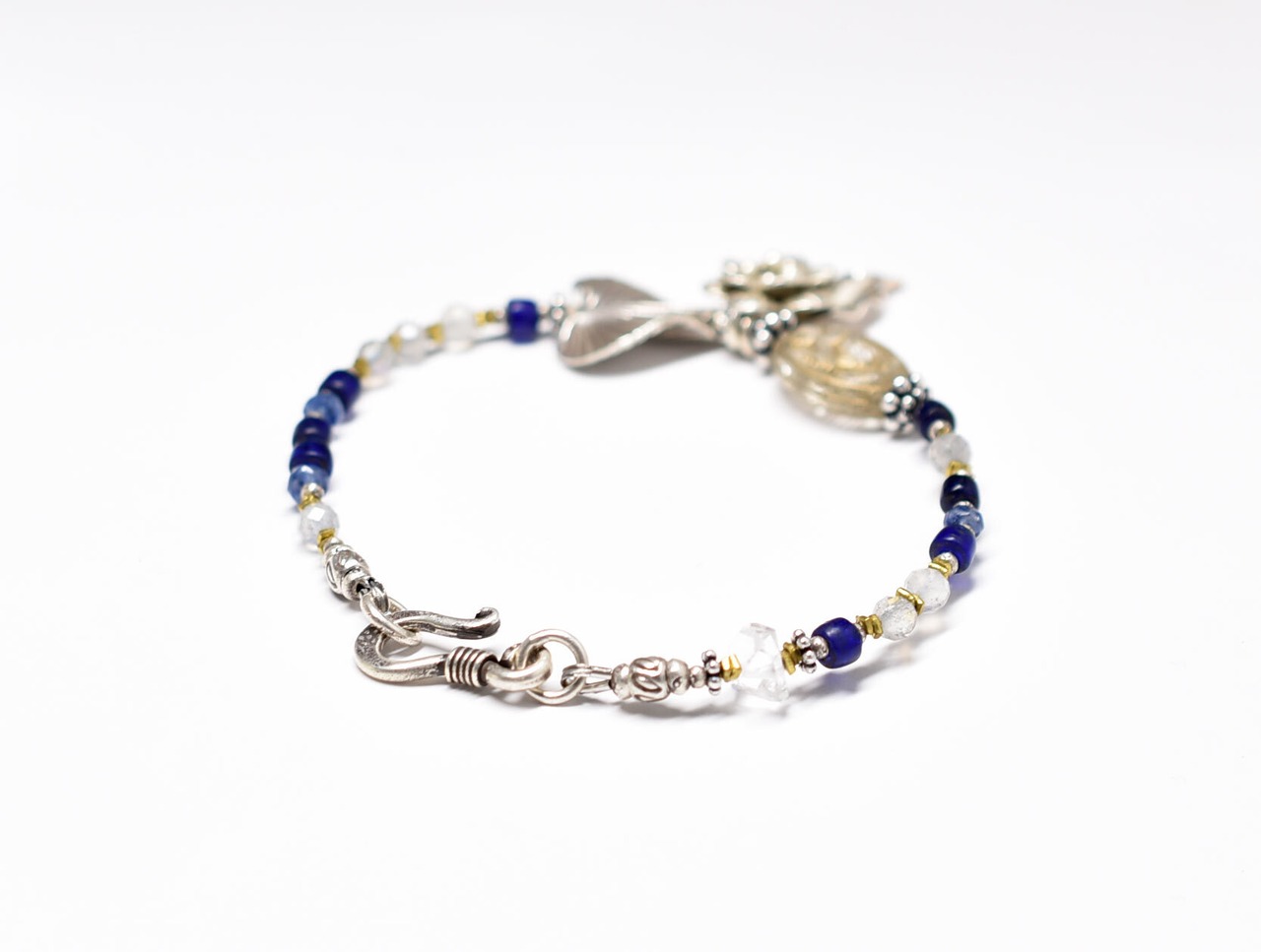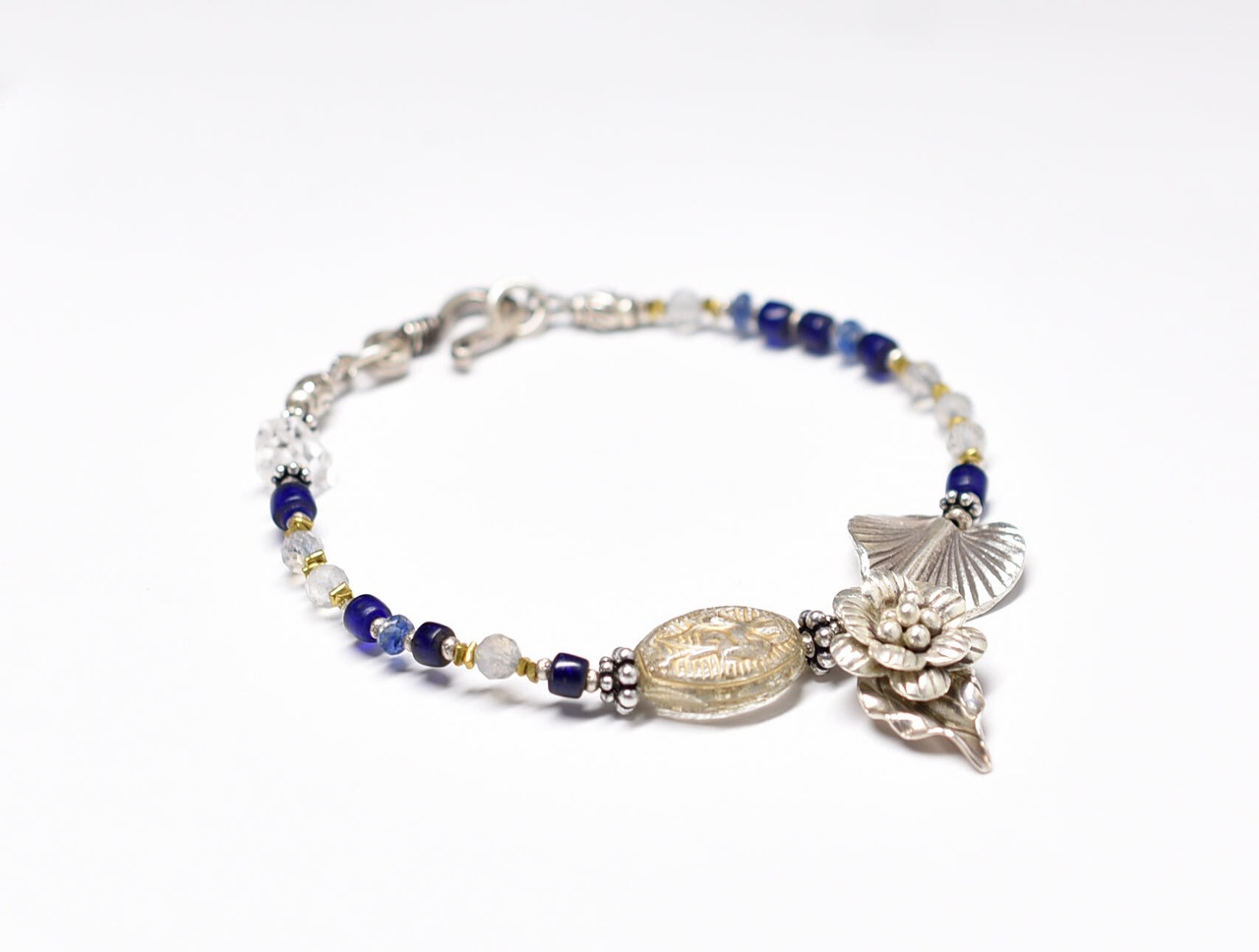 ロザリオパーツとボタニカルなカレンシルバー、瑠璃色アンティークビーズ、ラブラドライトとカイヤナイト、ハーキマーダイヤモンドを繋いだブレスです。