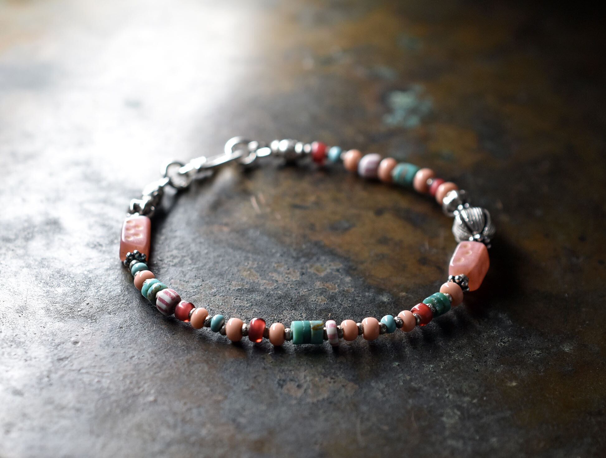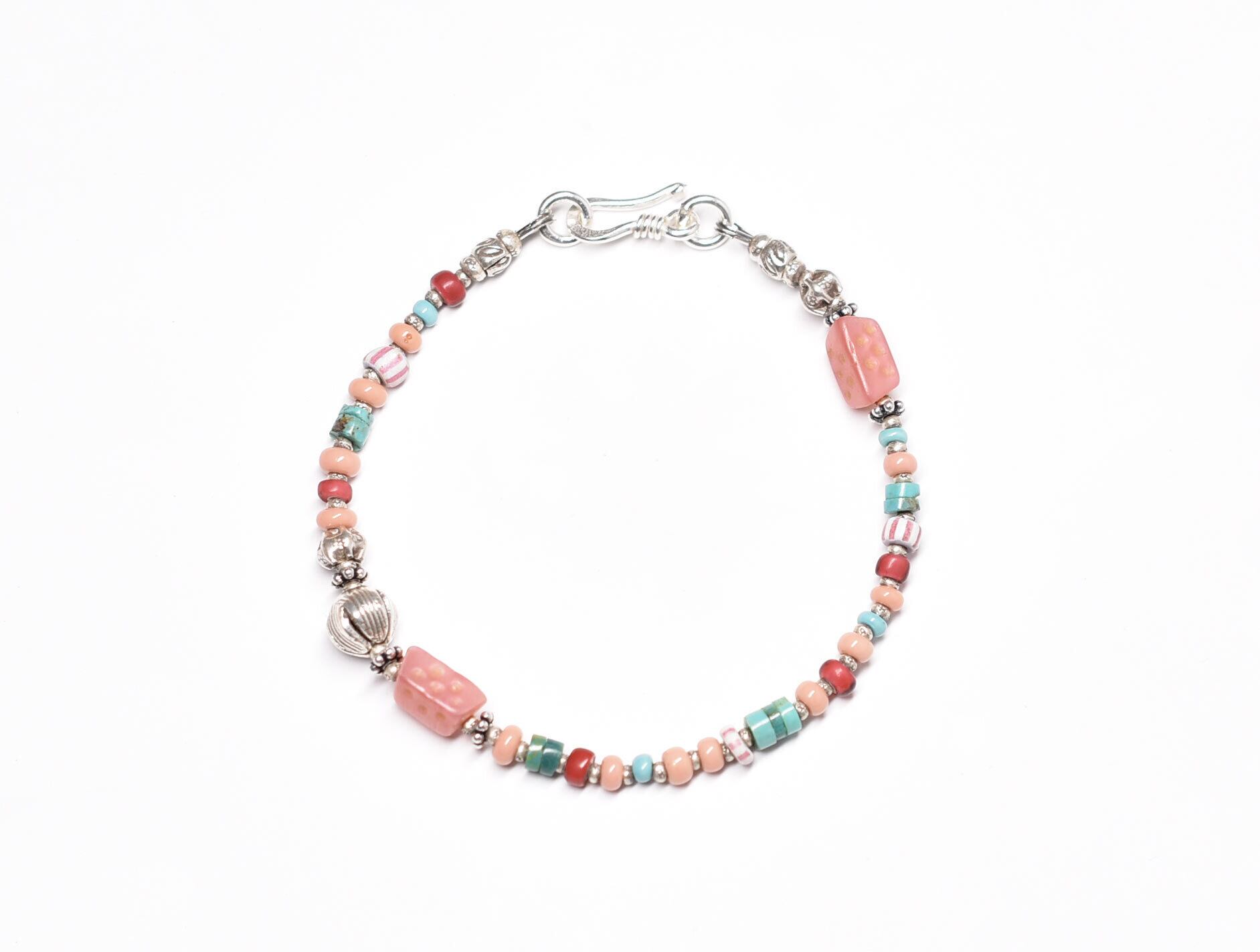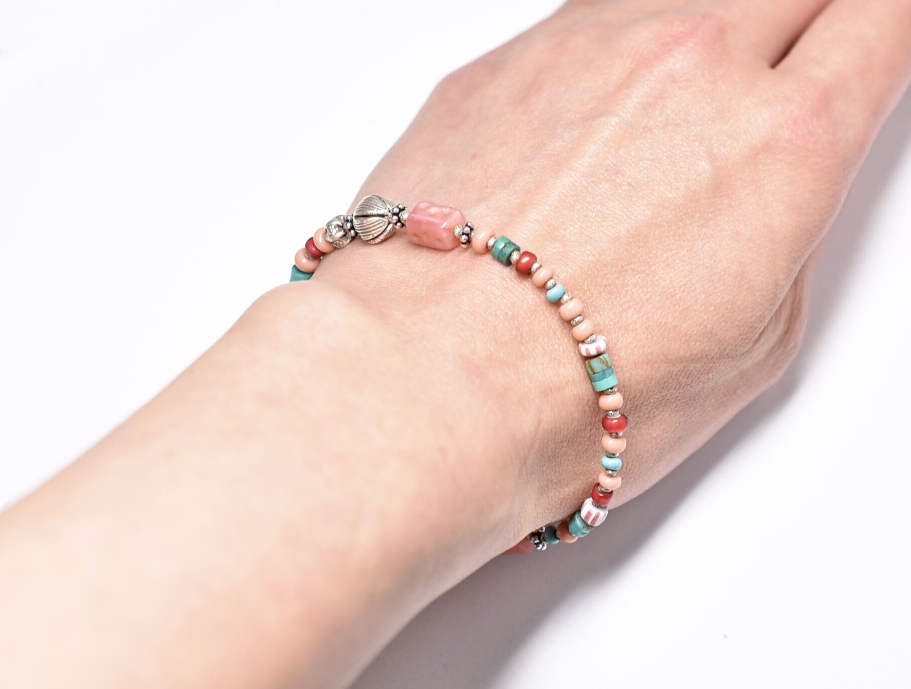 多彩なベネチアビーズと、ピンク色のダイスビーズ、ターコイズ、カレンシルバーを繋いだブレスです。