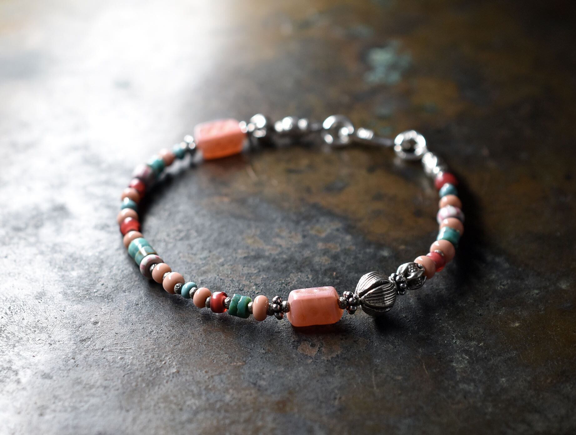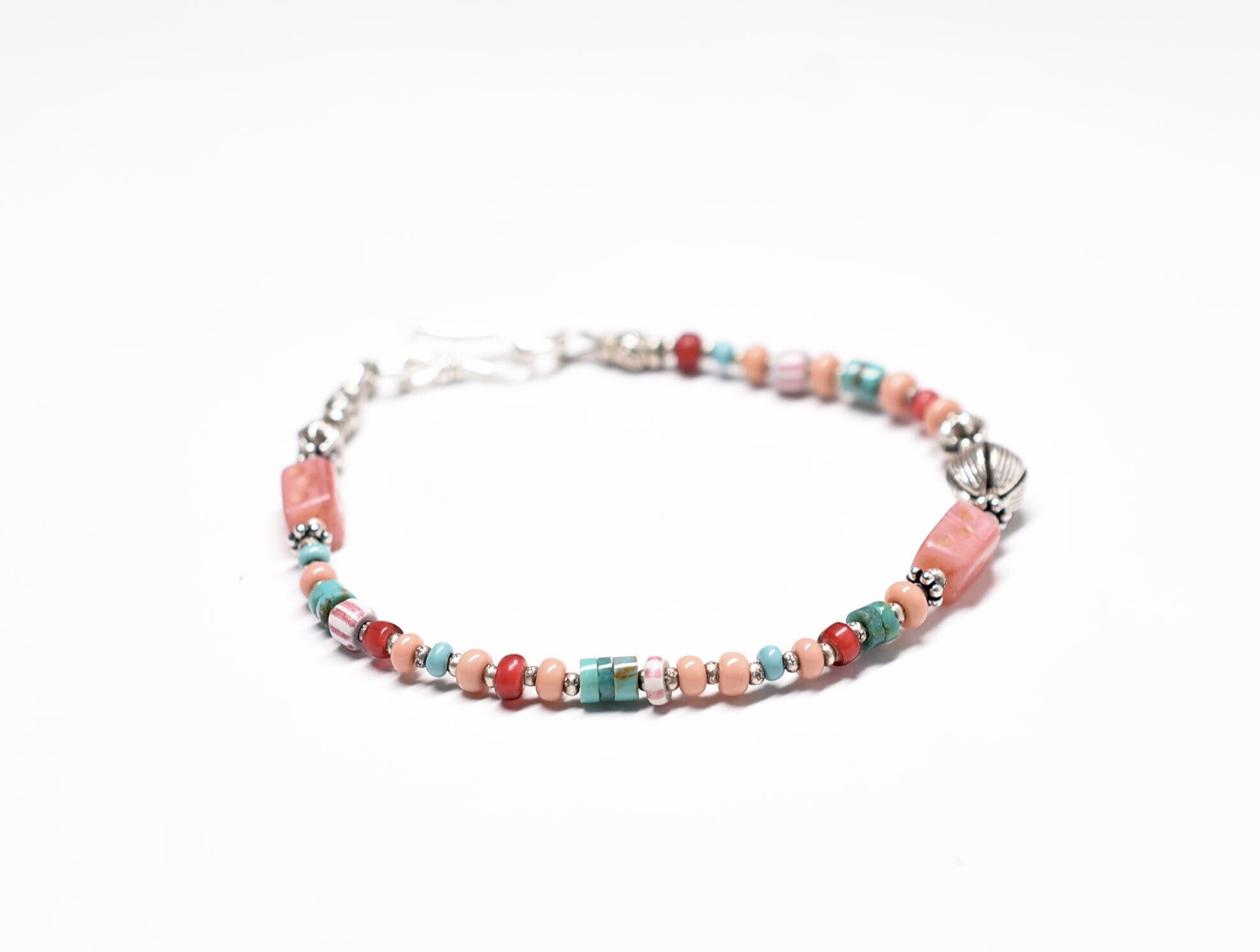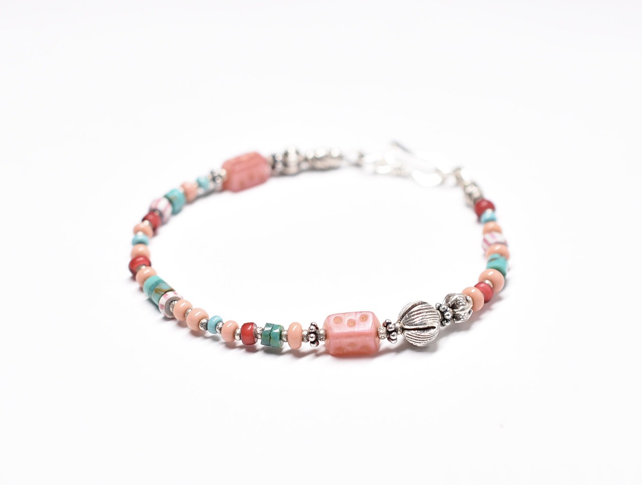多彩なベネチアビーズと、ピンク色のダイスビーズ、ターコイズ、カレンシルバーを繋いだブレスです。