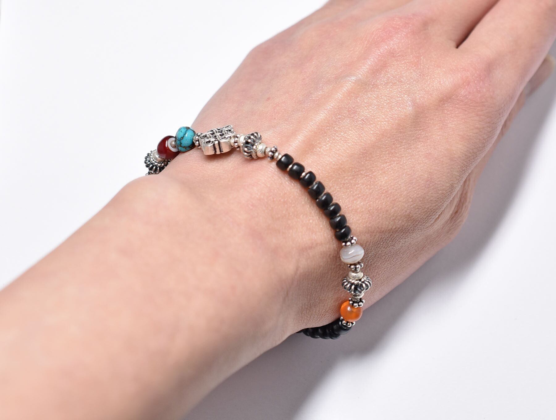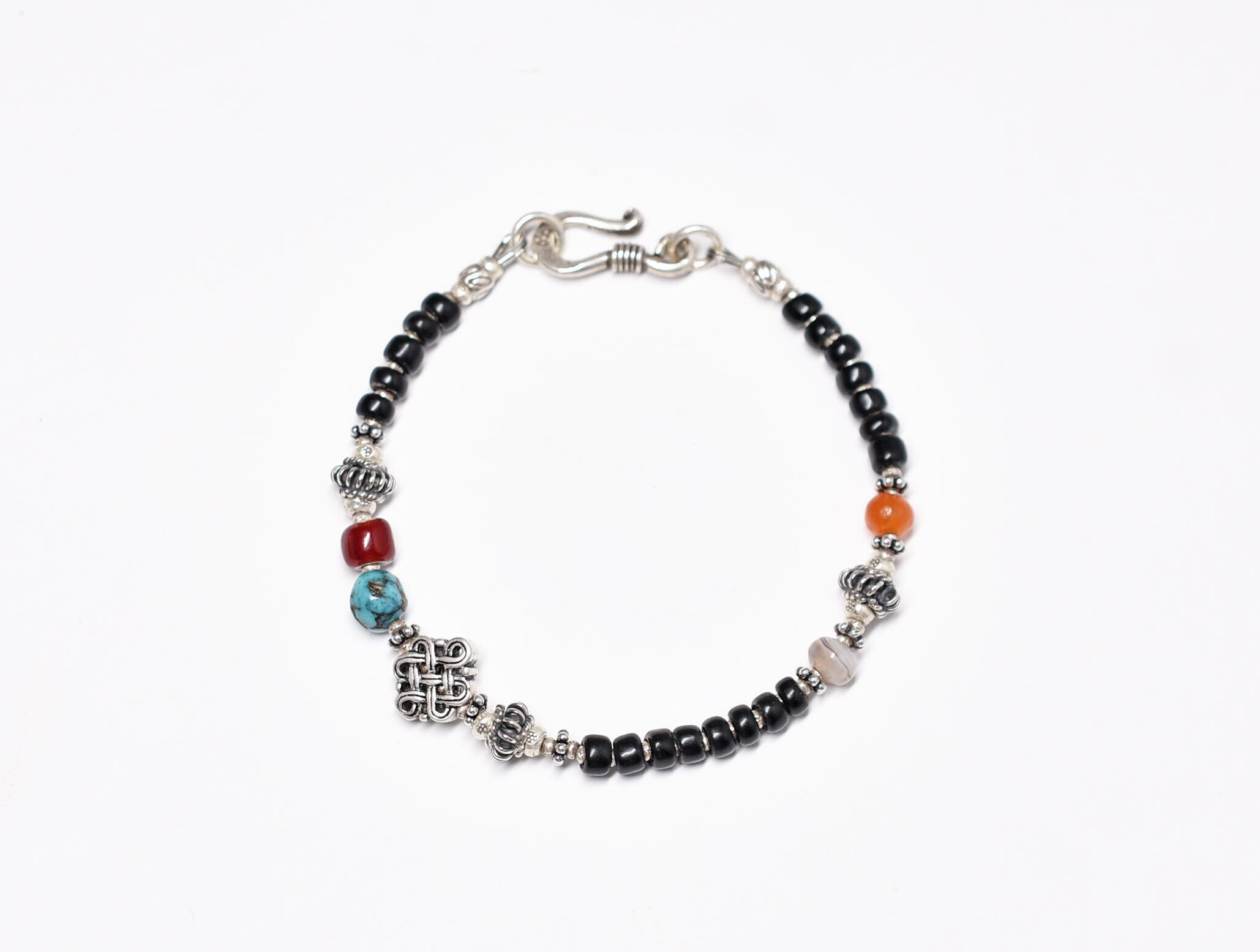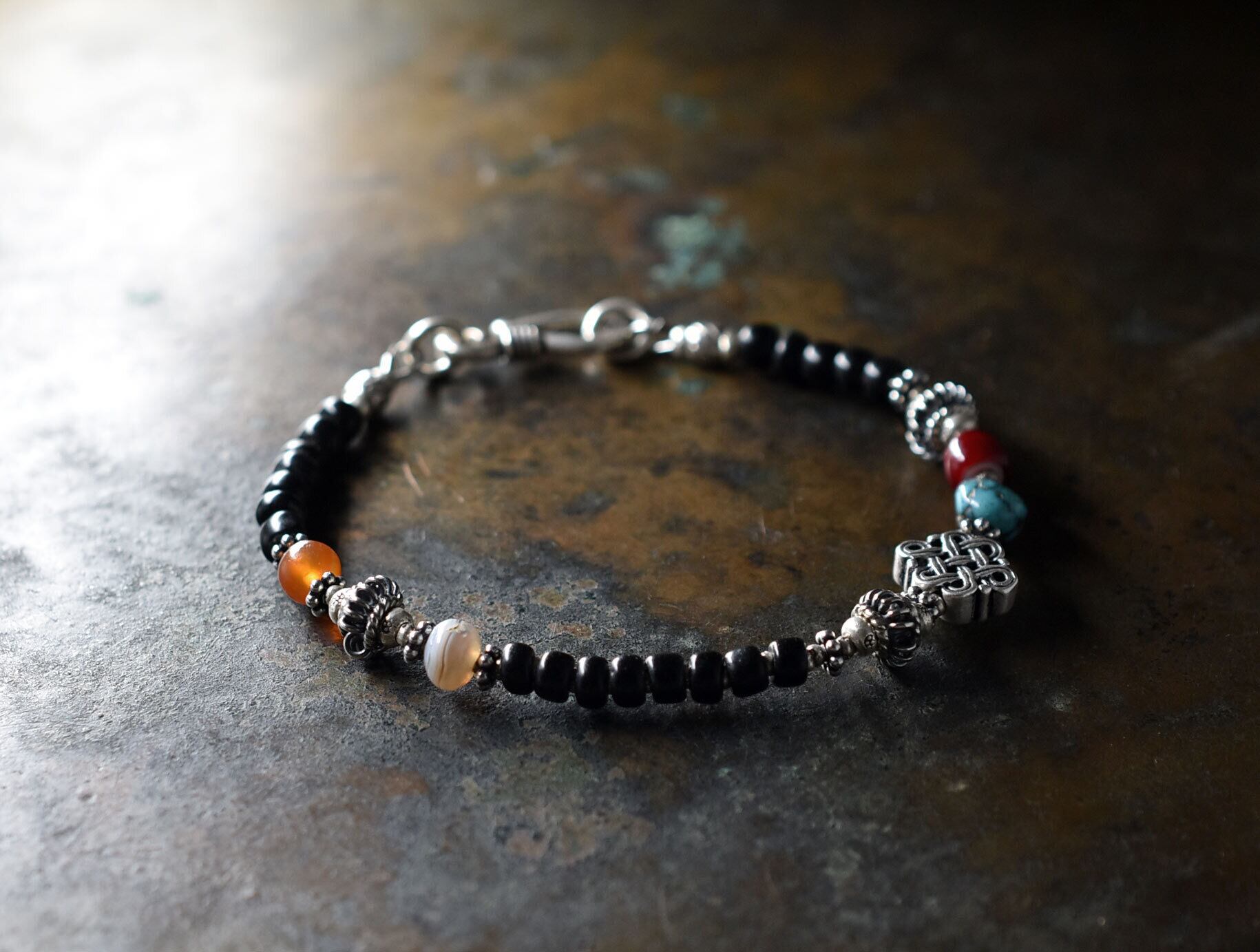 エンドレスノットとoldチベタンターコイズ、血赤ホワイトハーツ、古代瑪瑙、古代カーネリアン、漆黒ビーズを繋いだブレスです。