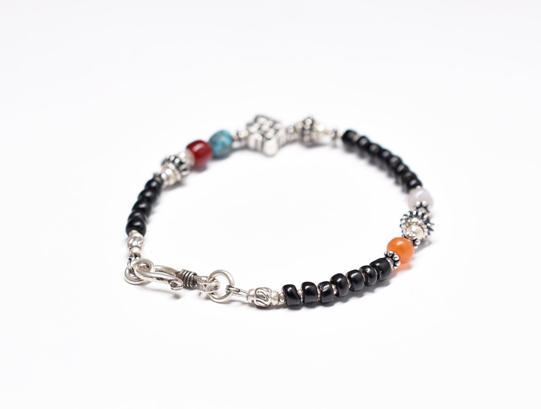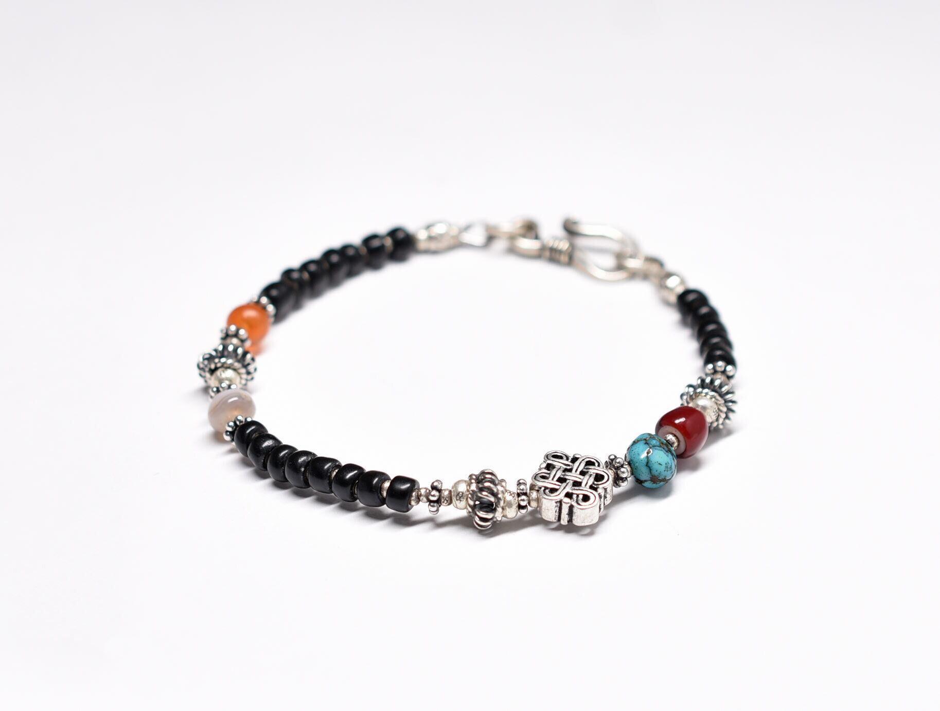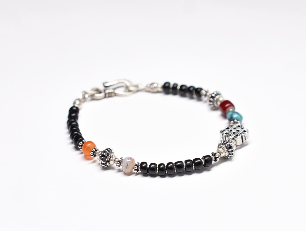 エンドレスノットとoldチベタンターコイズ、血赤ホワイトハーツ、古代瑪瑙、古代カーネリアン、漆黒ビーズを繋いだブレスです。