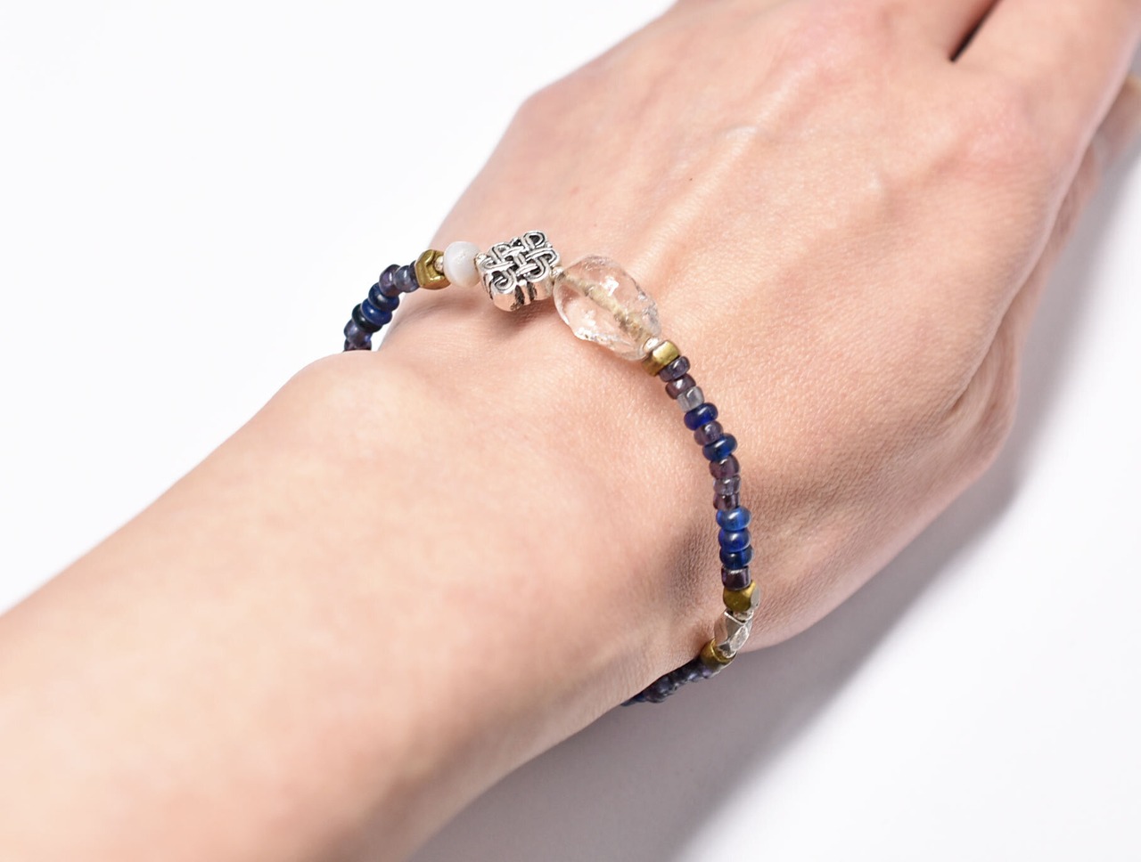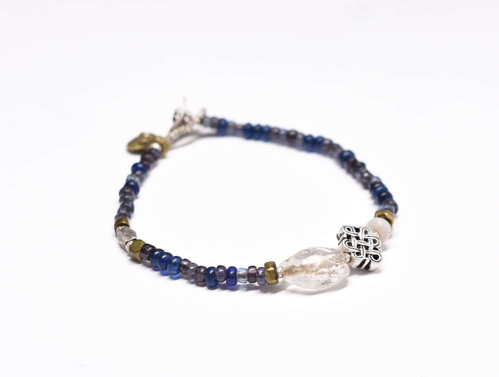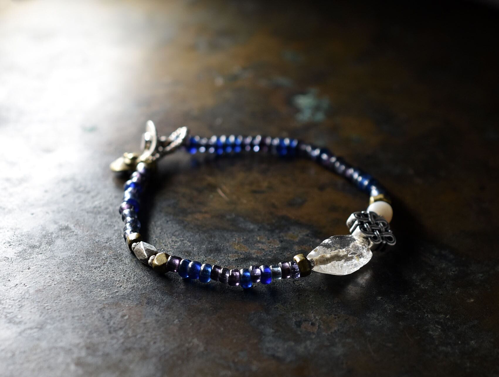 古代水晶とエンドレスノット、古代瑪瑙、oldチンシルバー、パープルミックス&ブルーアンティークビーズ、oldオリッサブラスなどを繋いだブレスです。
