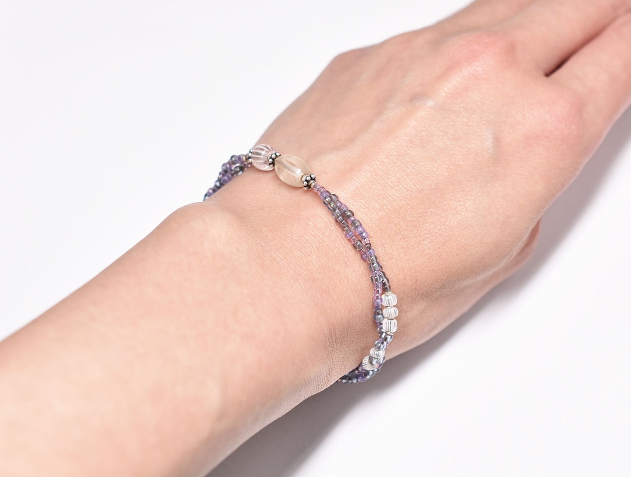 小さなパープルやピンクオパール、青藤色のビーズはフランスのヴィンテージビーズです。