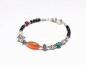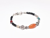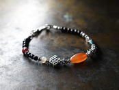 古代カーネリアンとエンドレスノット、oldチベタンターコイズ、血赤ホワイトハーツ、古代瑪瑙、漆黒ビーズなどを繋いだブレスです。