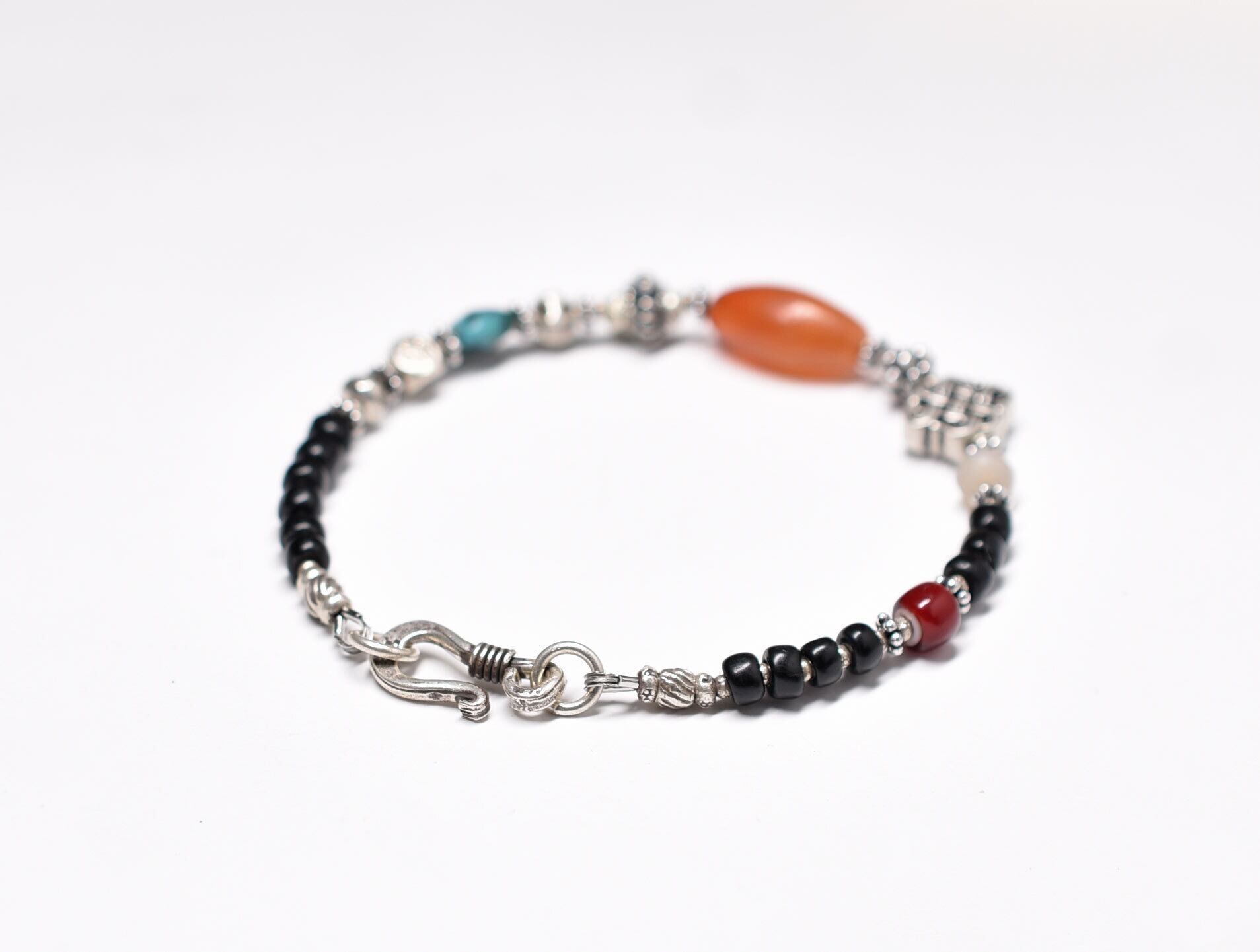 古代カーネリアンとエンドレスノット、oldチベタンターコイズ、血赤ホワイトハーツ、古代瑪瑙、漆黒ビーズのブレス