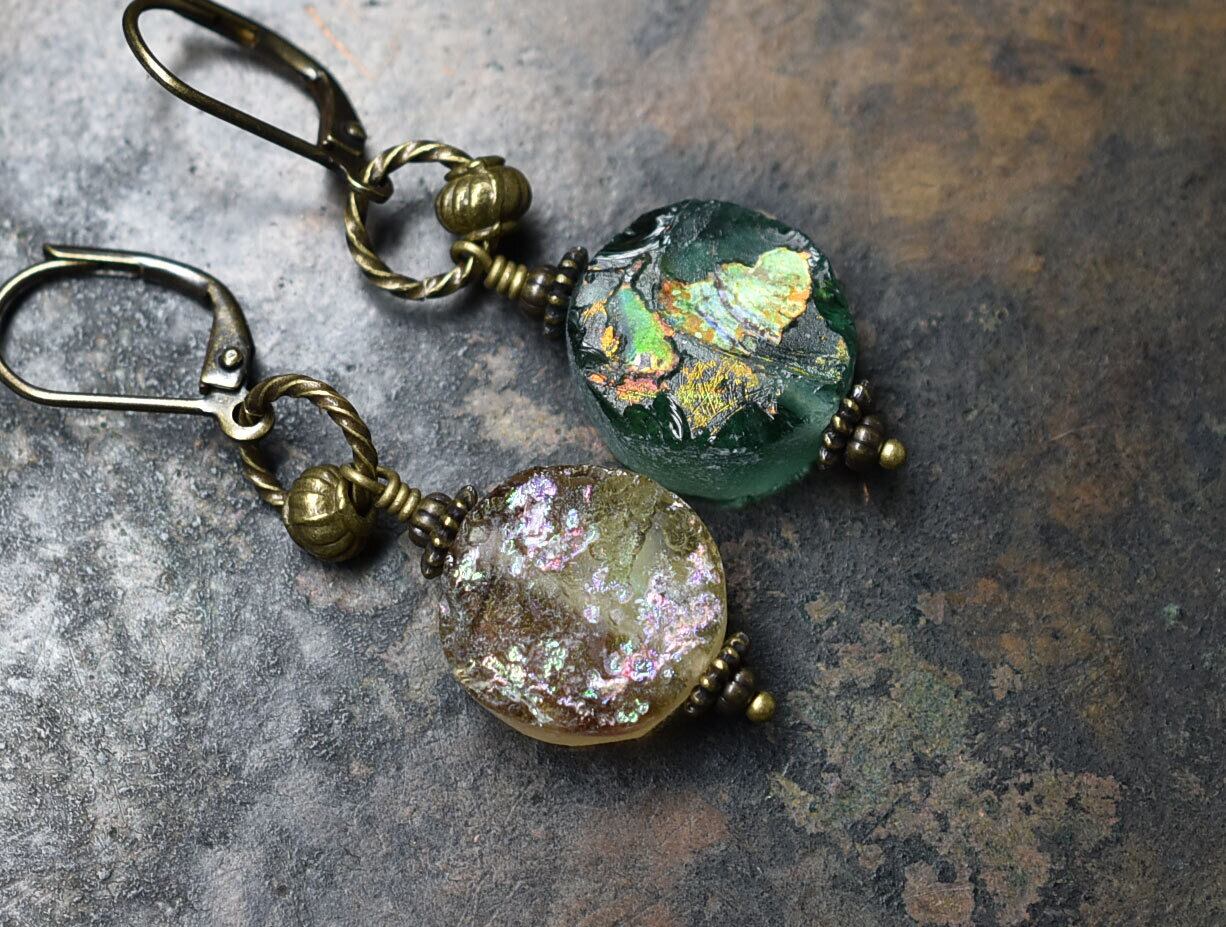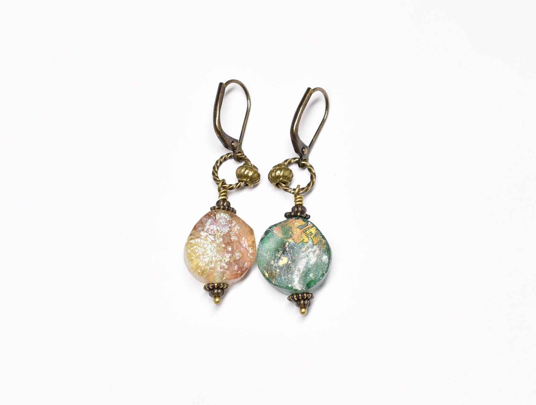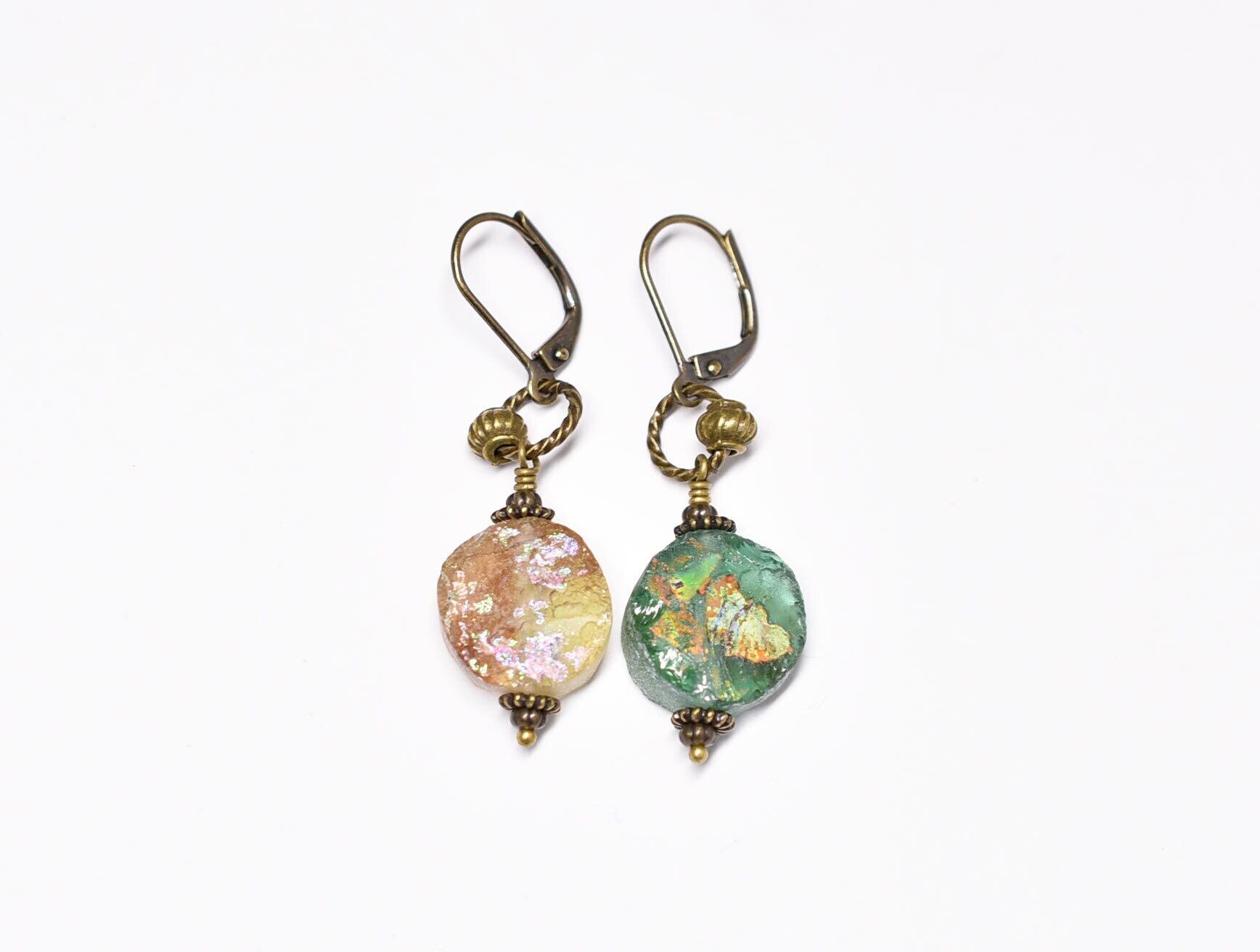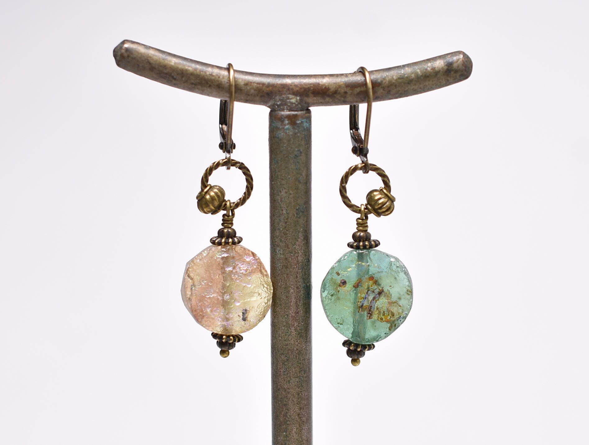 丸型の銀化ローマングラスのカラーアンシメトリーなピアスです。