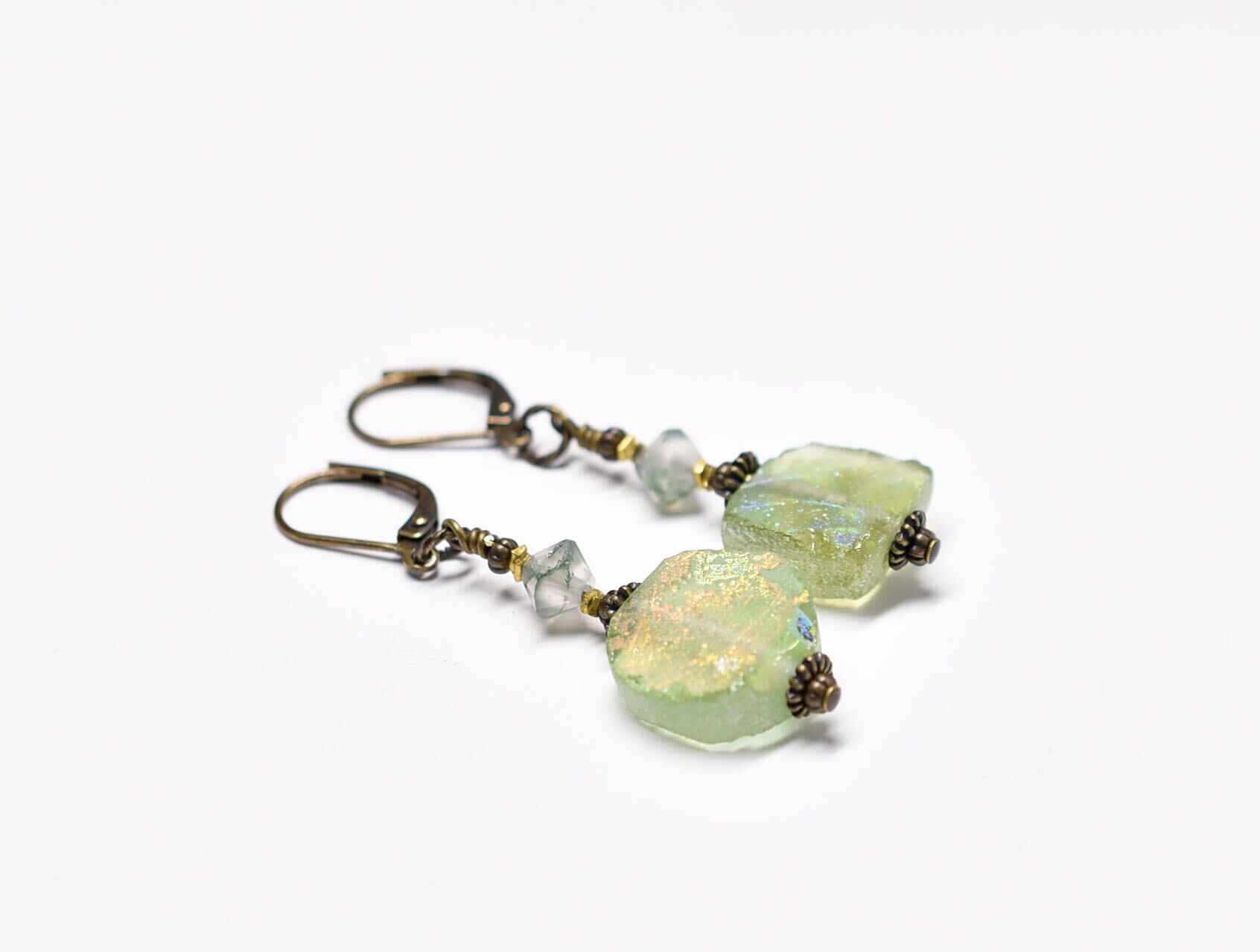 オリーブグリーン銀化ローマングラスとモスアゲートを繋いだピアスです。