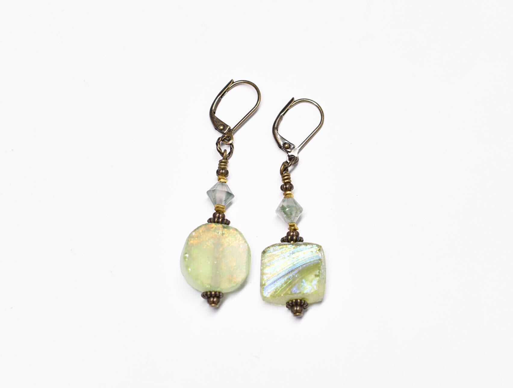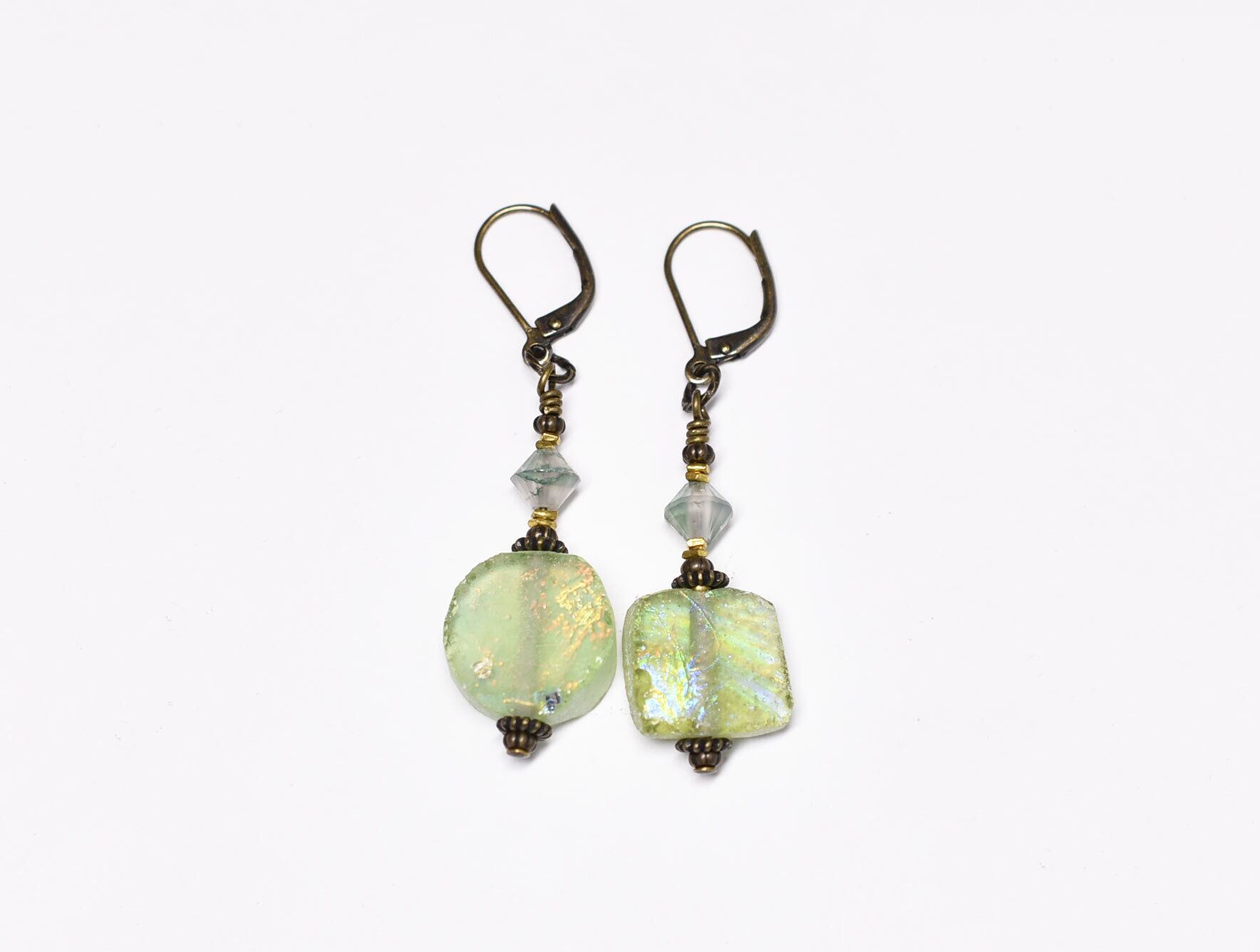 オリーブグリーン銀化ローマングラスとモスアゲートのピアス