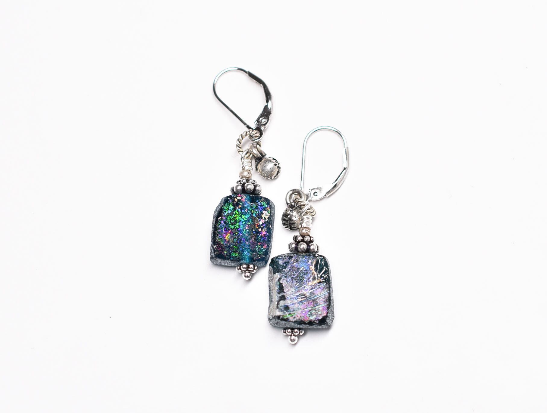 ブルーグリーン美しい銀化ローマングラスと小さなインドシルバー鈴のピアス