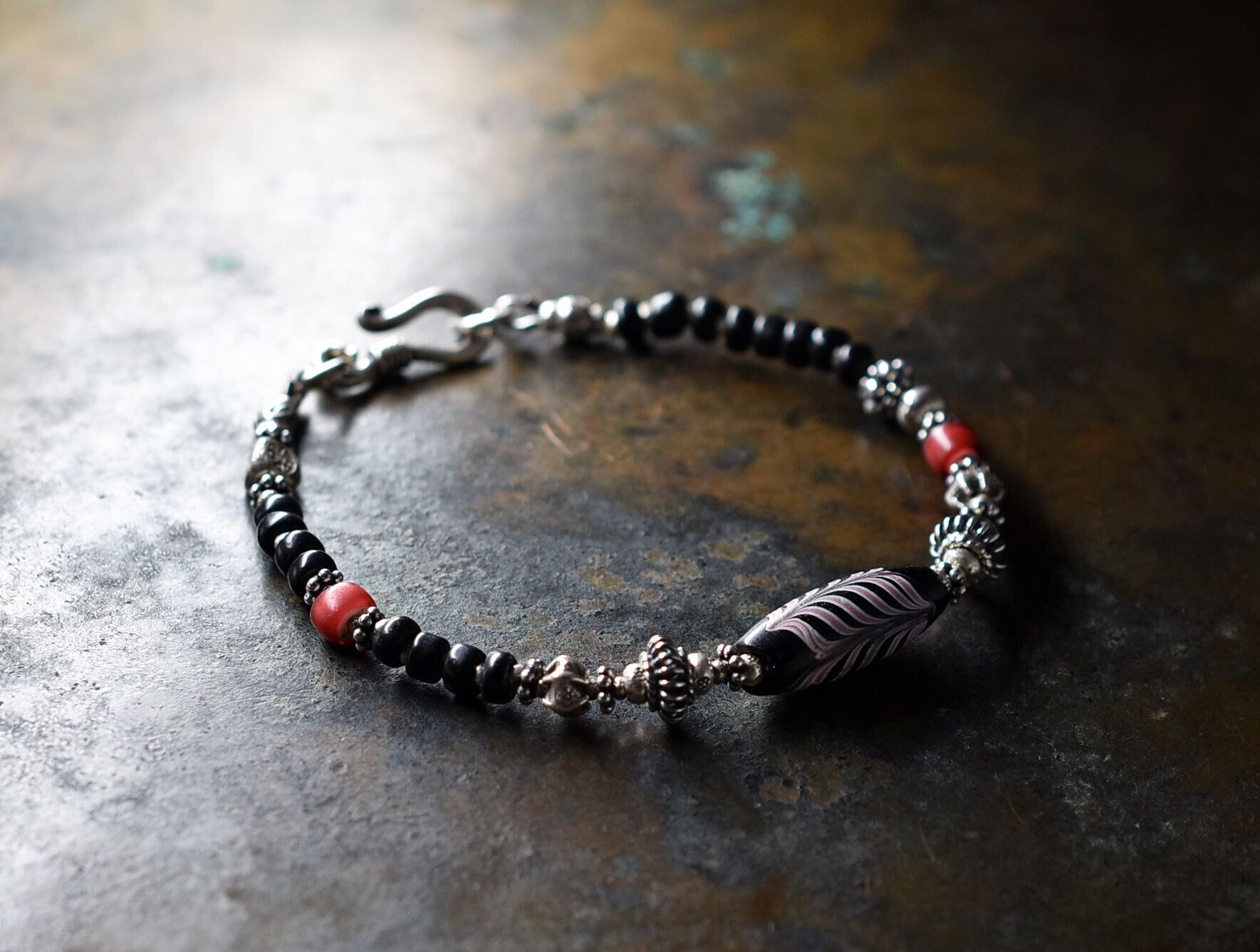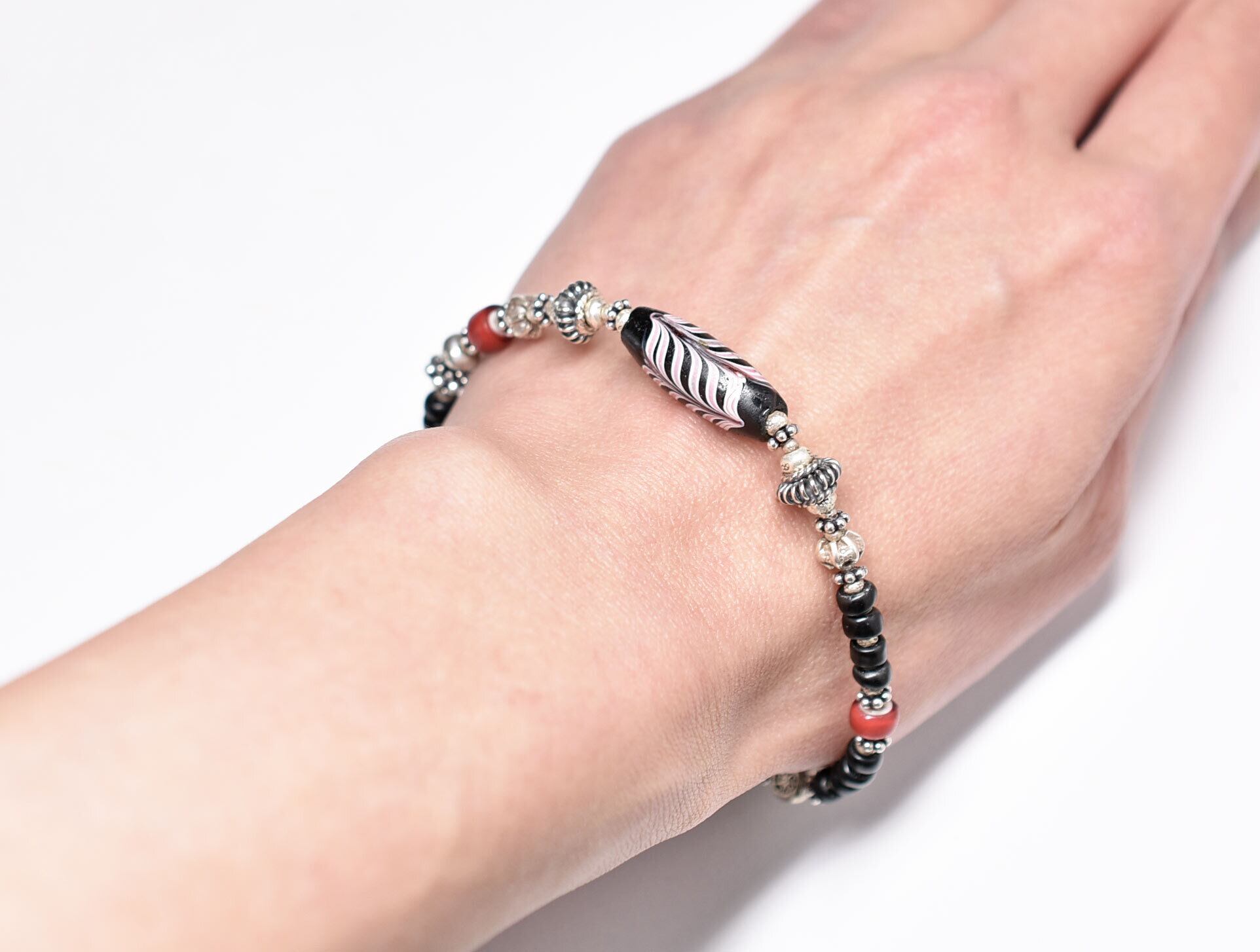 ブラックフェザービーズと多彩カレンシルバー、漆黒ビーズ、金赤ホワイトハーツを繋いだブレスです。