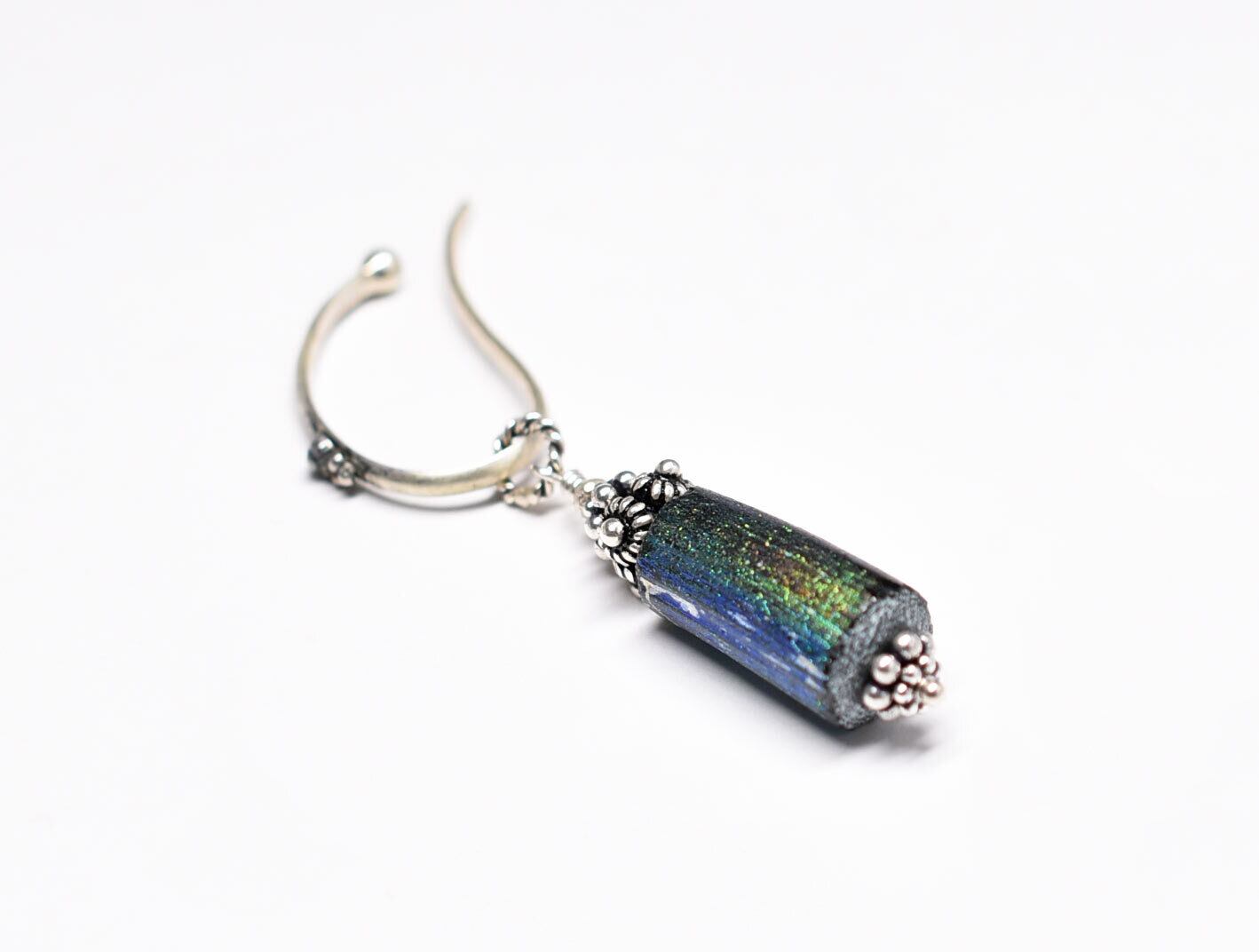 ブルーグリーン美しい銀化のローマングラスとシルバーパーツを繋いだインドシルバーのイヤーカフです。