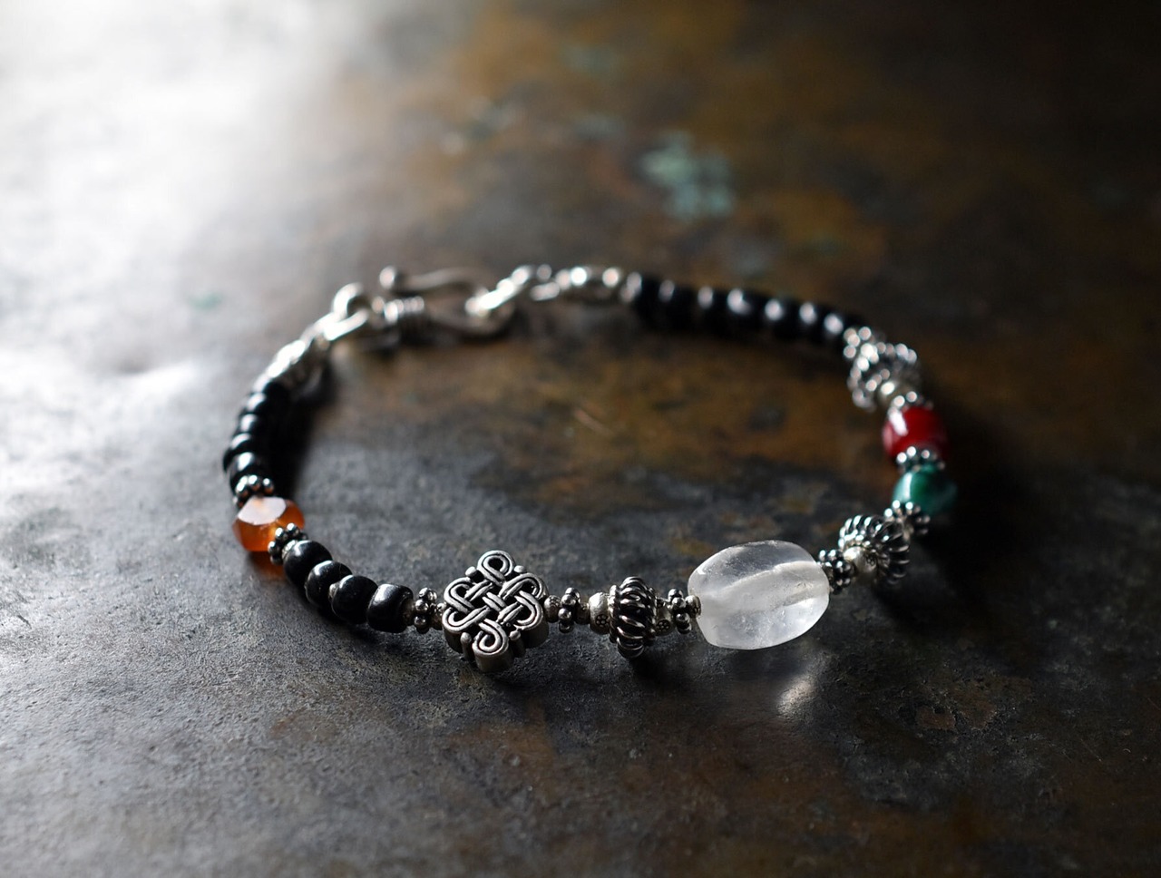 古代水晶とエンドレスノット、oldチベタンターコイズ、血赤ホワイトハーツ、古代カーネリアン、漆黒ビーズのブレス