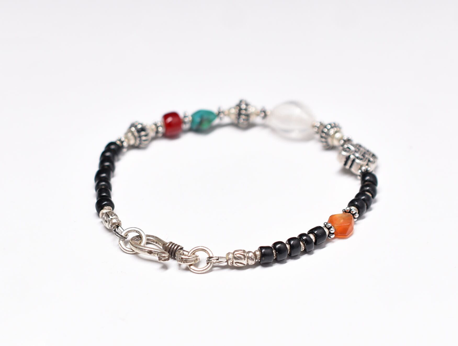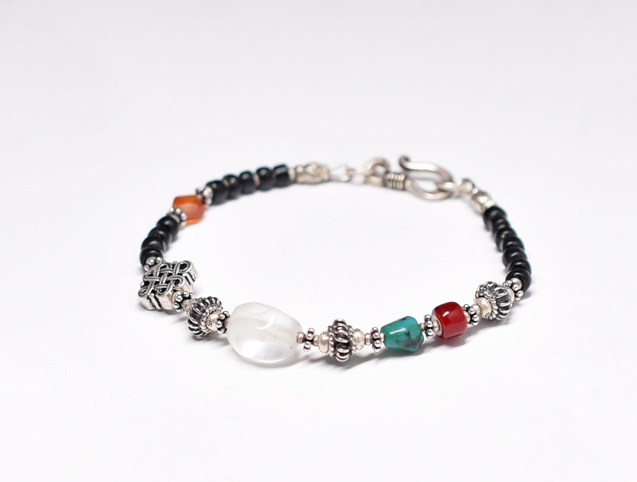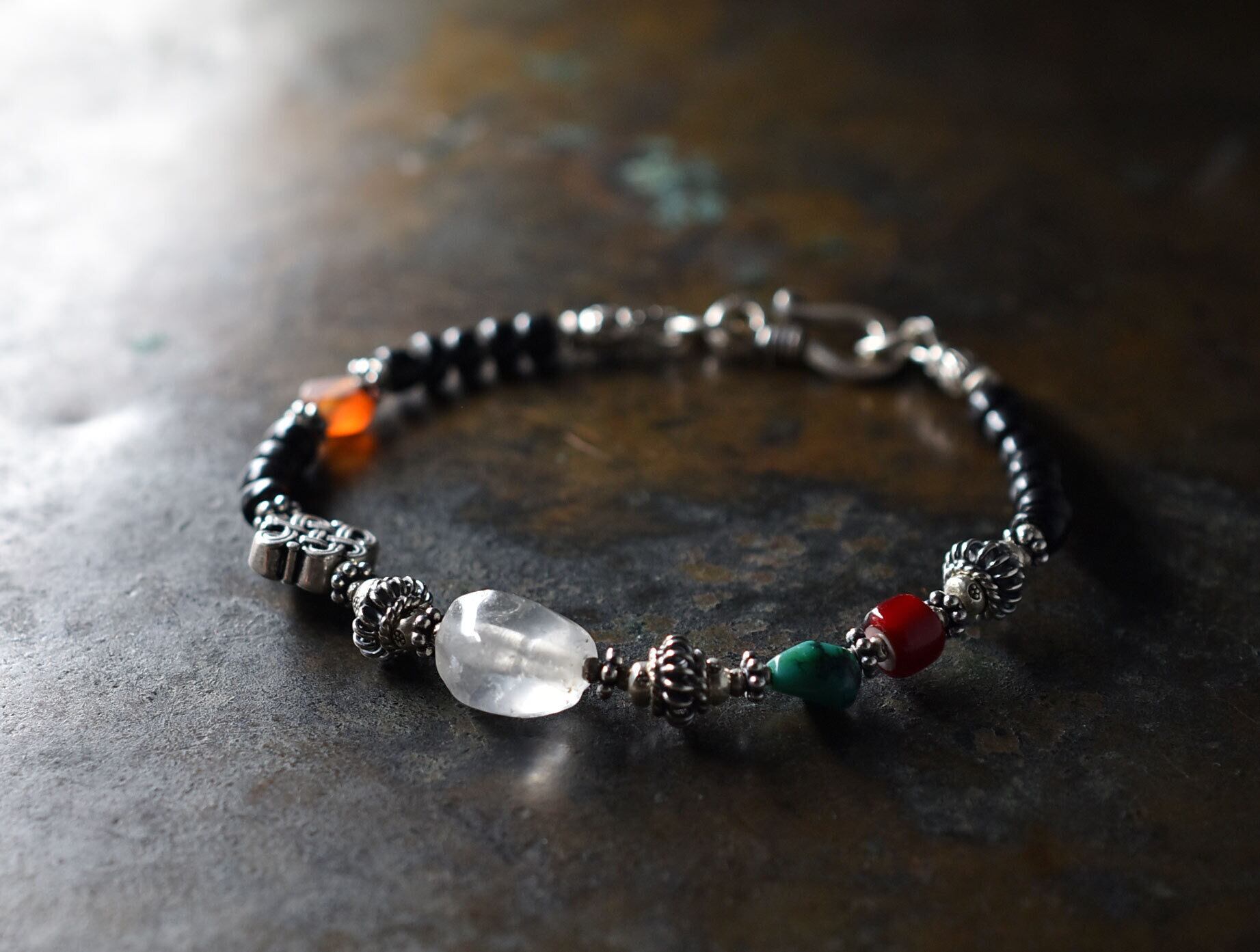 古代水晶とエンドレスノット、oldチベタンターコイズ、血赤ホワイトハーツ、古代カーネリアン、漆黒ビーズを繋いだブレスです。