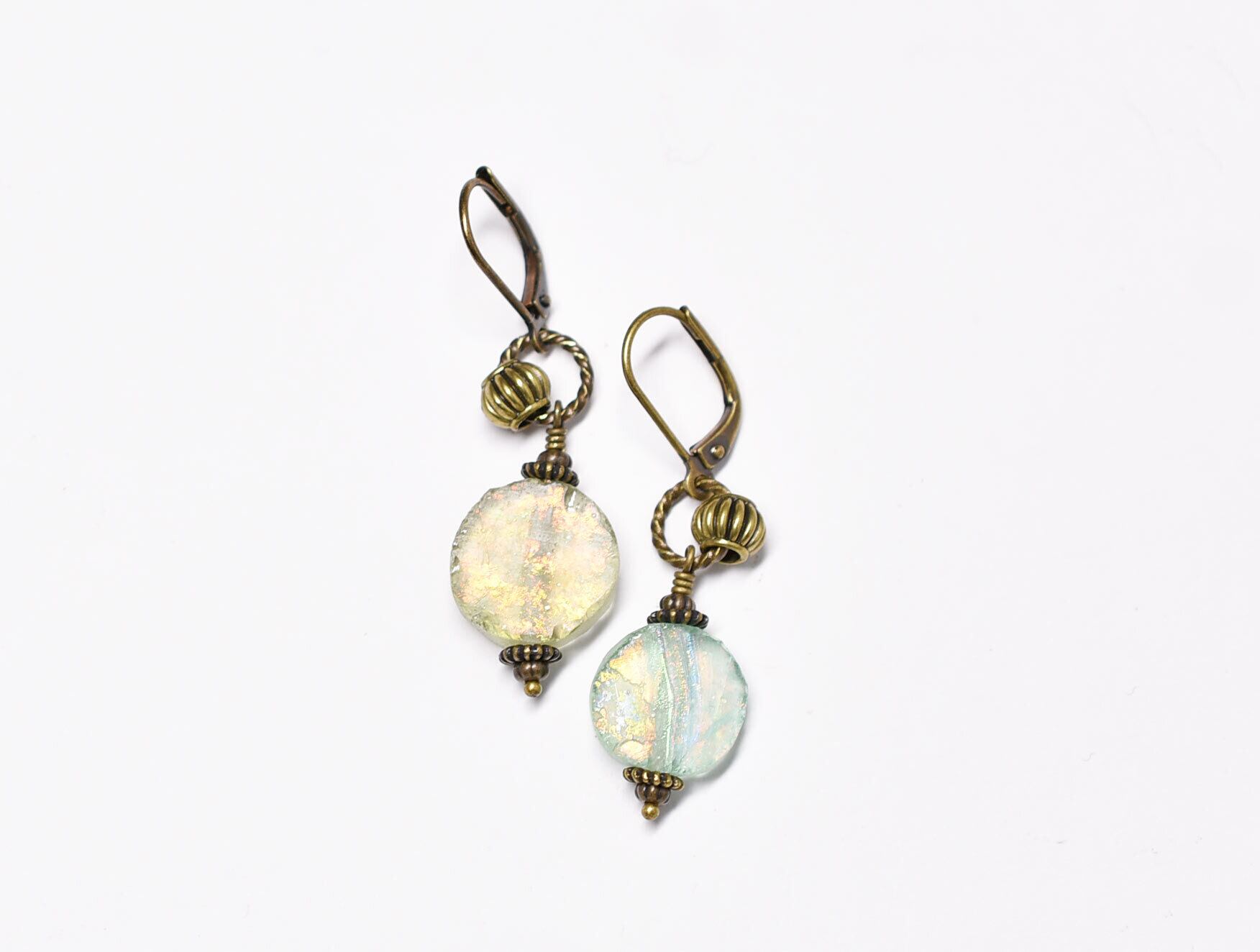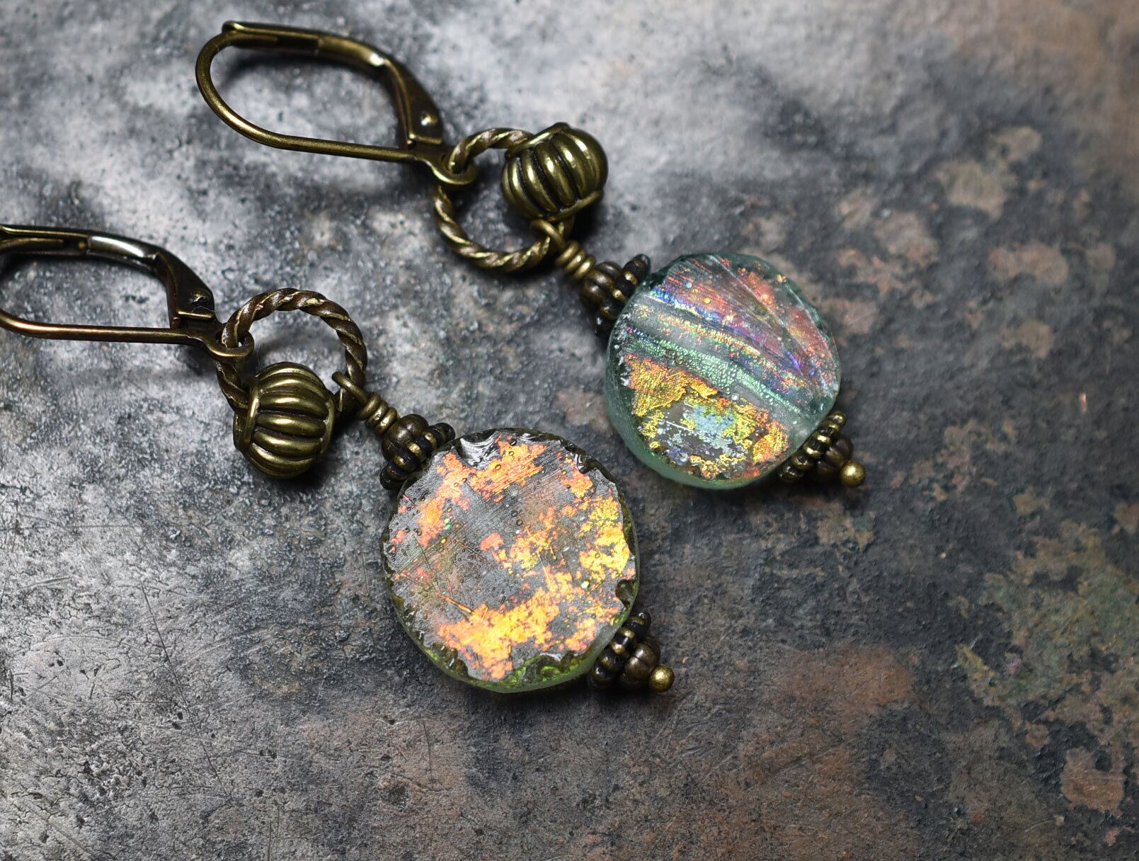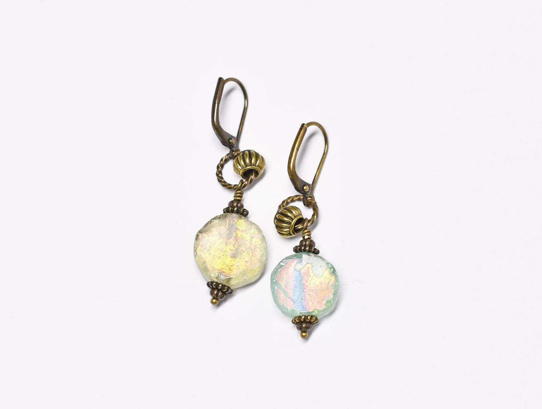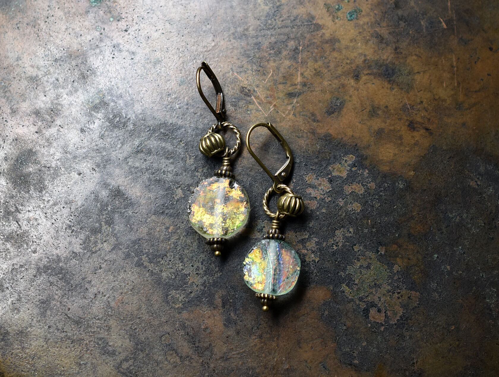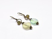 オリーブグリーン&イエロー銀化ローマングラスのピアス
