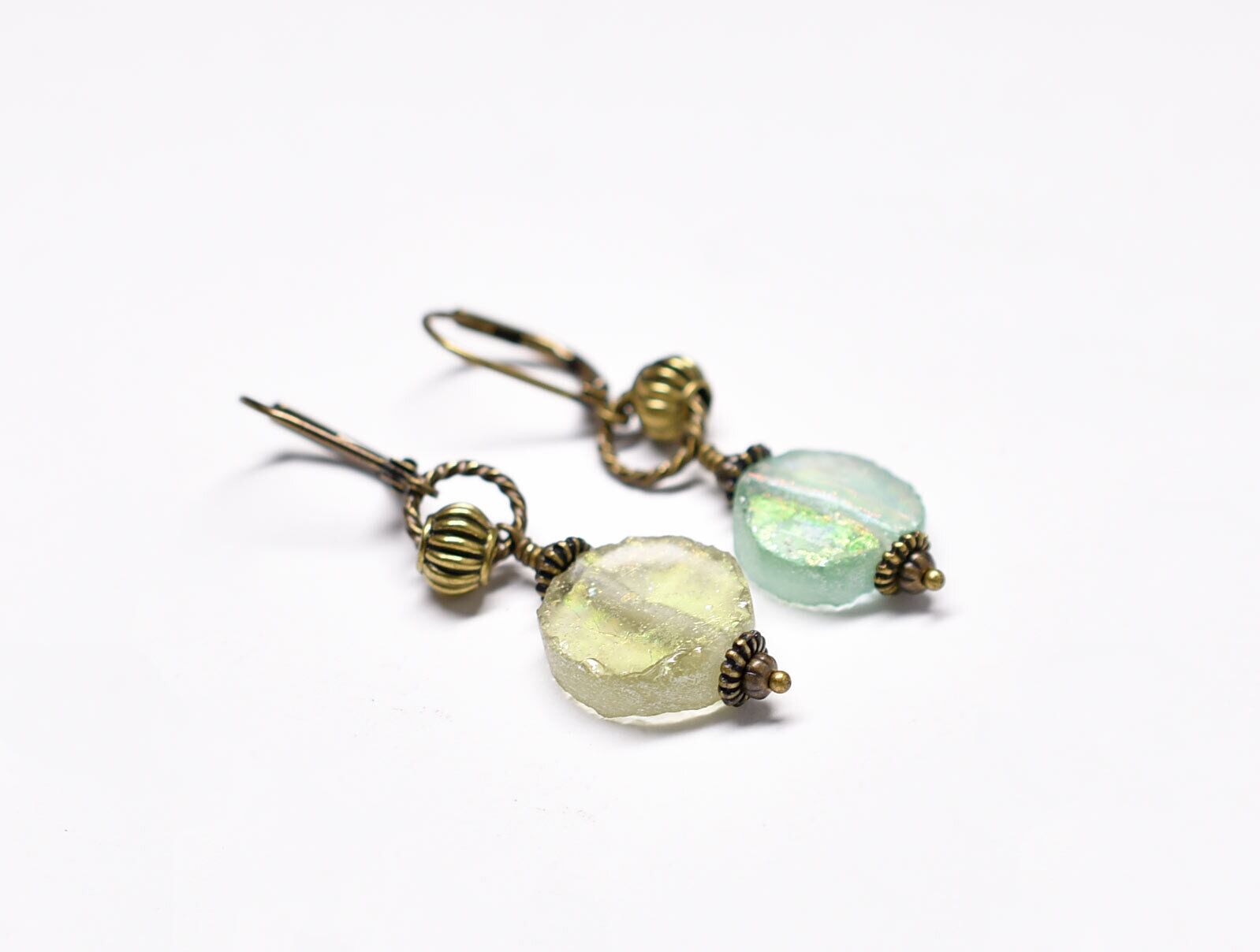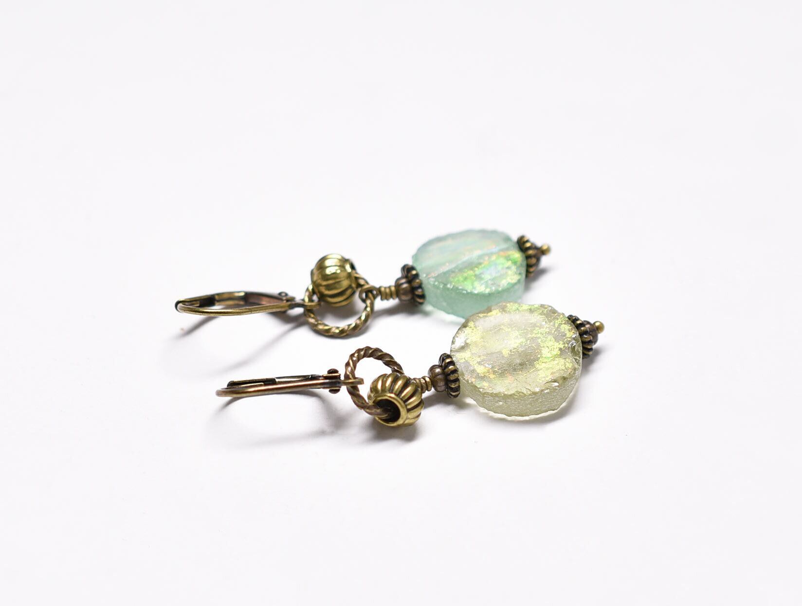 オリーブグリーン&イエローの銀化ローマングラスを繋いだピアスです。
