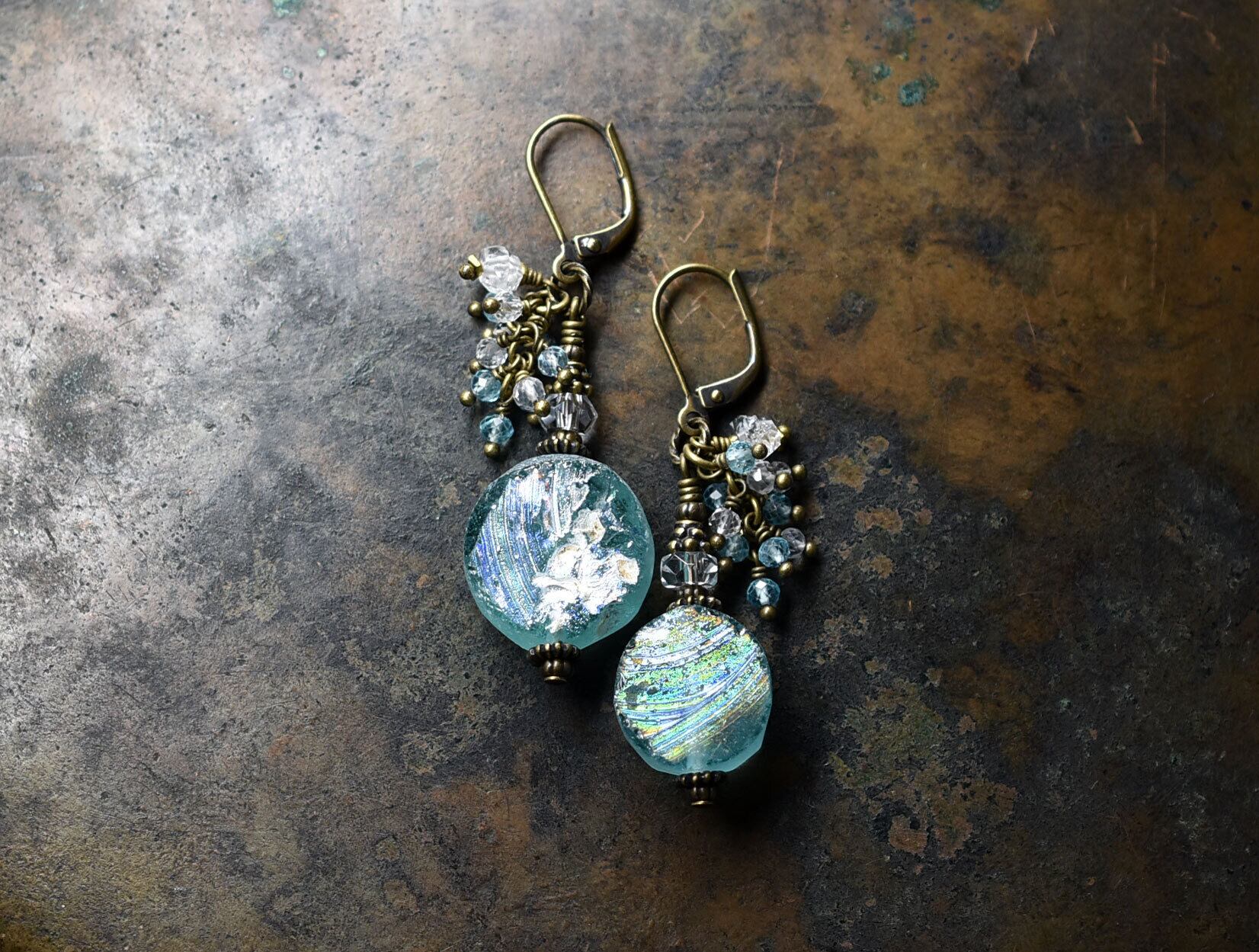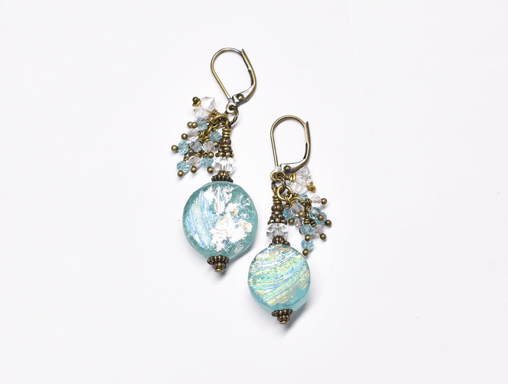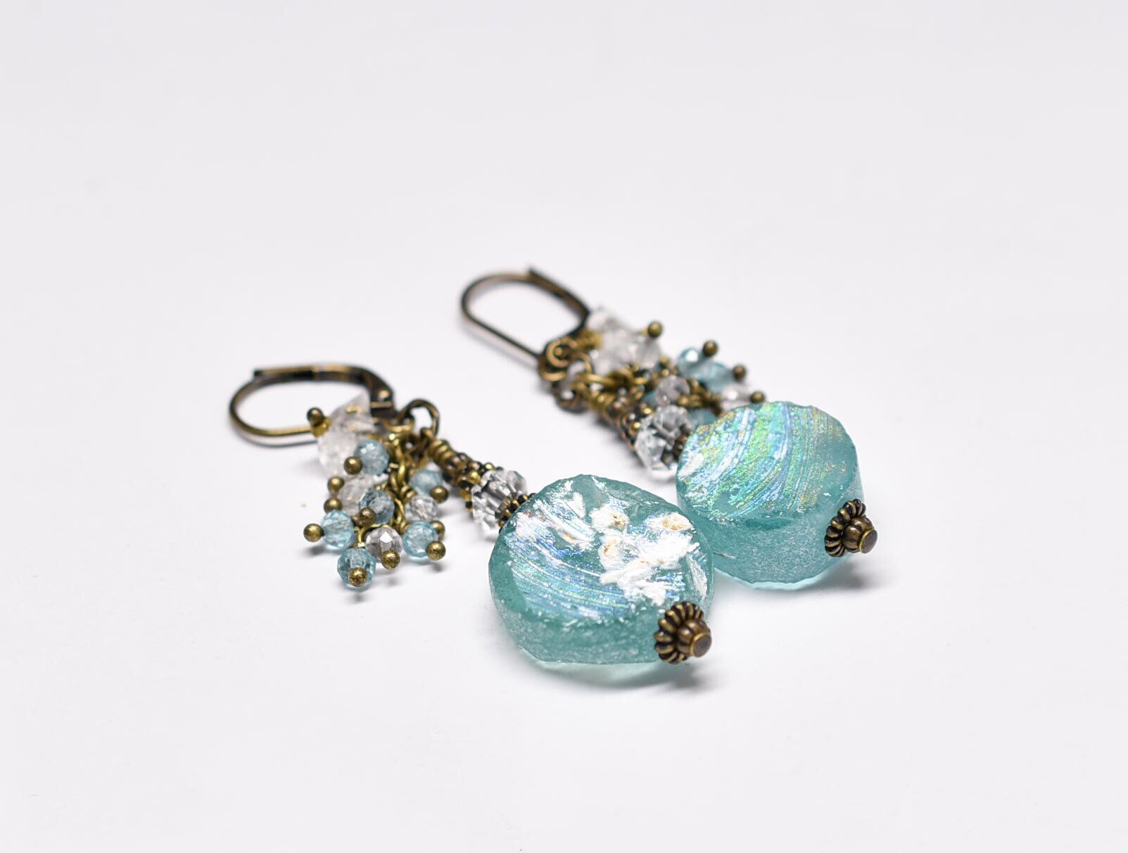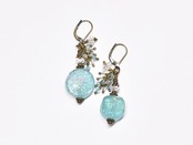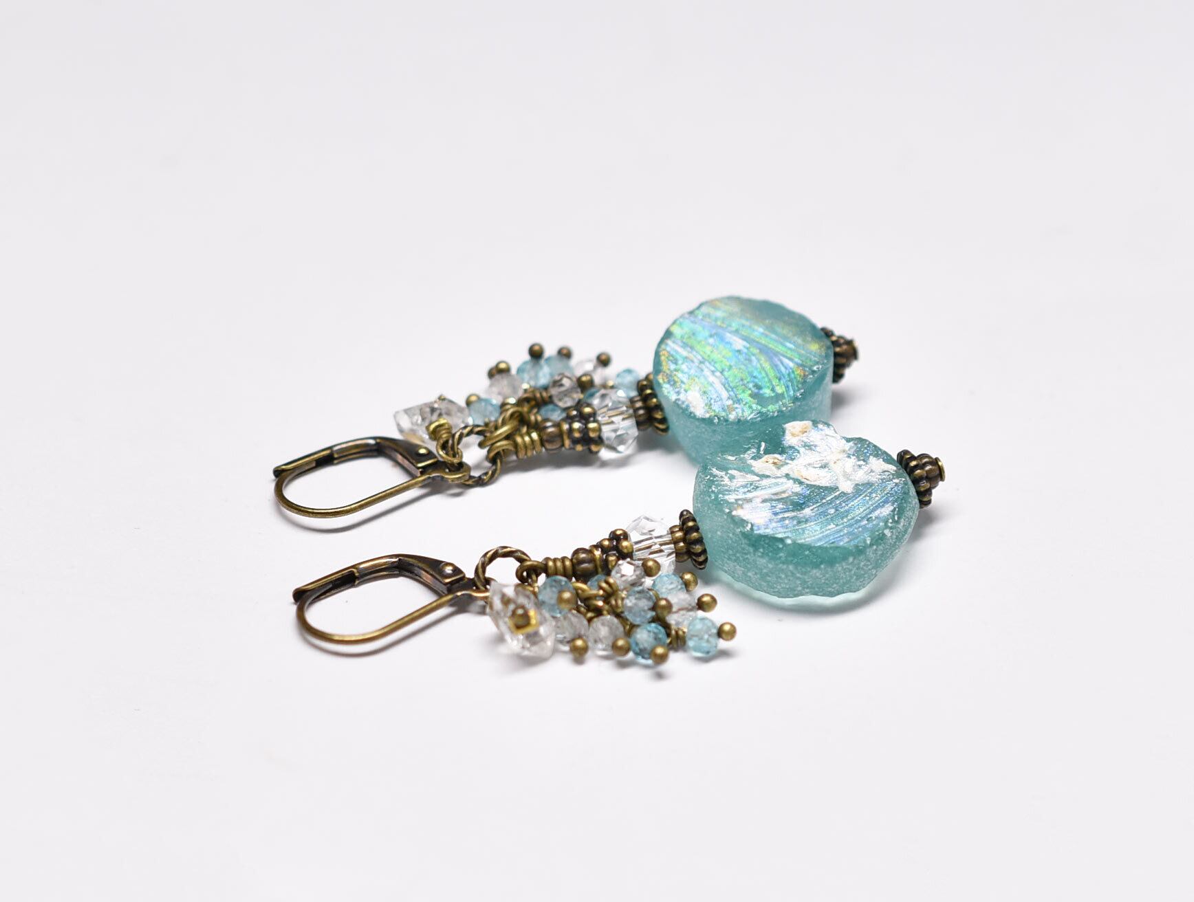 ソーダブルー銀化ローマングラスとたわわなアパタイト、クォーツ、ハーキマーダイヤモンドを繋いだピアスです。