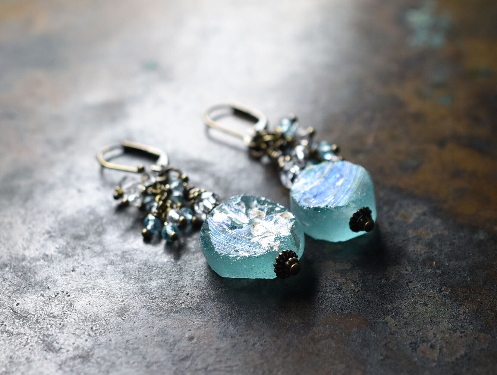 古代ガラスと天然石の美しさを楽しめるのピアスです。