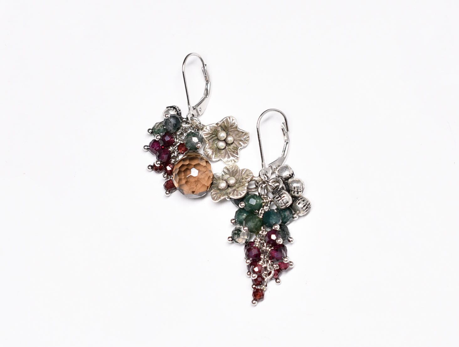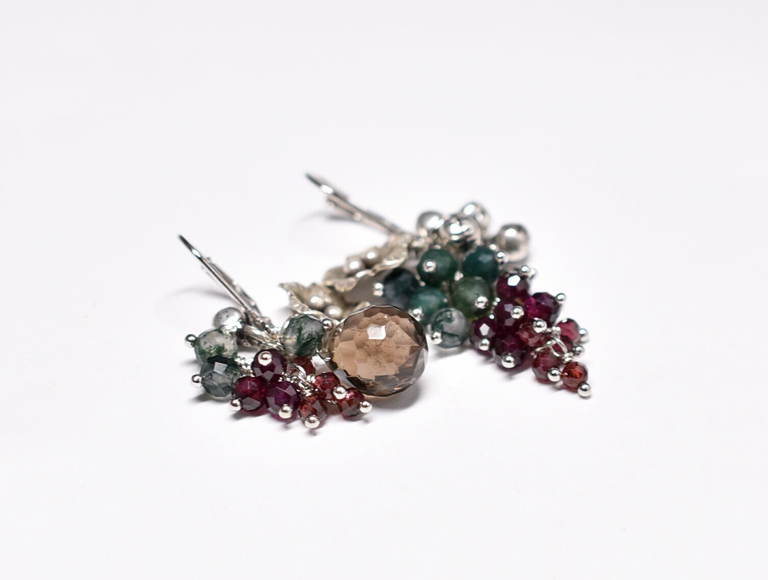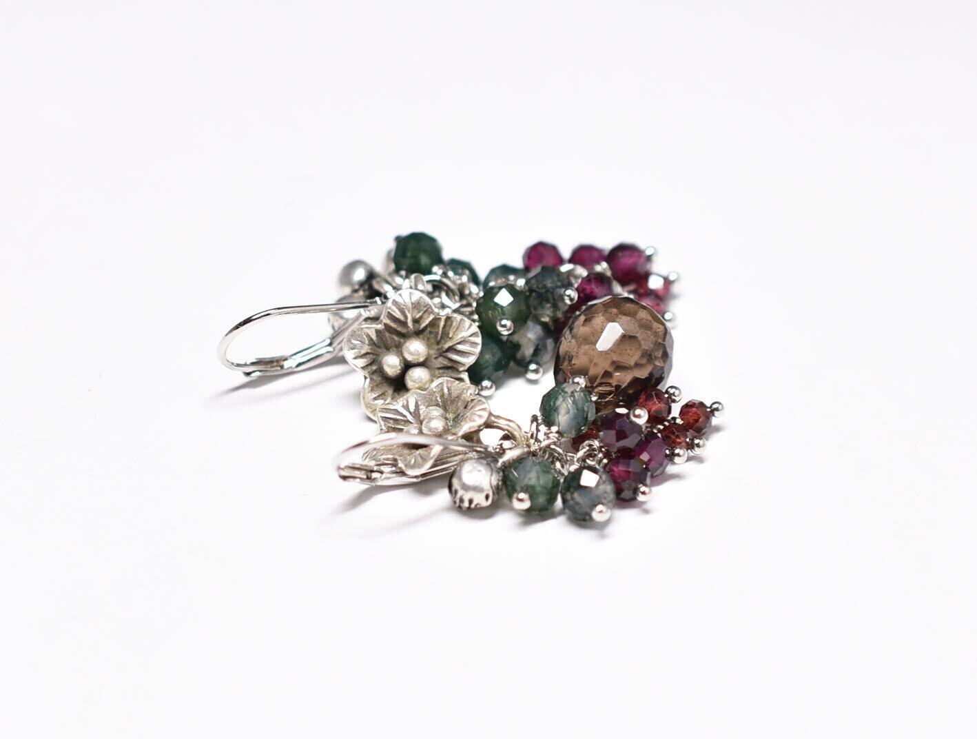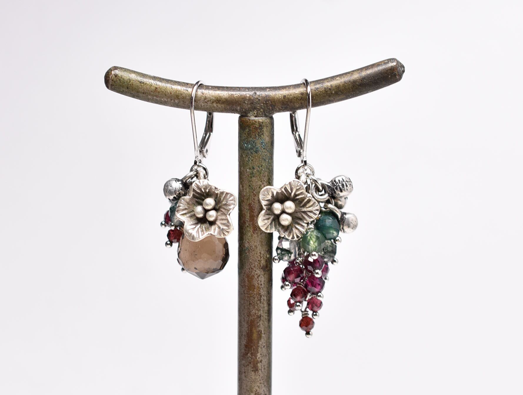 ぽってりとしたスモーキークォーツとたわわなガーネット、モスアゲート、カレンシルバーお花、鈴を繋いだアンシメトリーなピアスです。
